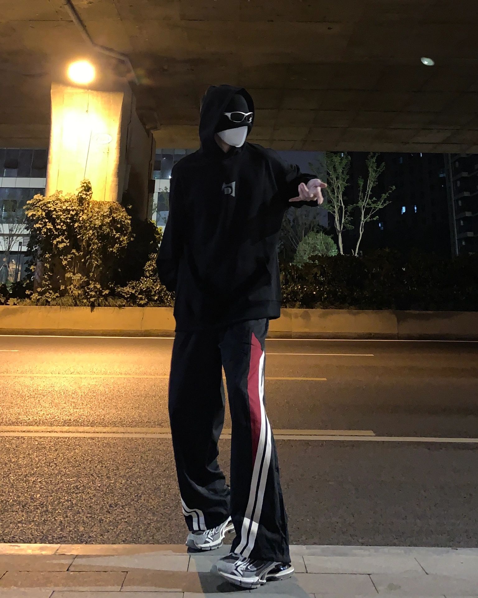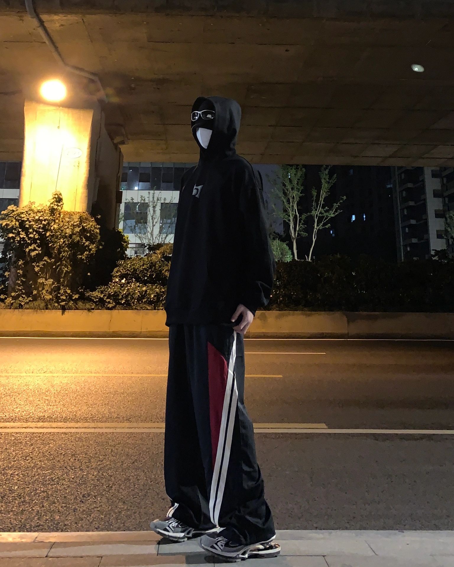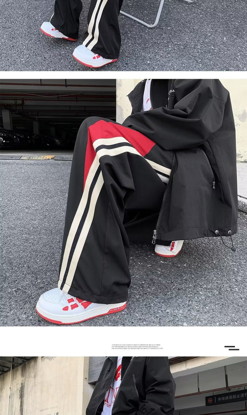 黑紅拼色設計感褲子男款春秋潮牌痞帥炸街闊腿褲高個子加長休閒褲