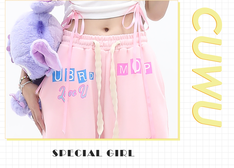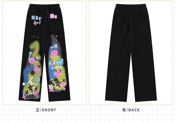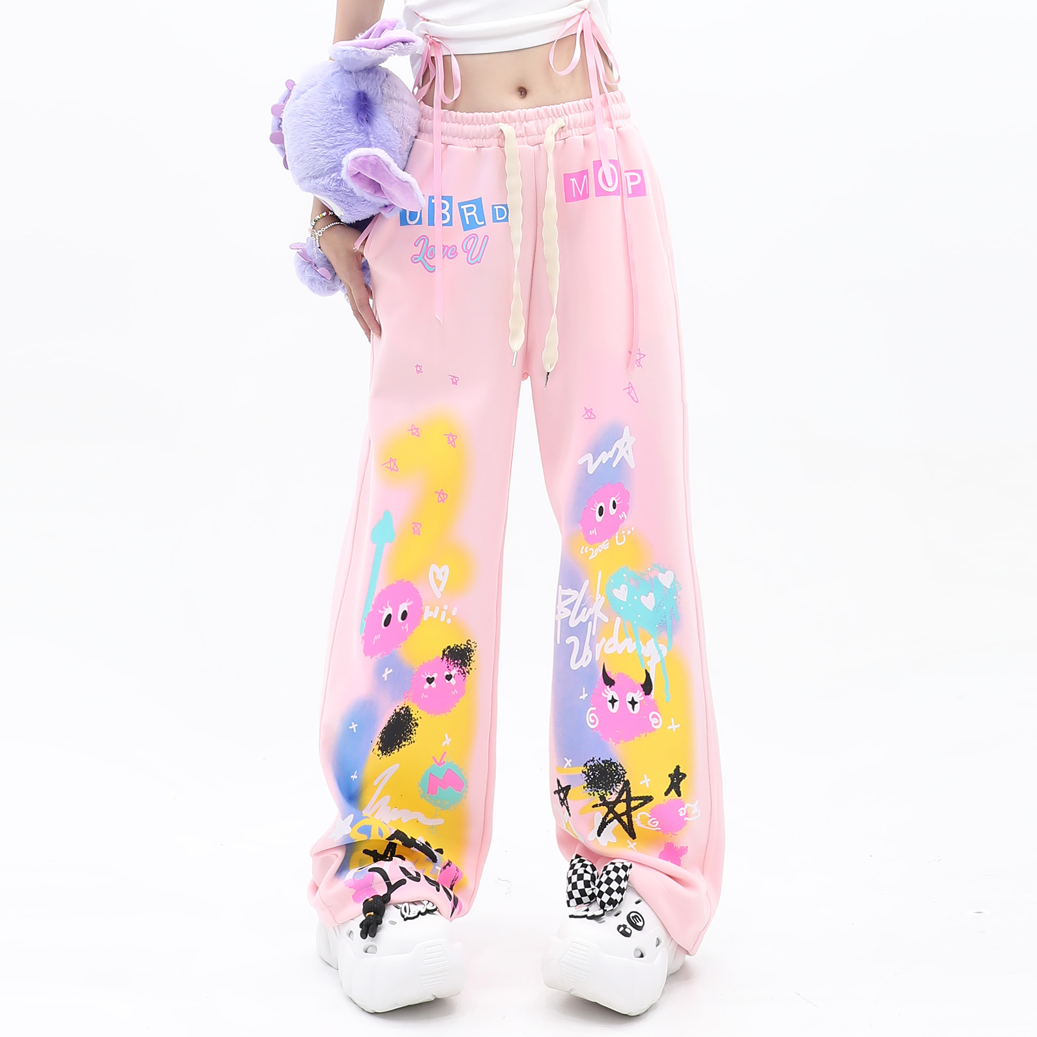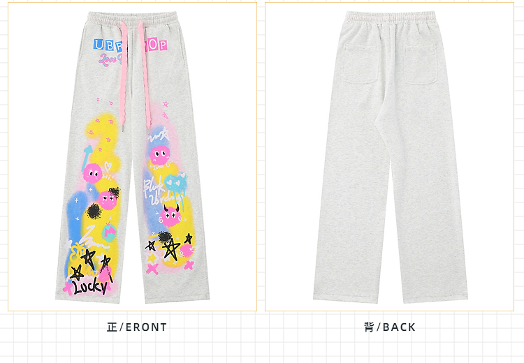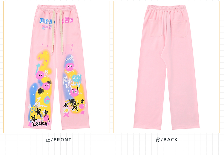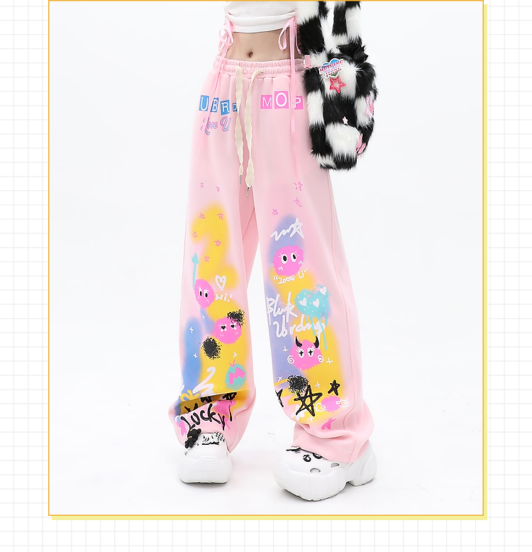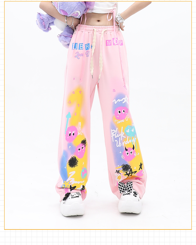 cuwu夏日多巴胺穿搭褲子女夏季粉色塗鴉高腰寬褲直筒褲休閒長褲
