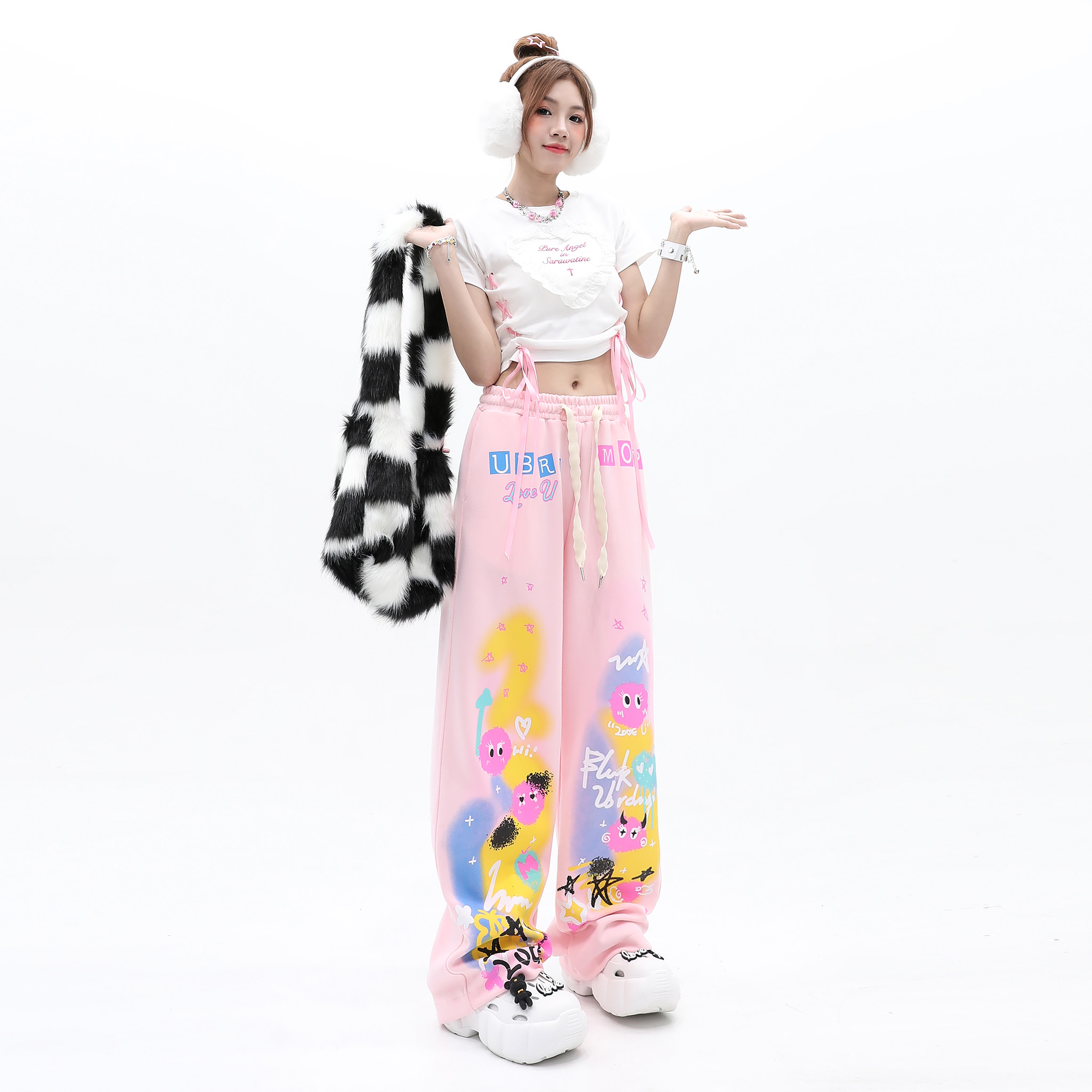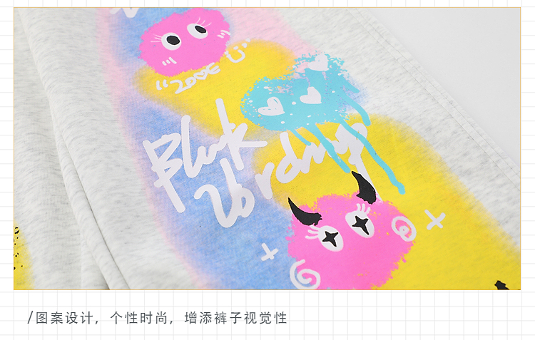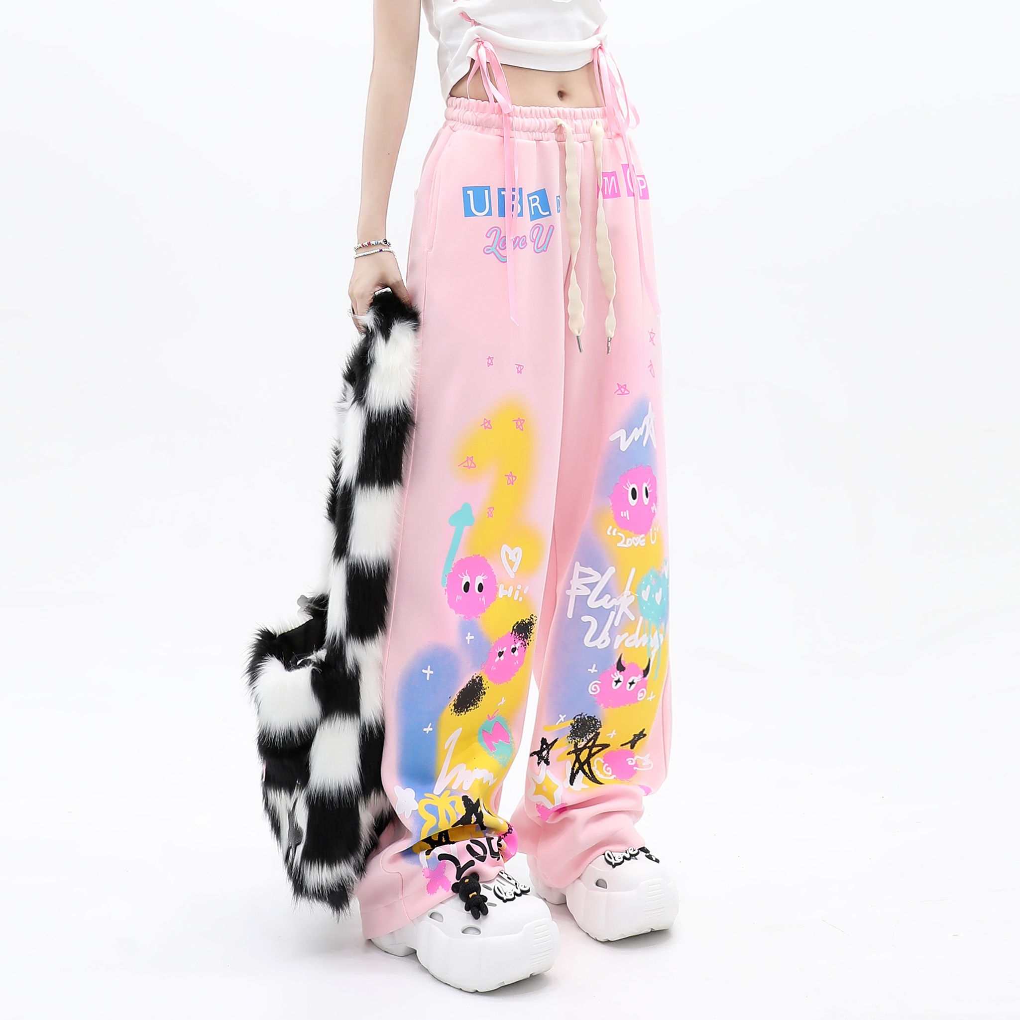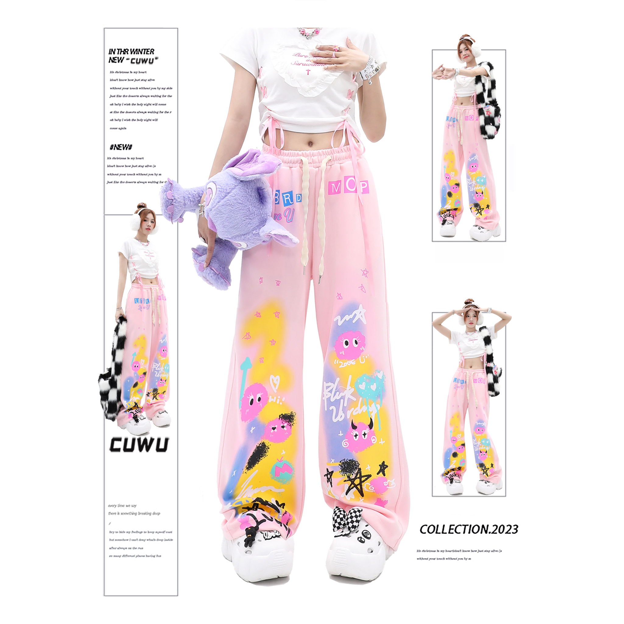 cuwu夏日多巴胺穿搭褲子女夏季粉色塗鴉高腰寬褲直筒褲休閒長褲