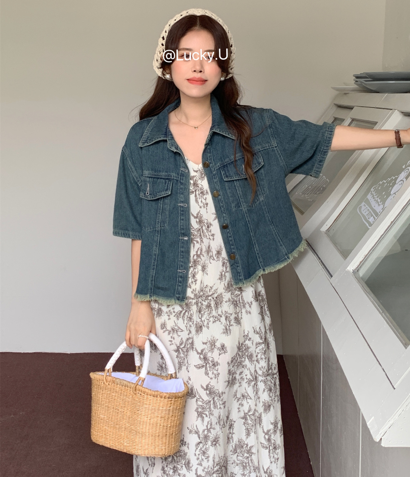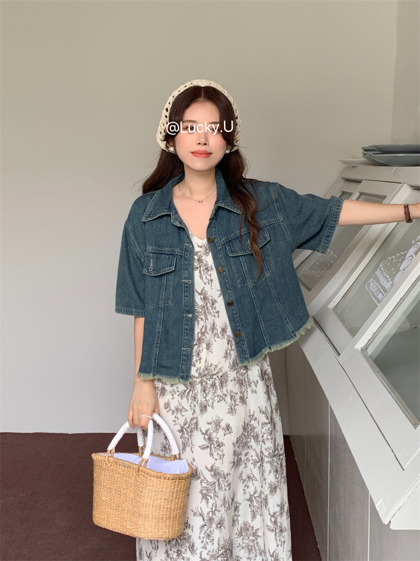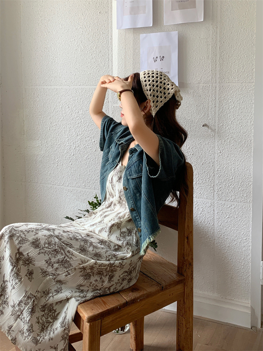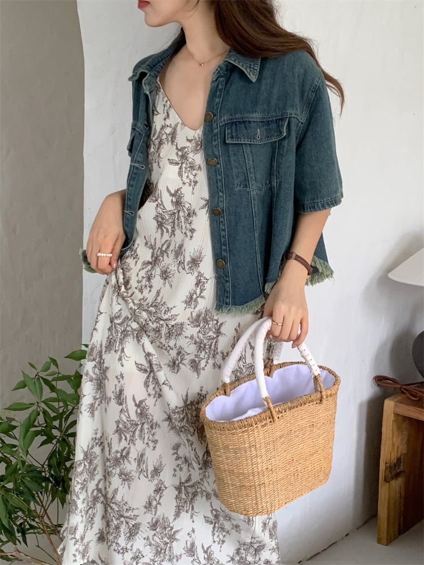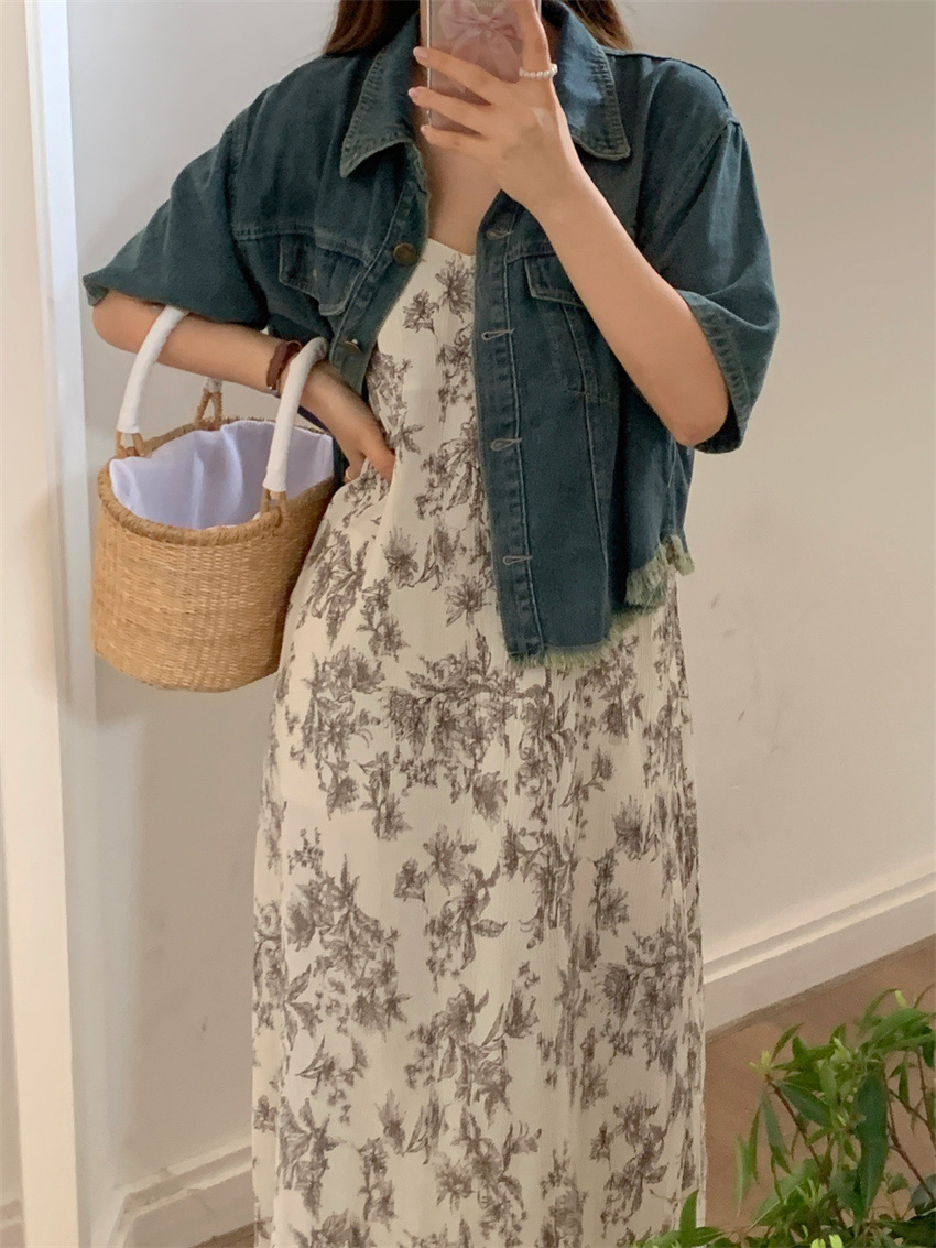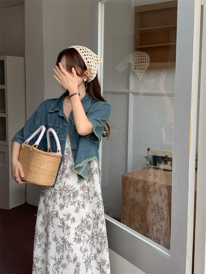 实拍 复古毛边牛仔短袖外套+法式碎花吊带连衣裙两件套装女装新款