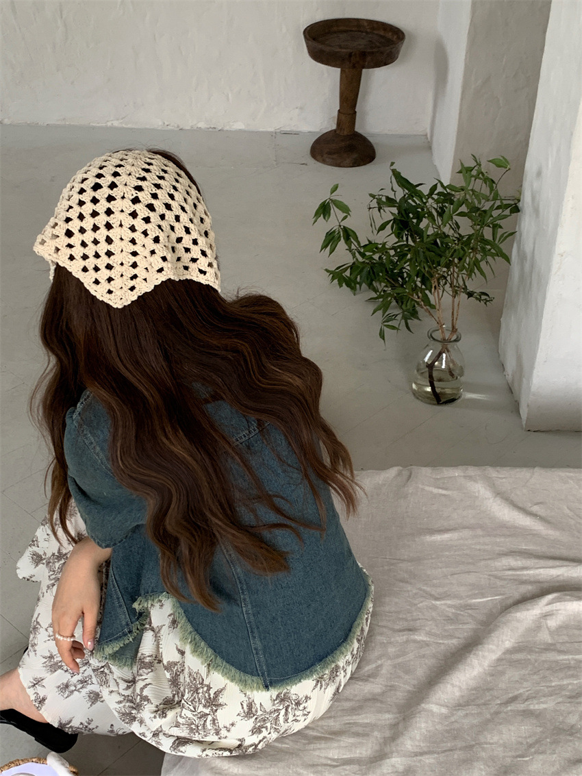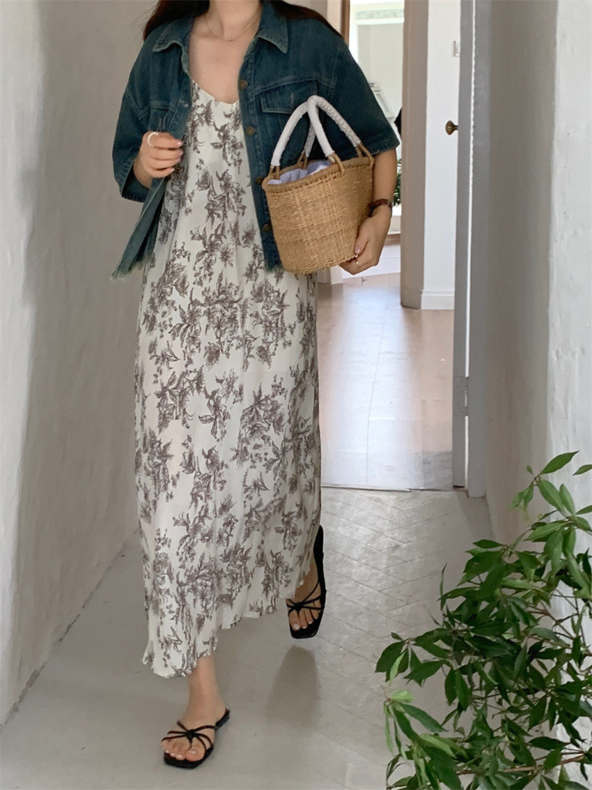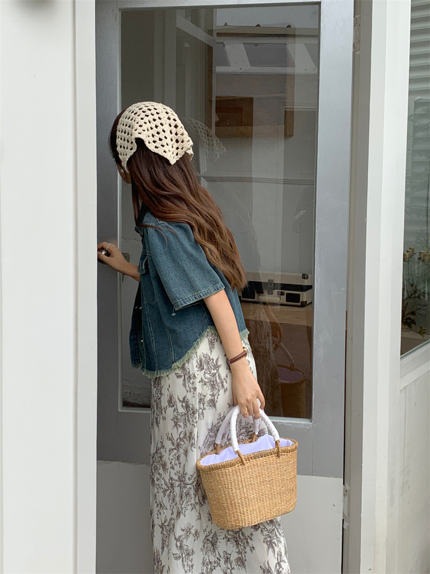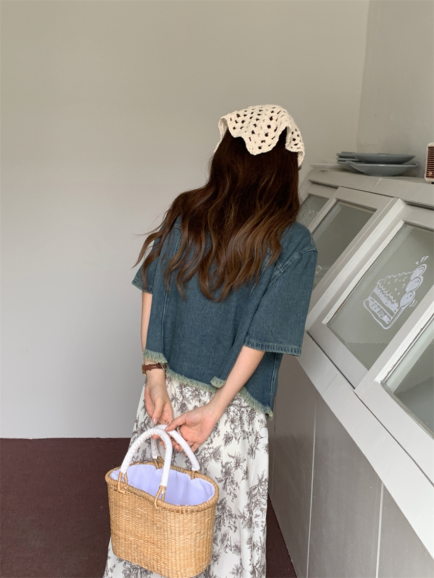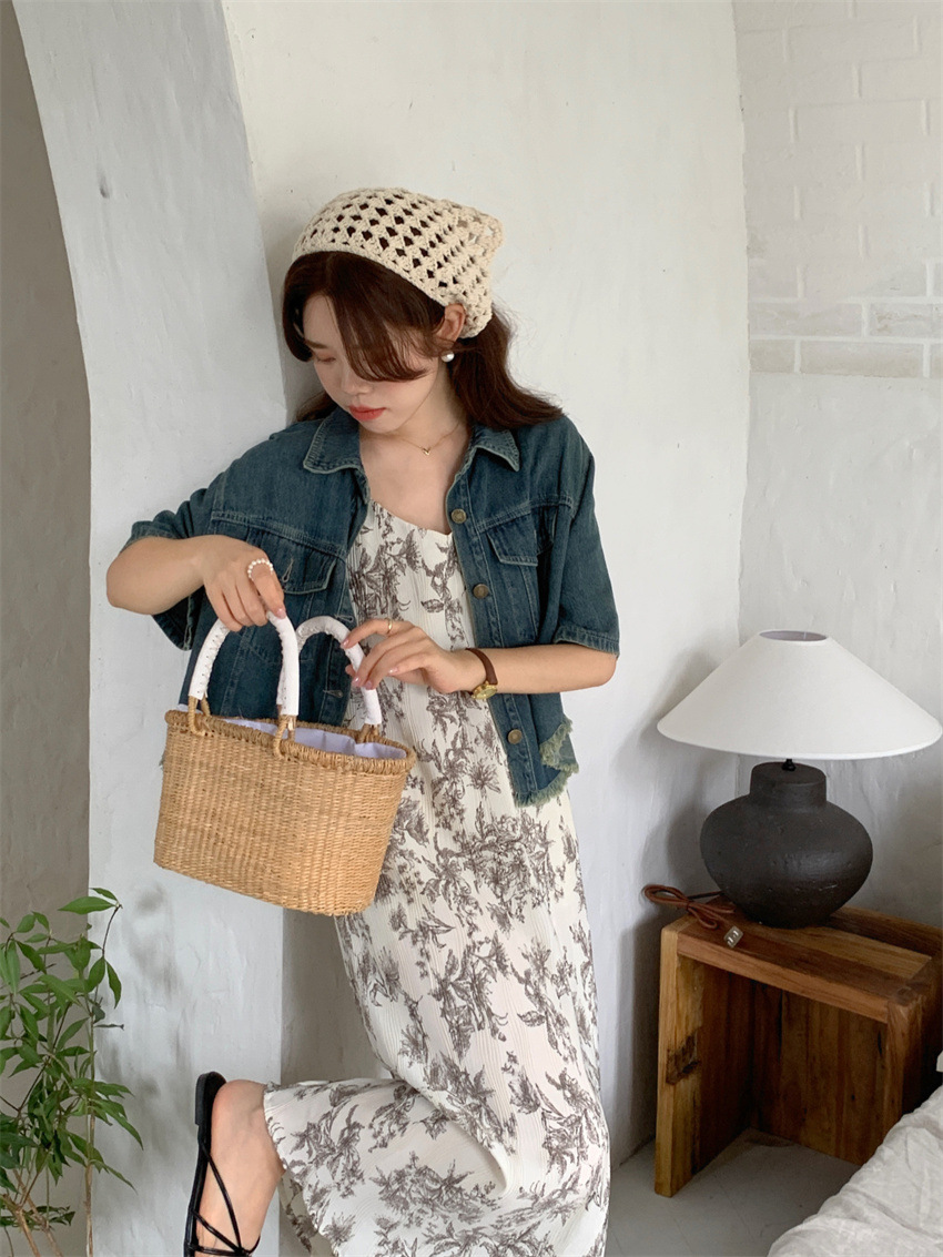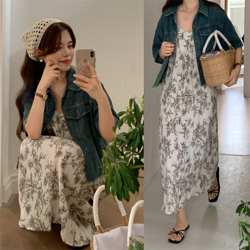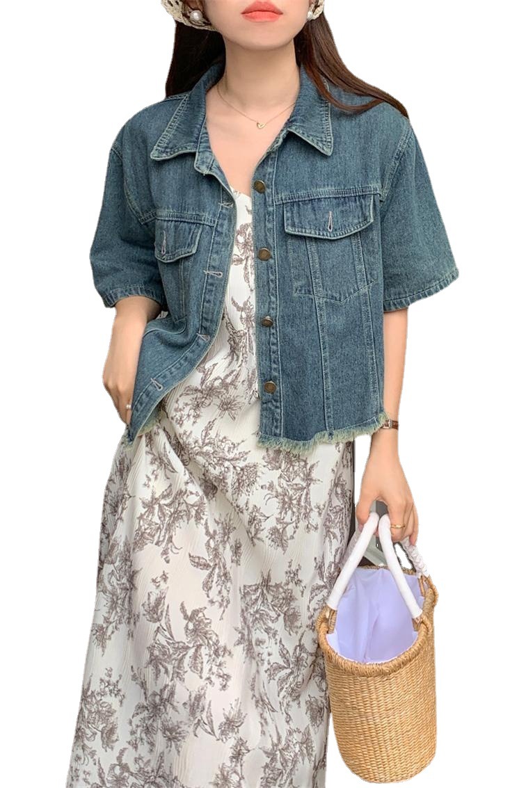 实拍 复古毛边牛仔短袖外套+法式碎花吊带连衣裙两件套装女装新款