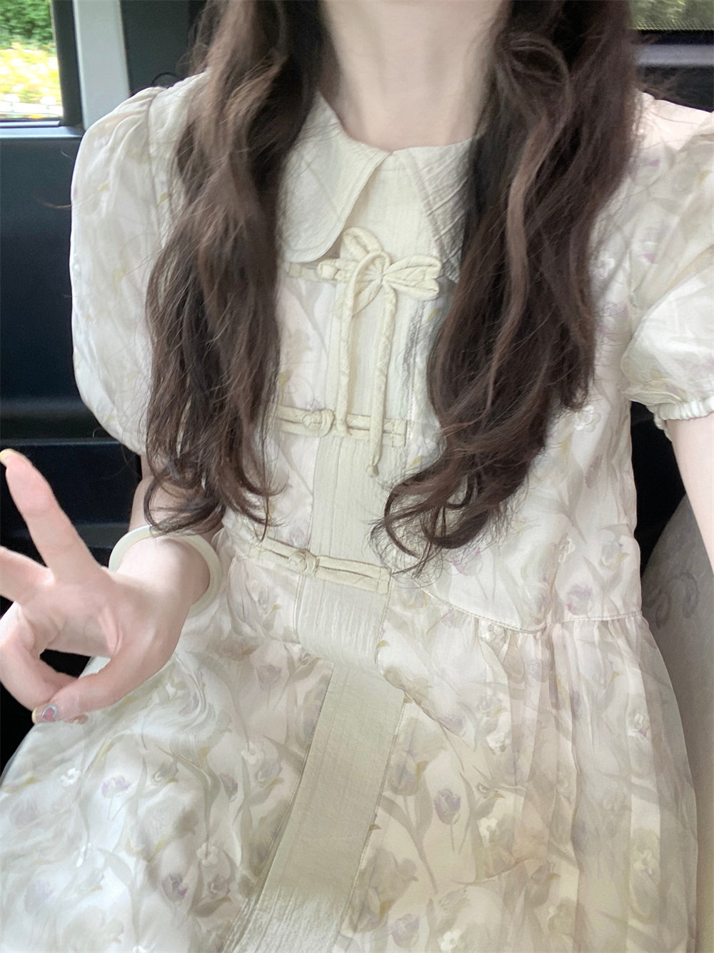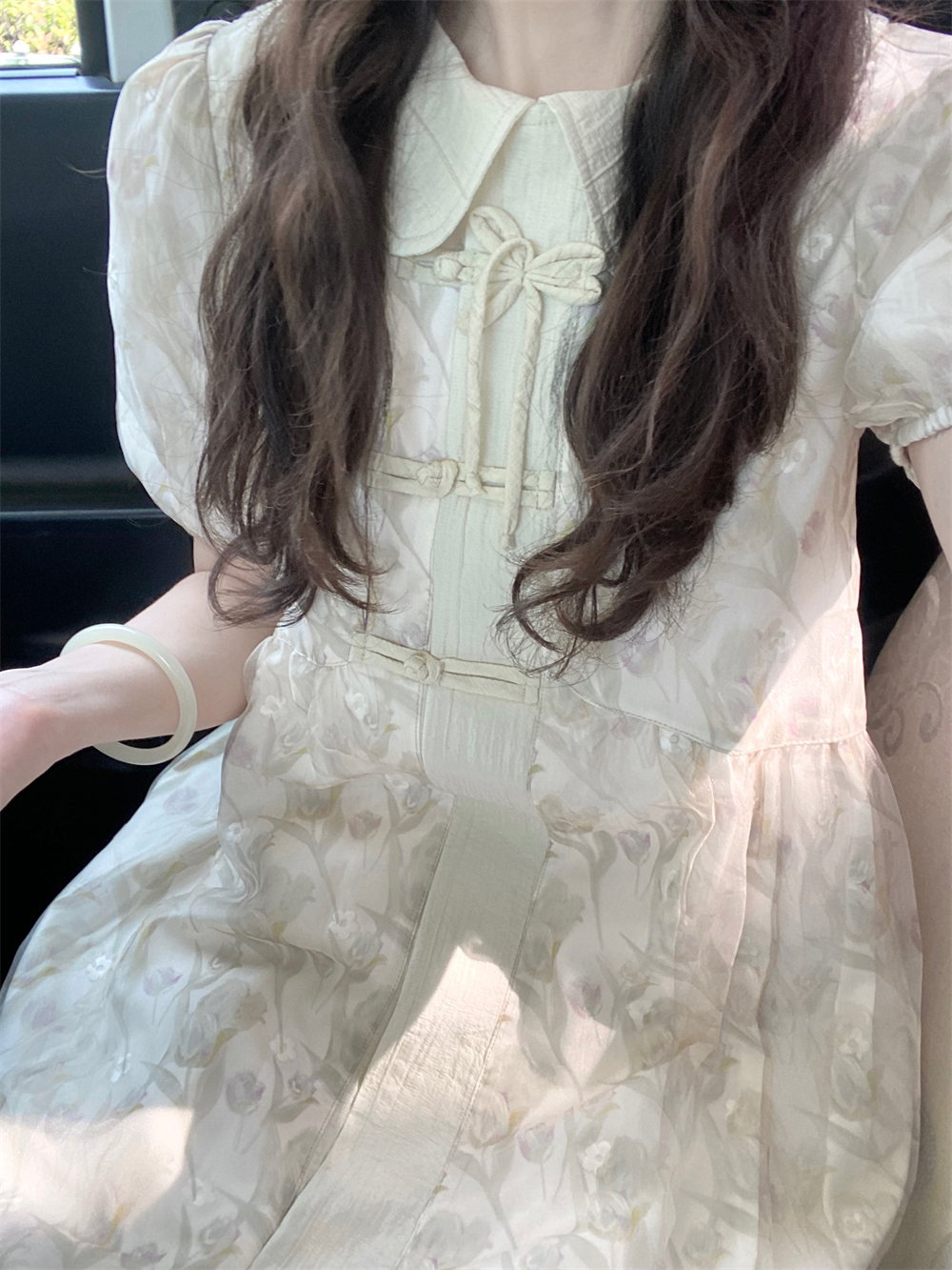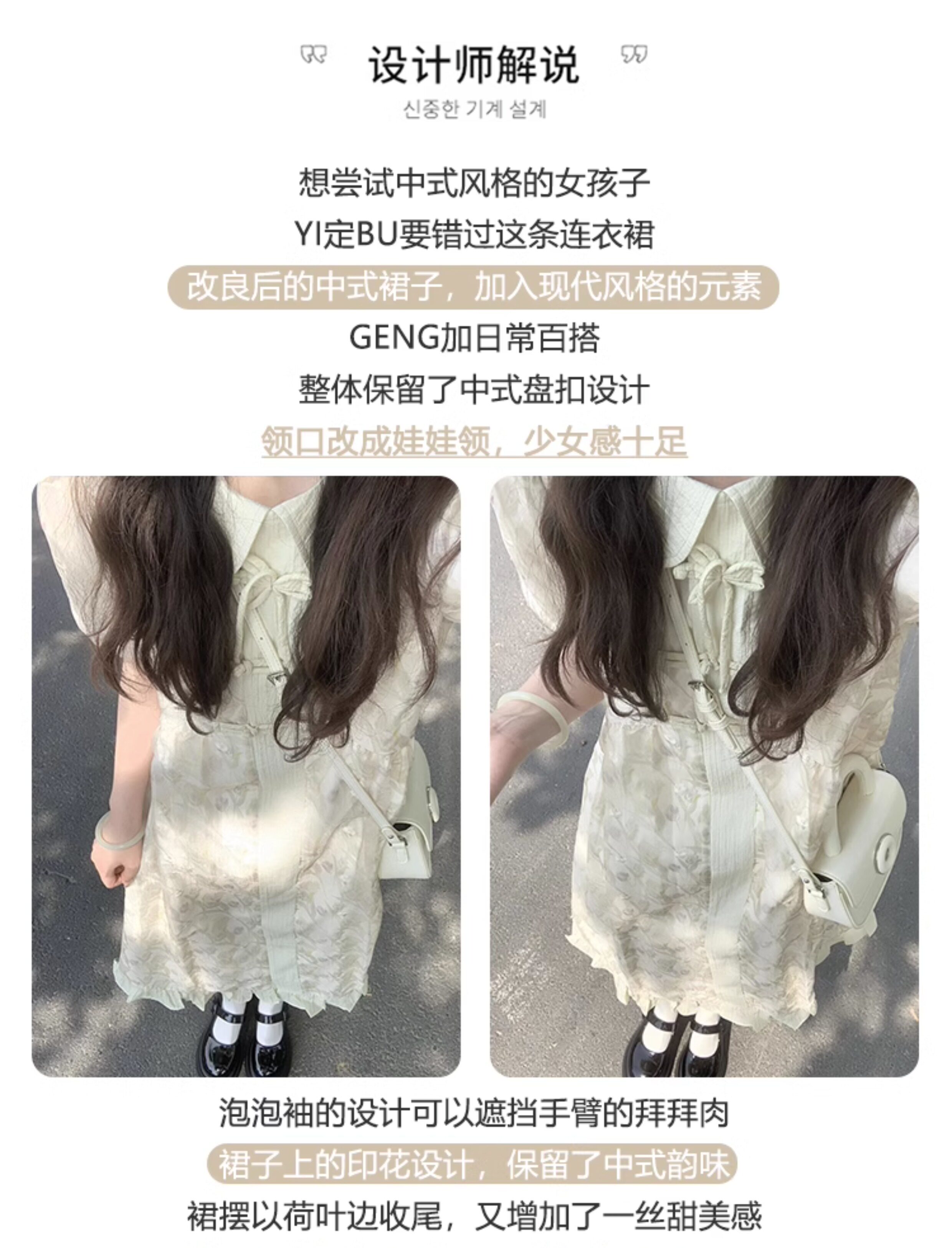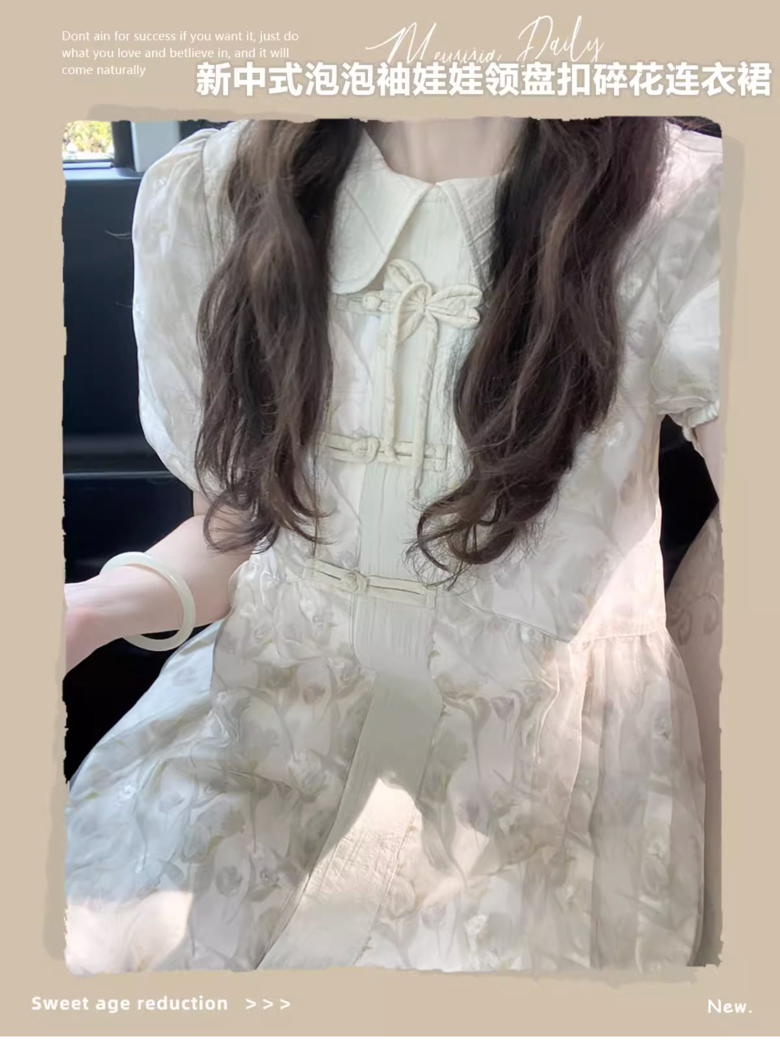 新中式國風泡泡袖木耳邊拼接盤扣碎花洋裝夏小個子高腰氣質長裙