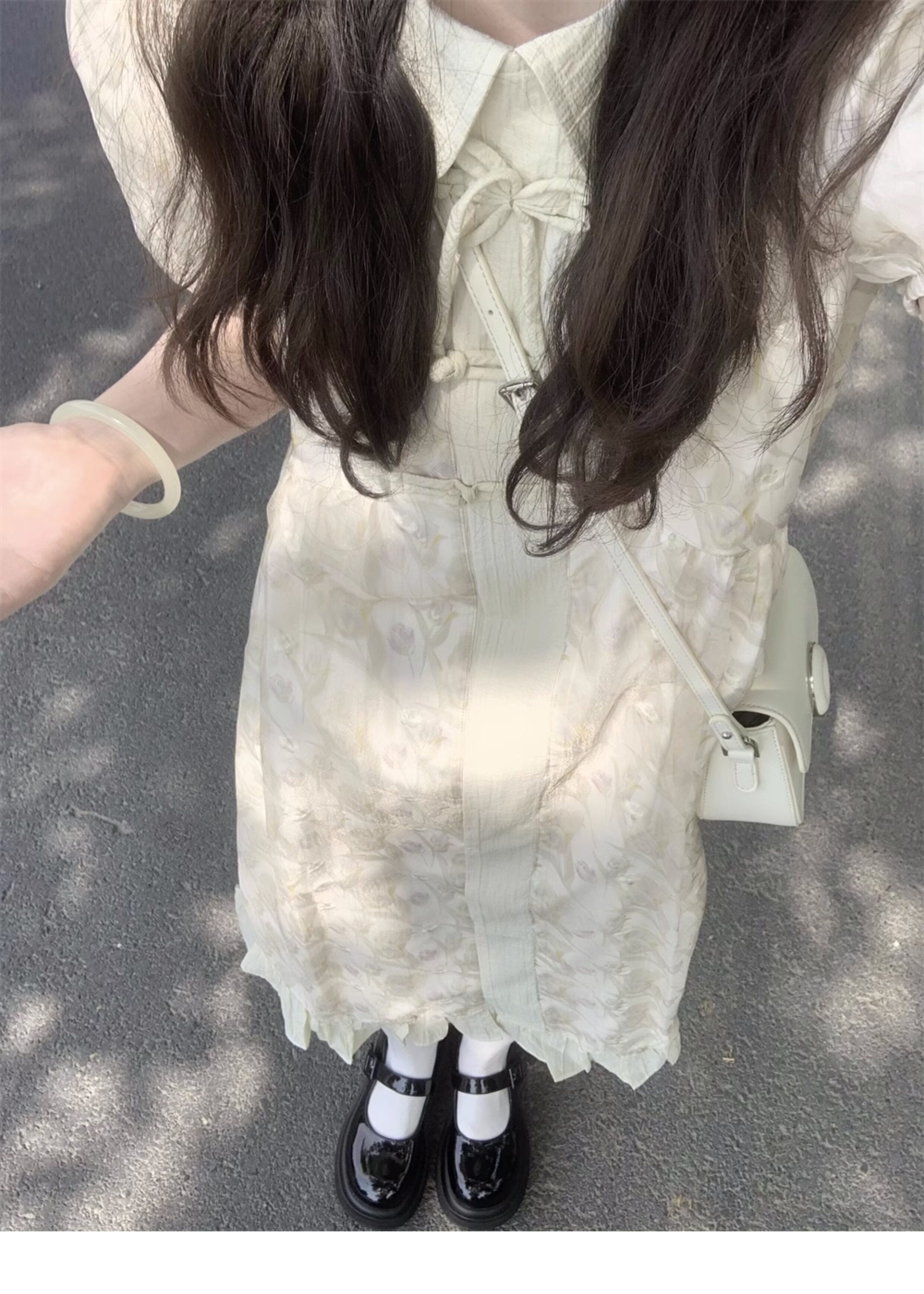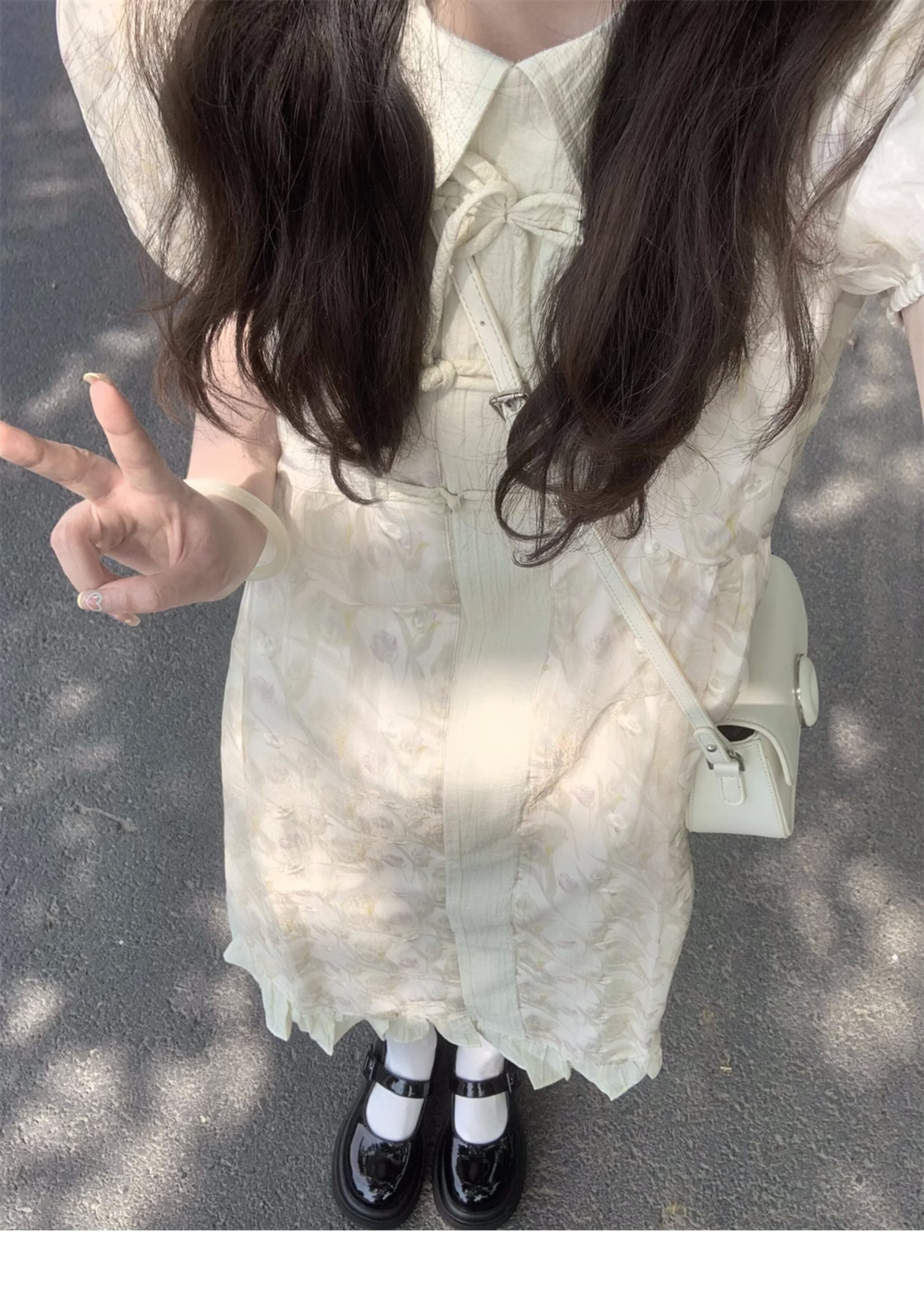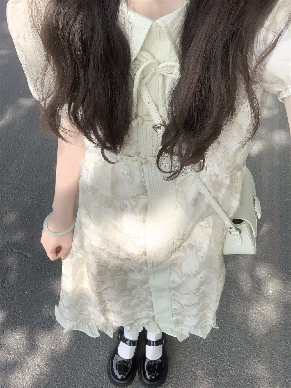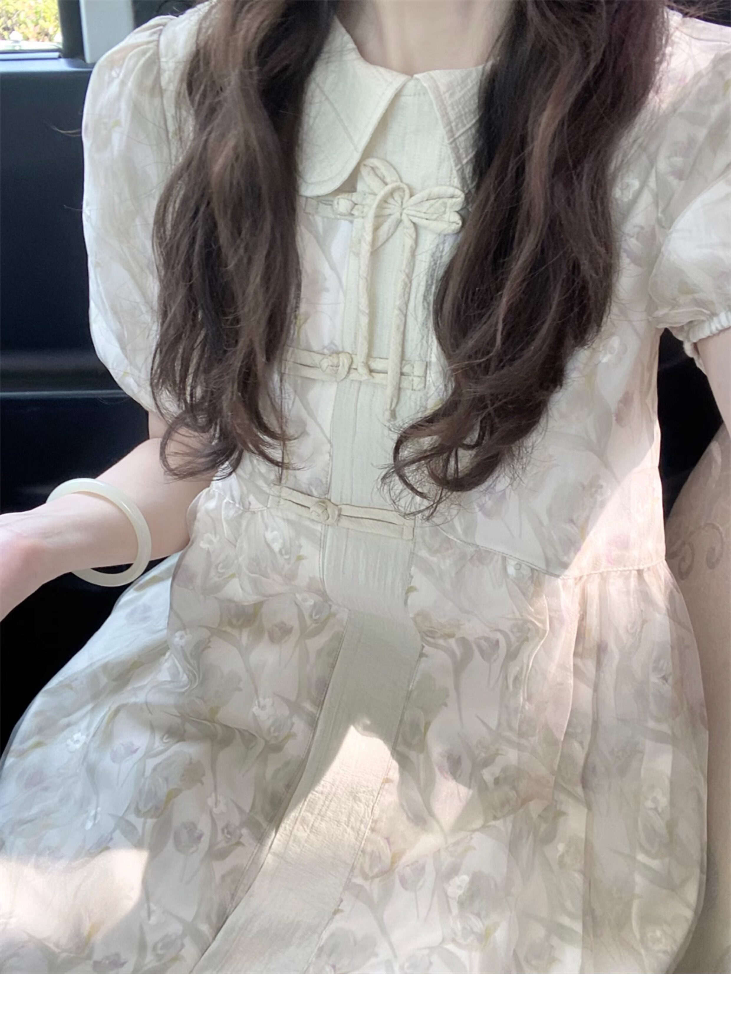新中式國風泡泡袖木耳邊拼接盤扣碎花洋裝夏小個子高腰氣質長裙
