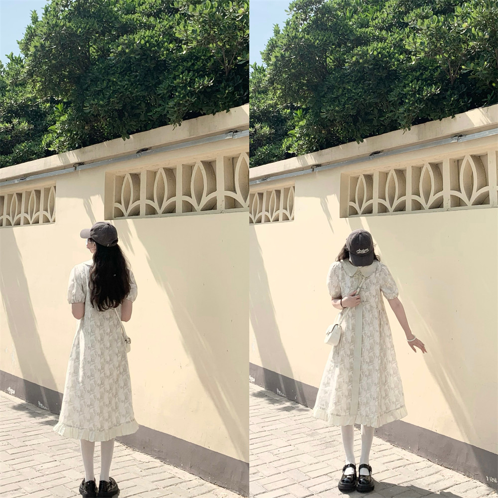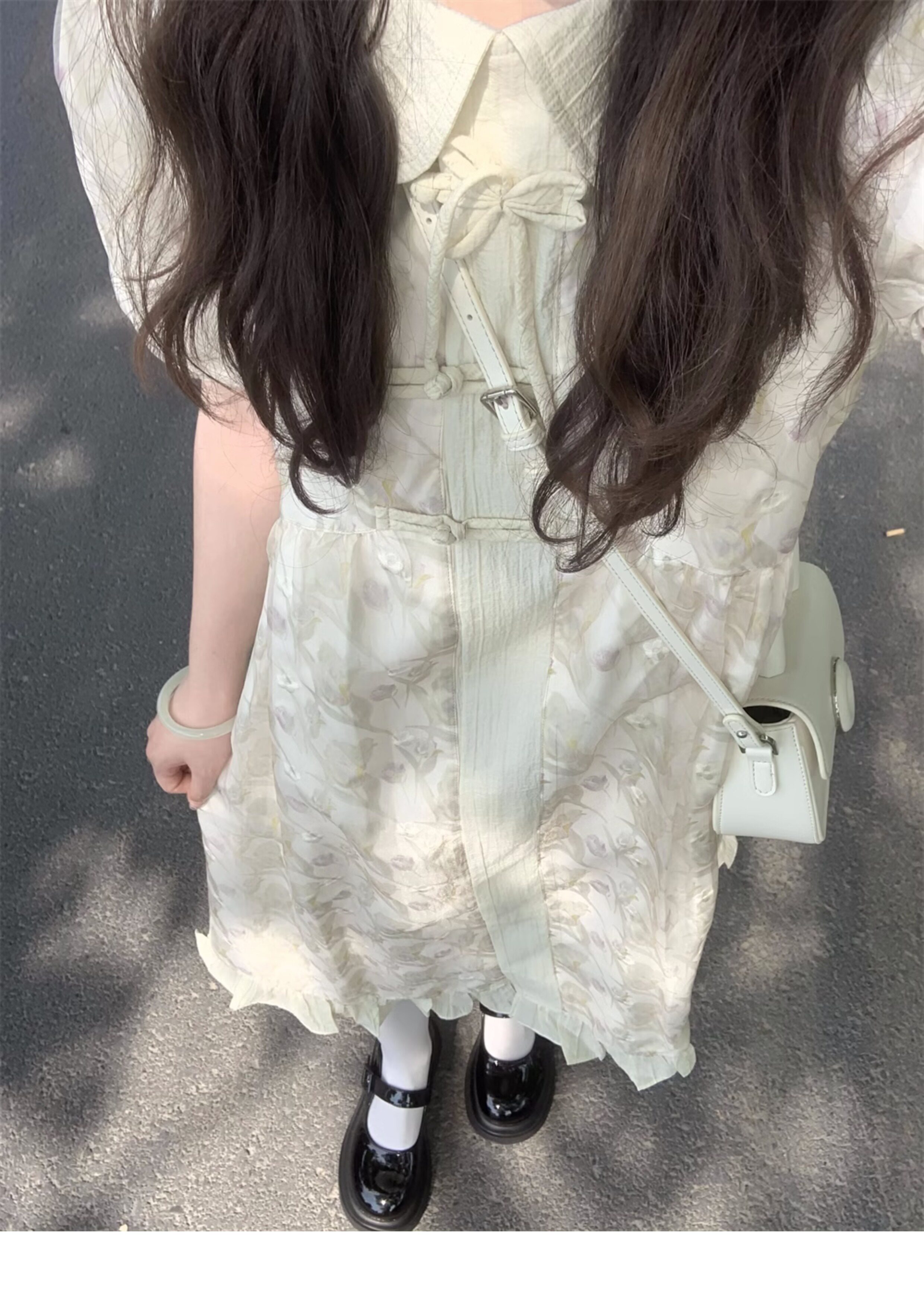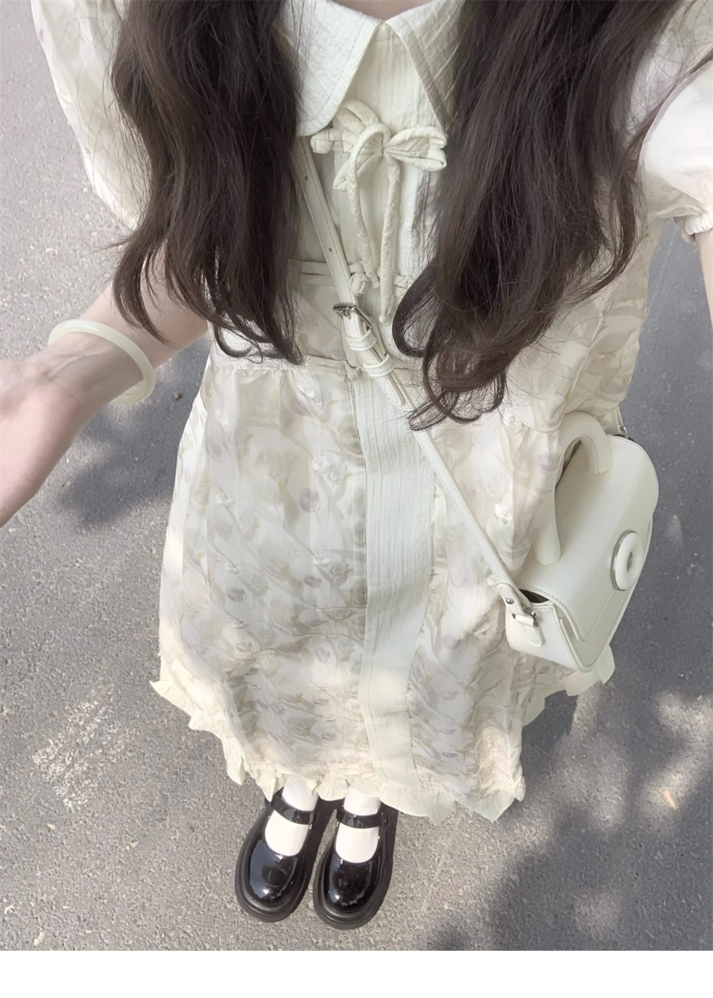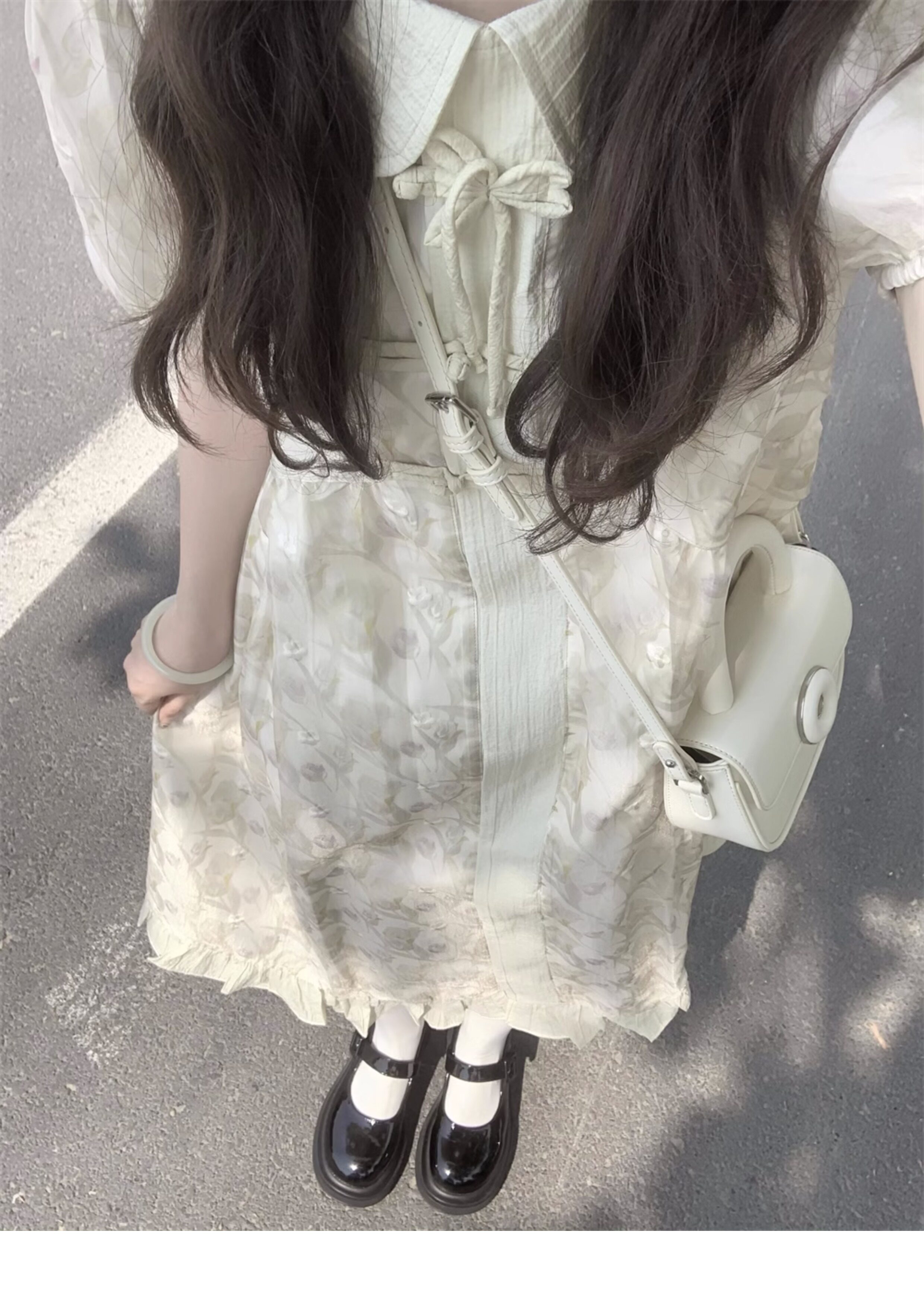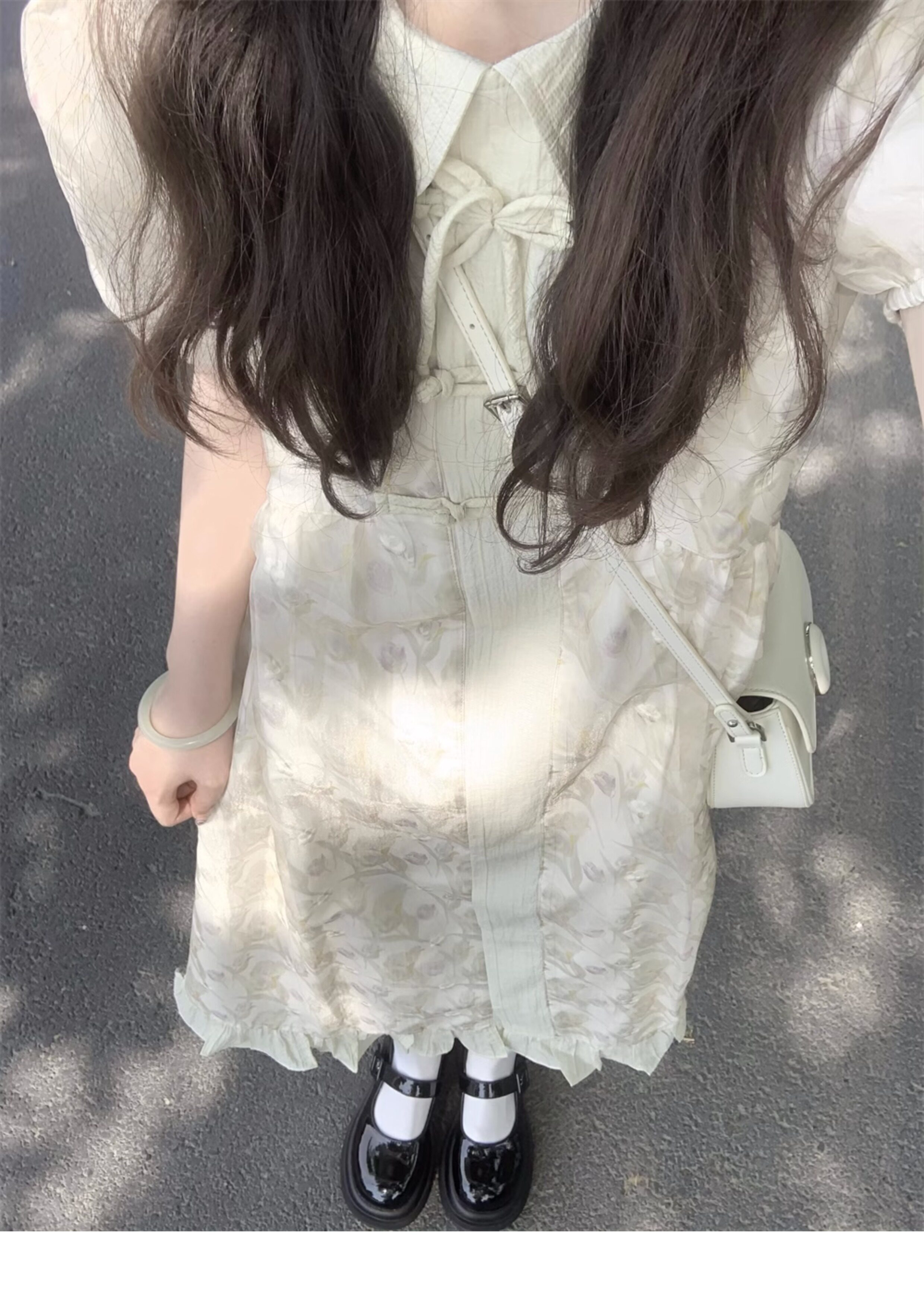 新中式國風泡泡袖木耳邊拼接盤扣碎花洋裝夏小個子高腰氣質長裙