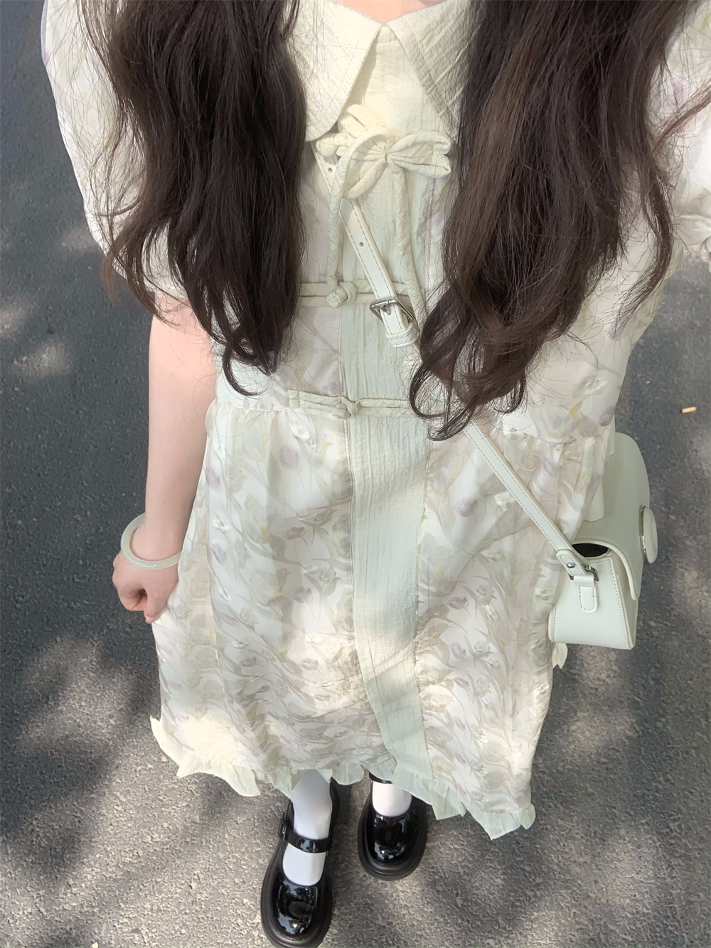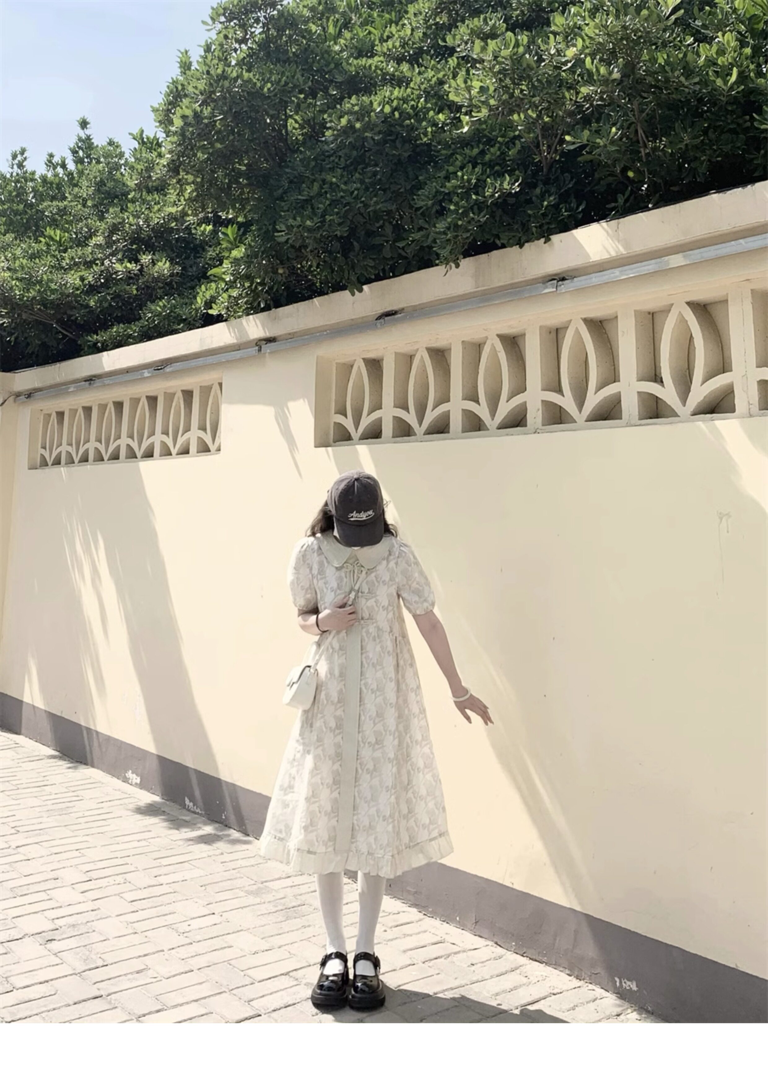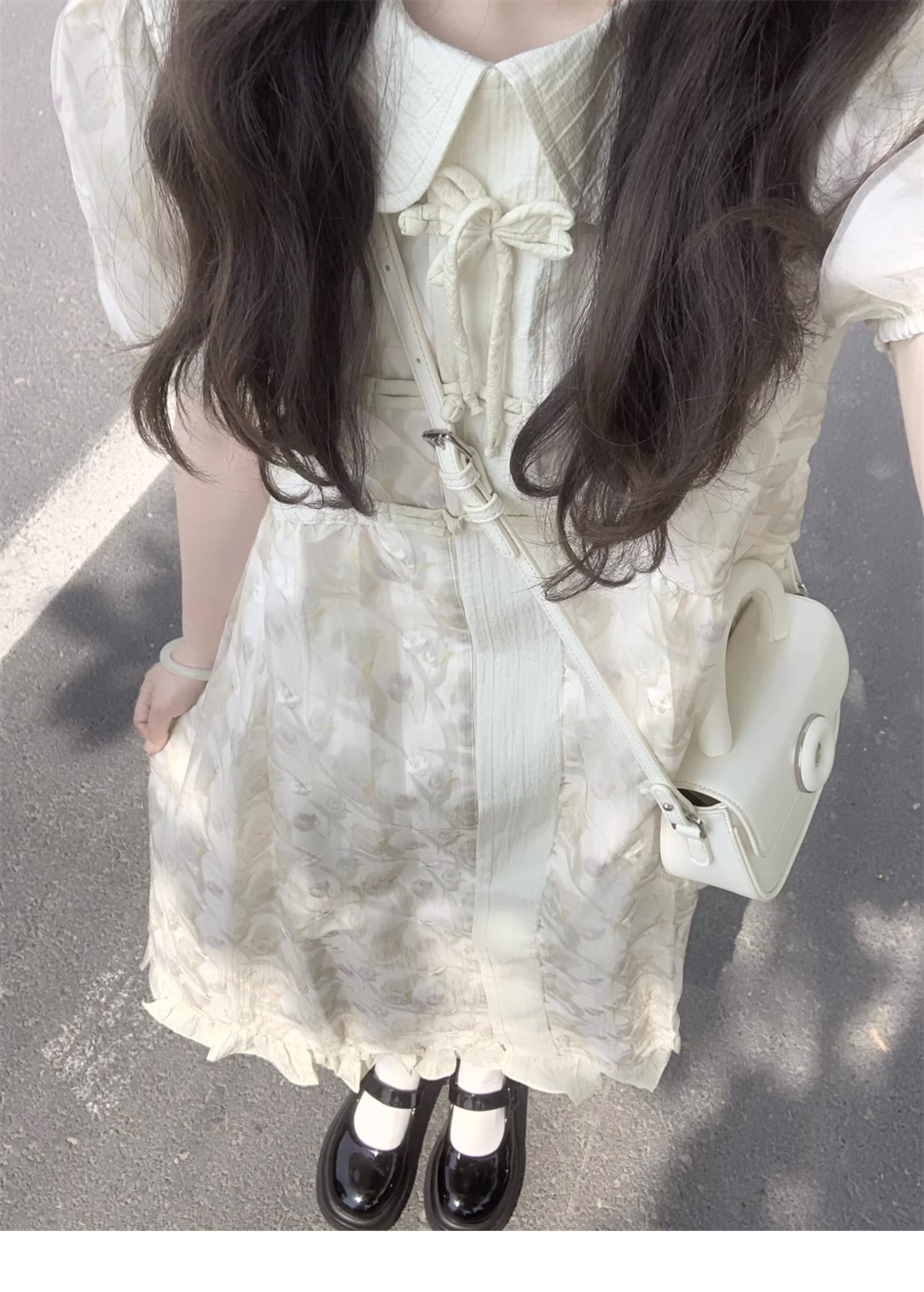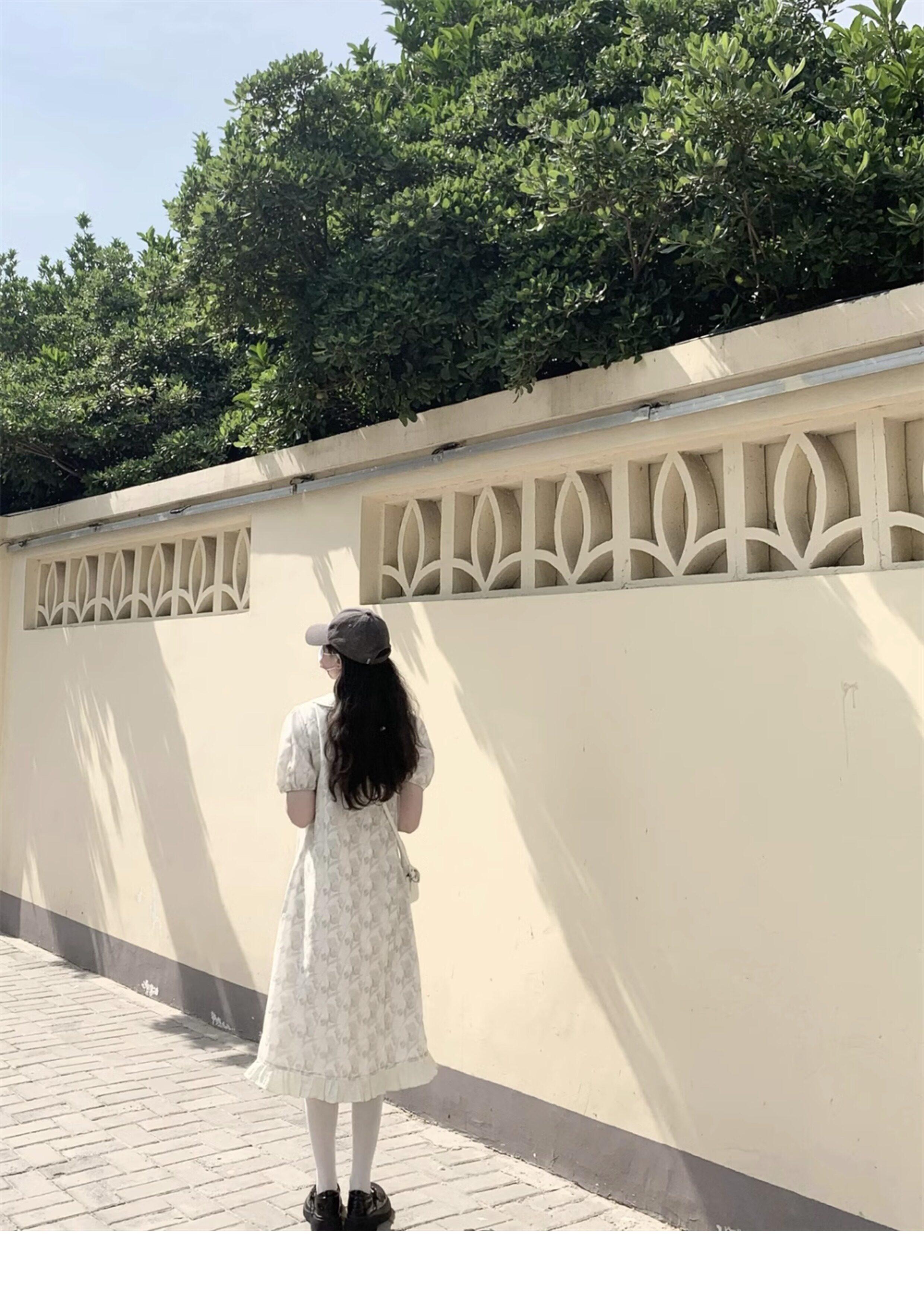 新中式國風泡泡袖木耳邊拼接盤扣碎花洋裝夏小個子高腰氣質長裙