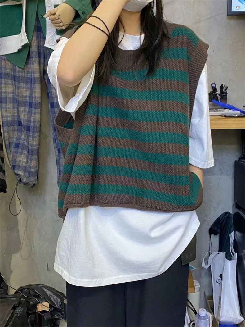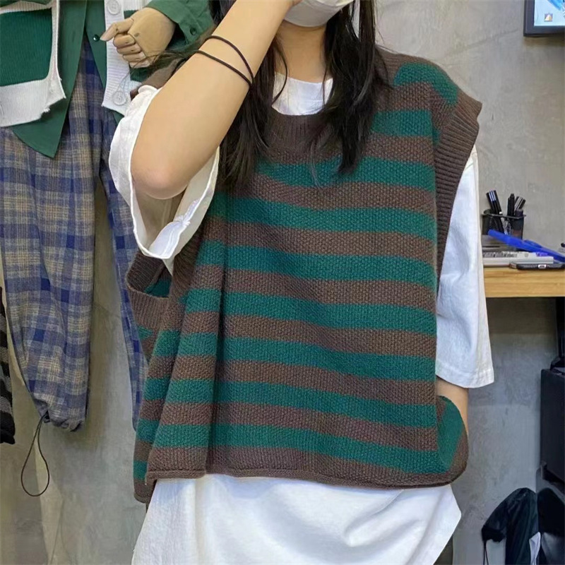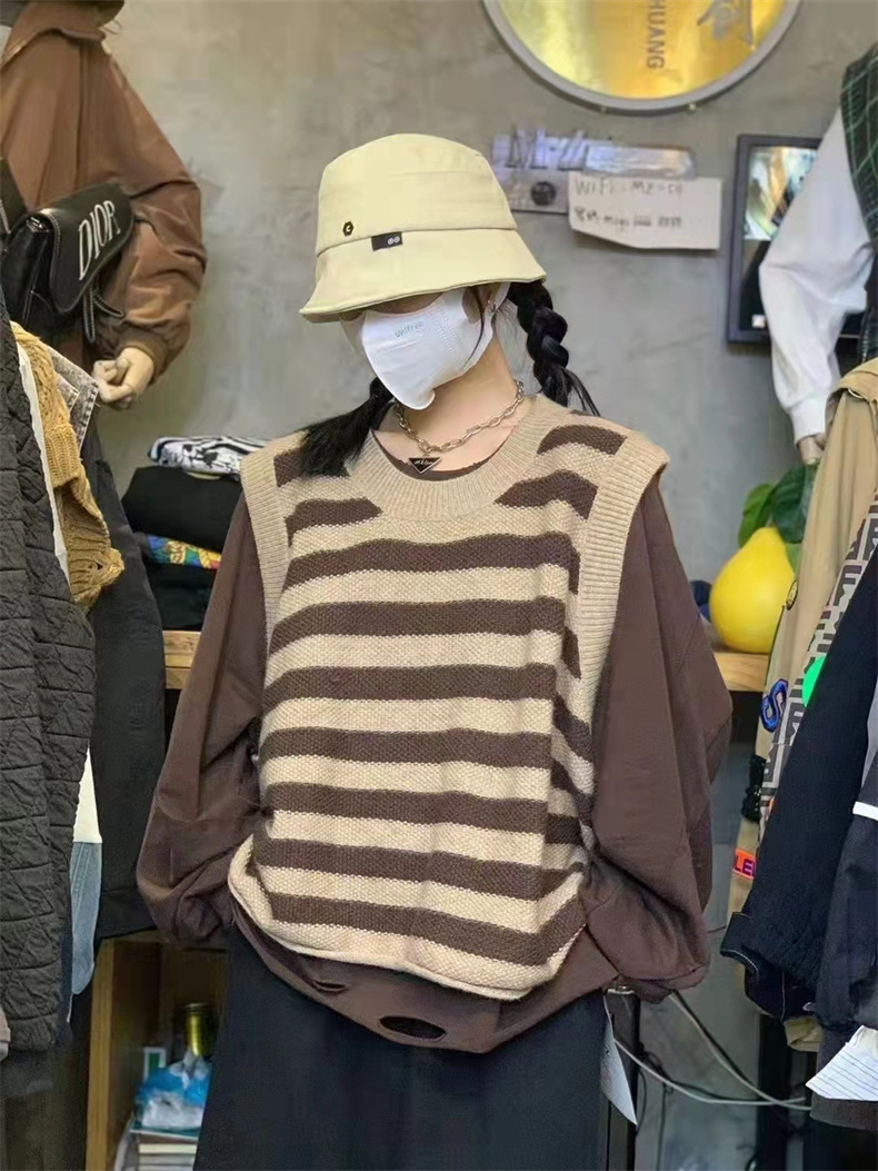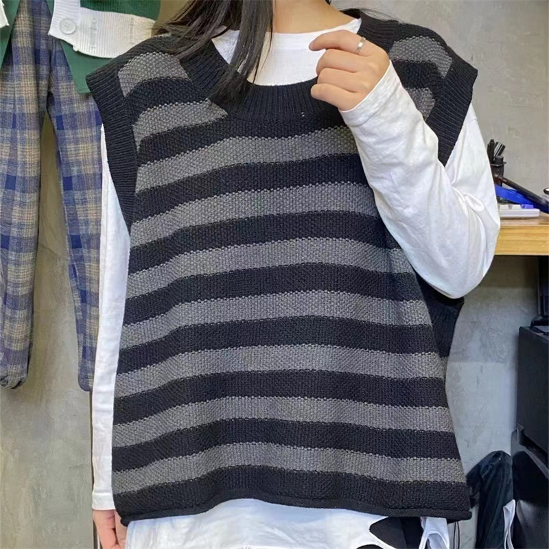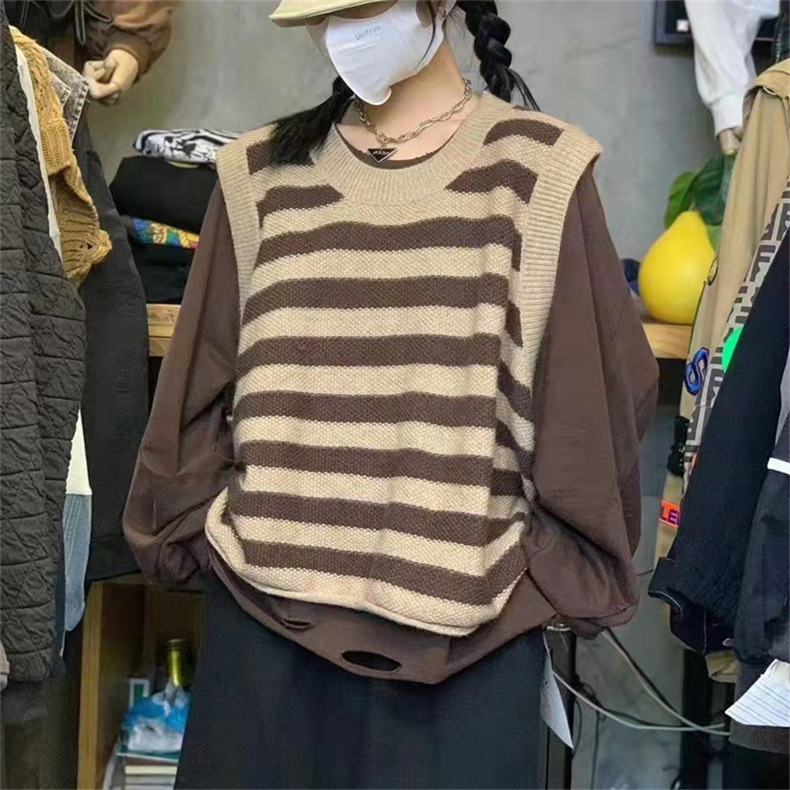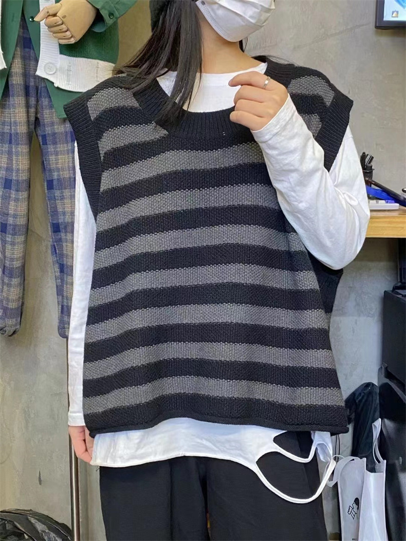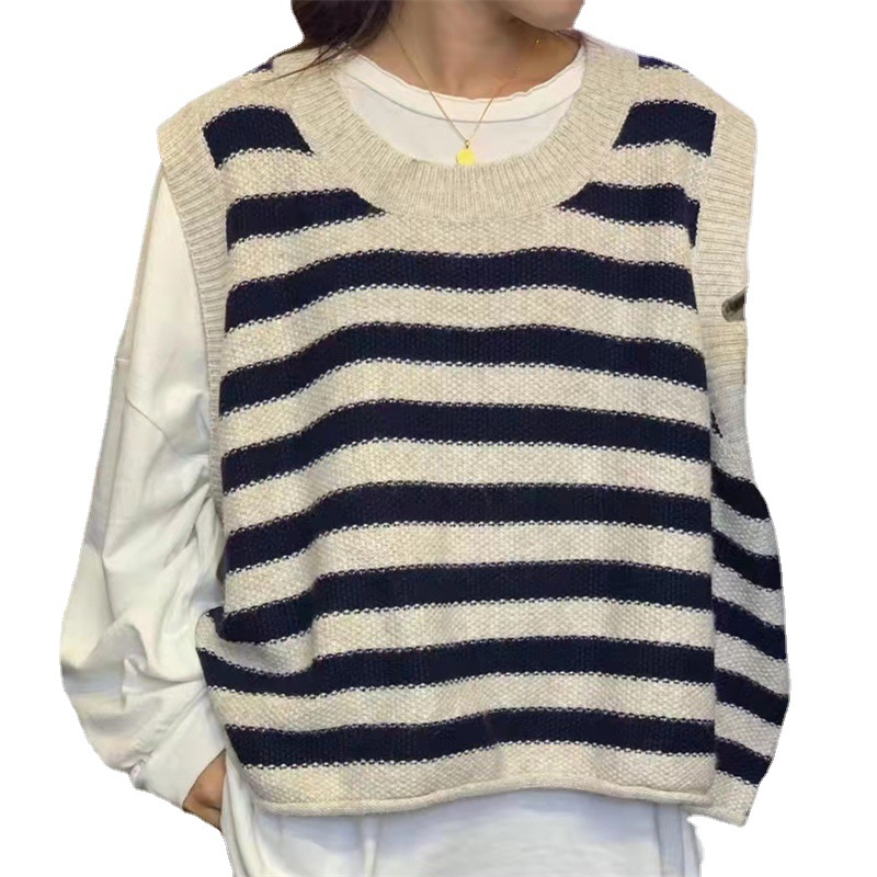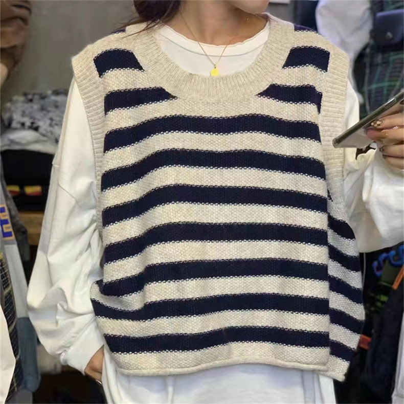 学院风条纹针织马甲背心秋冬2022年新款别致圆领坎肩叠穿无袖上衣