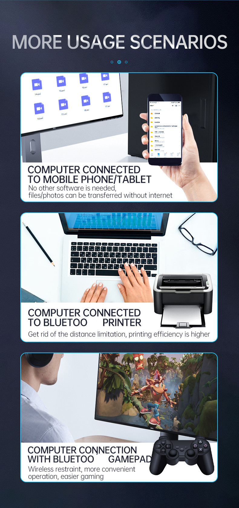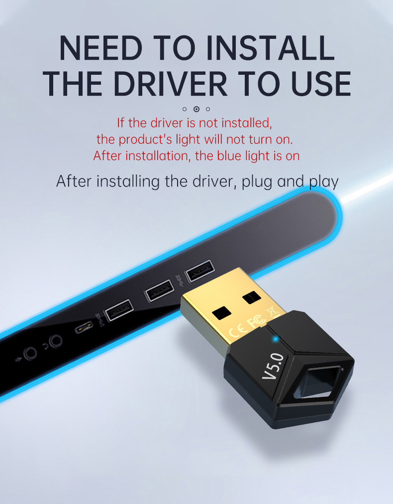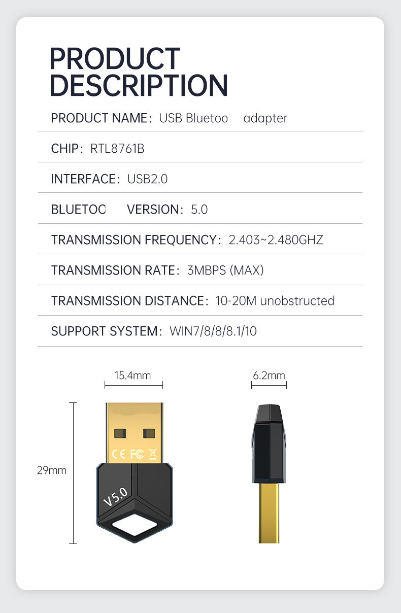 适配器采用瑞昱RTL8761B芯片,真5.0,传输距离更远,链接更稳定,支持Win7/8/8.1/10,需安装驱动使用