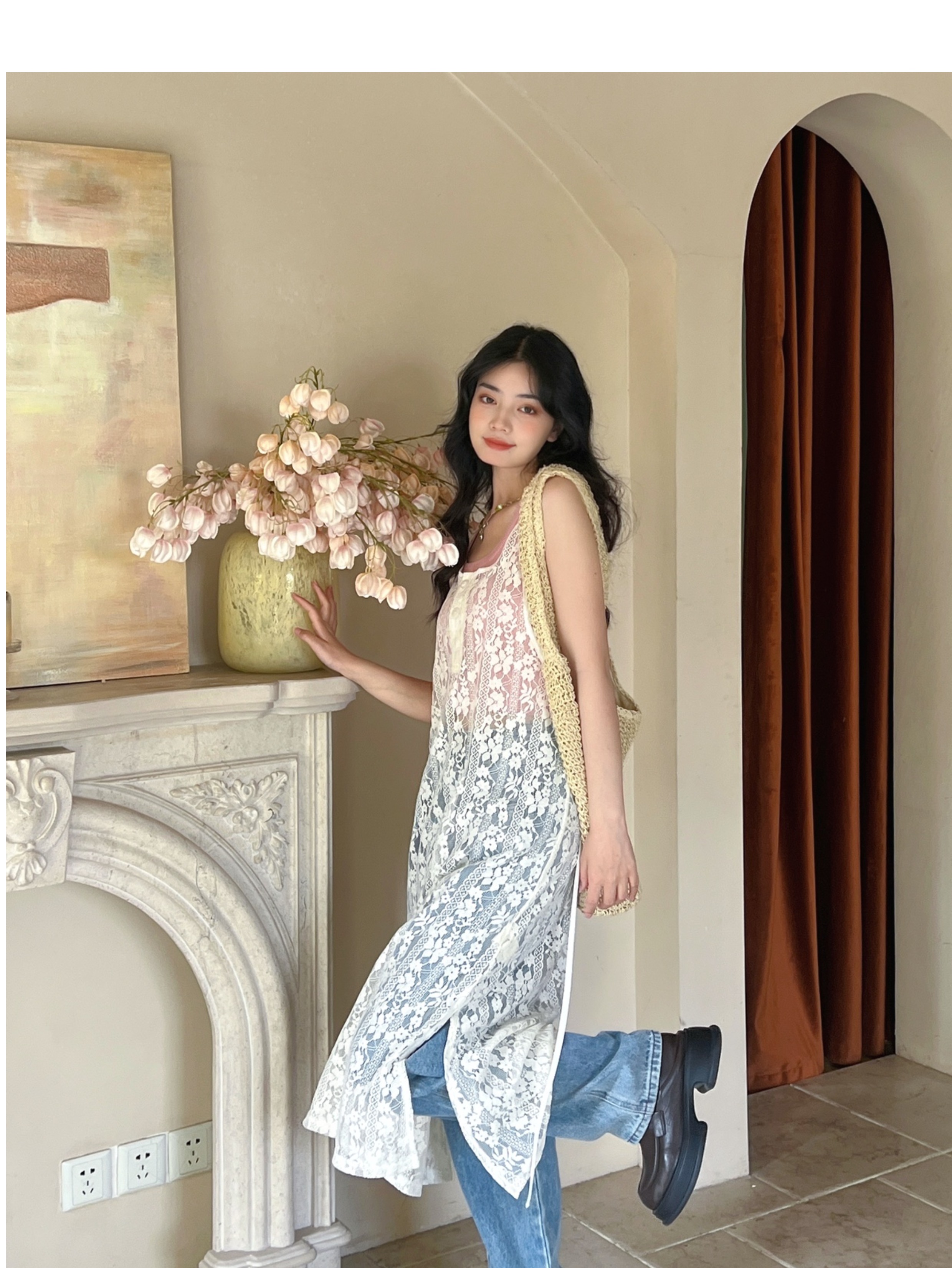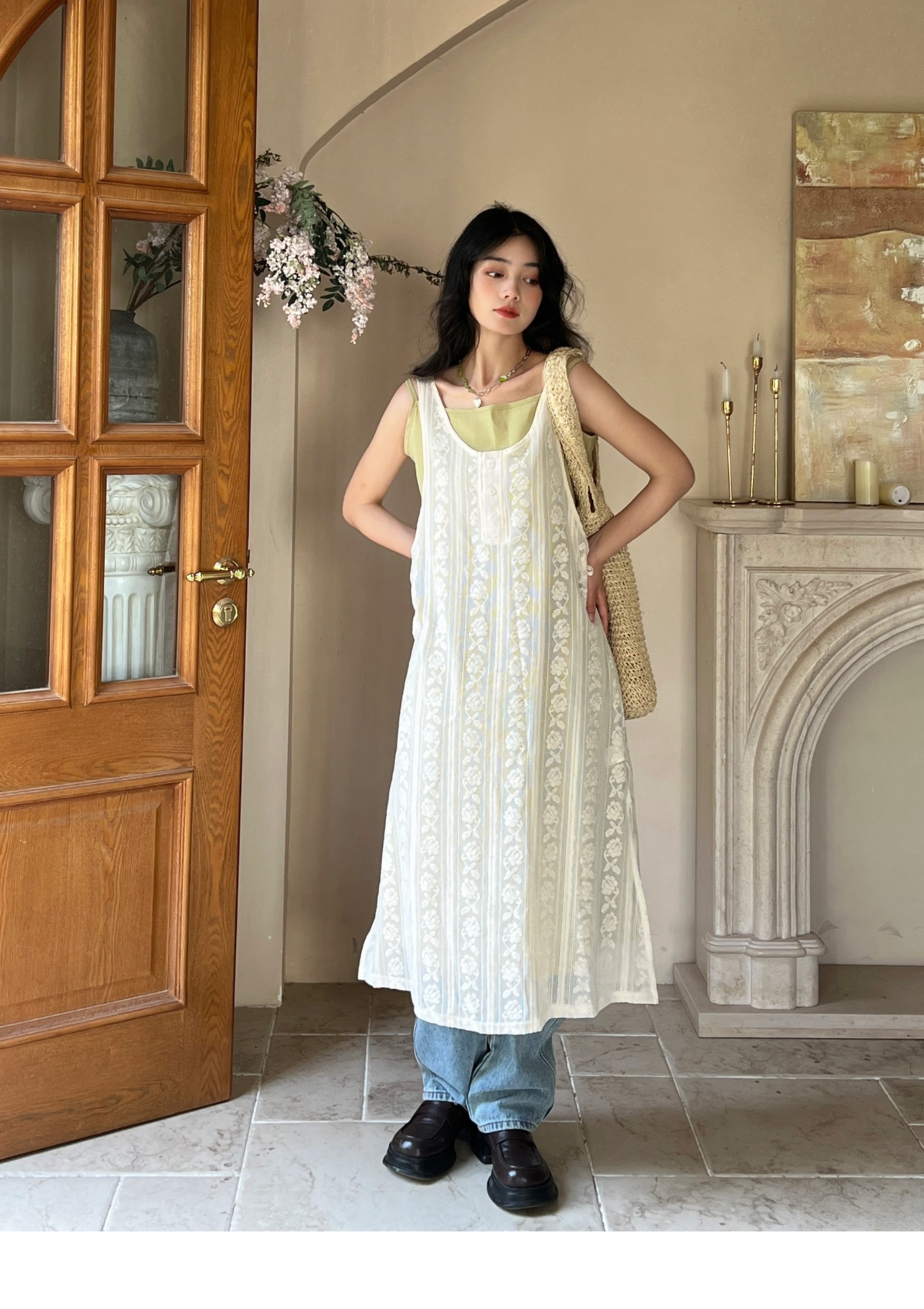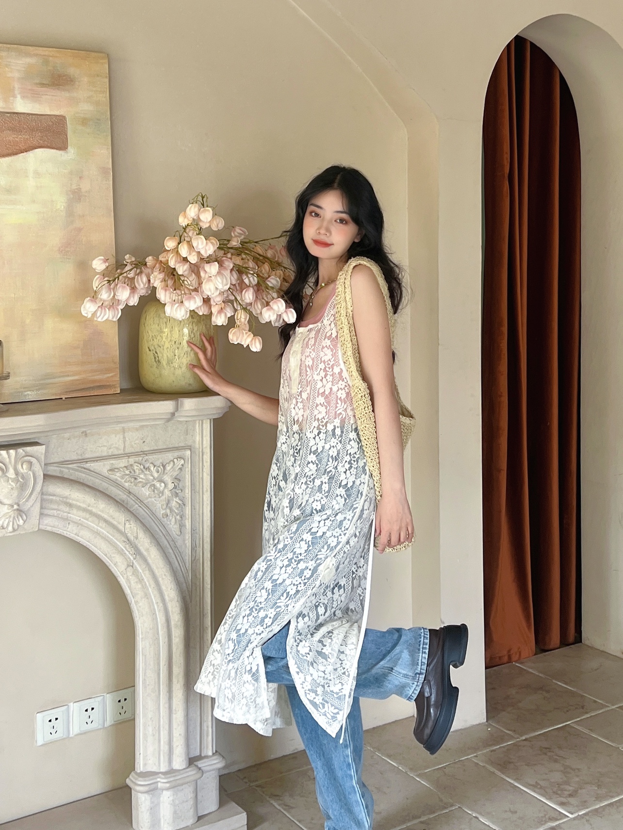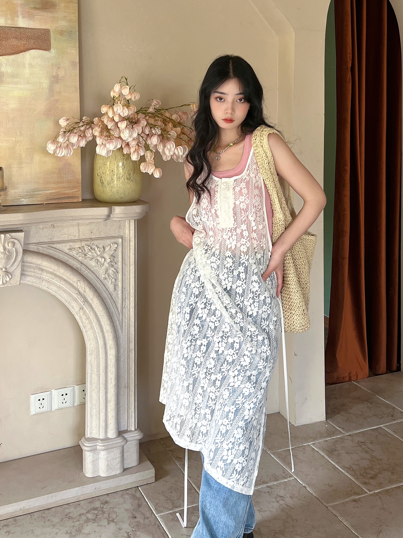 NERVOUS FROG自制復古鏤空蕾絲罩裙長版背心洋裝
