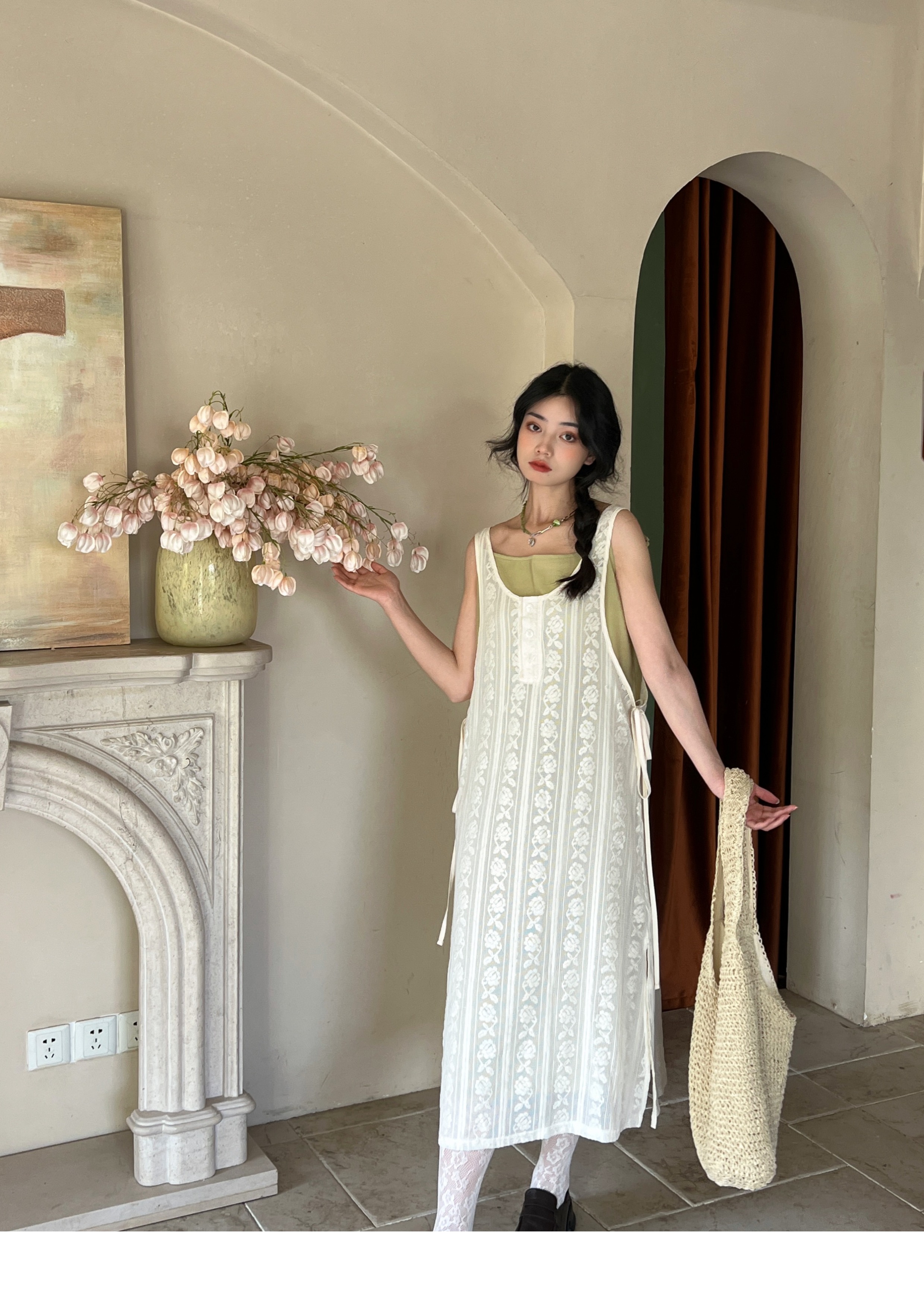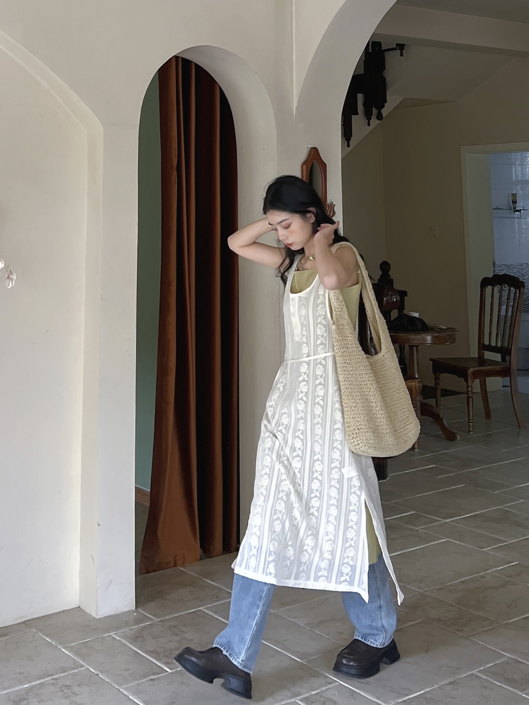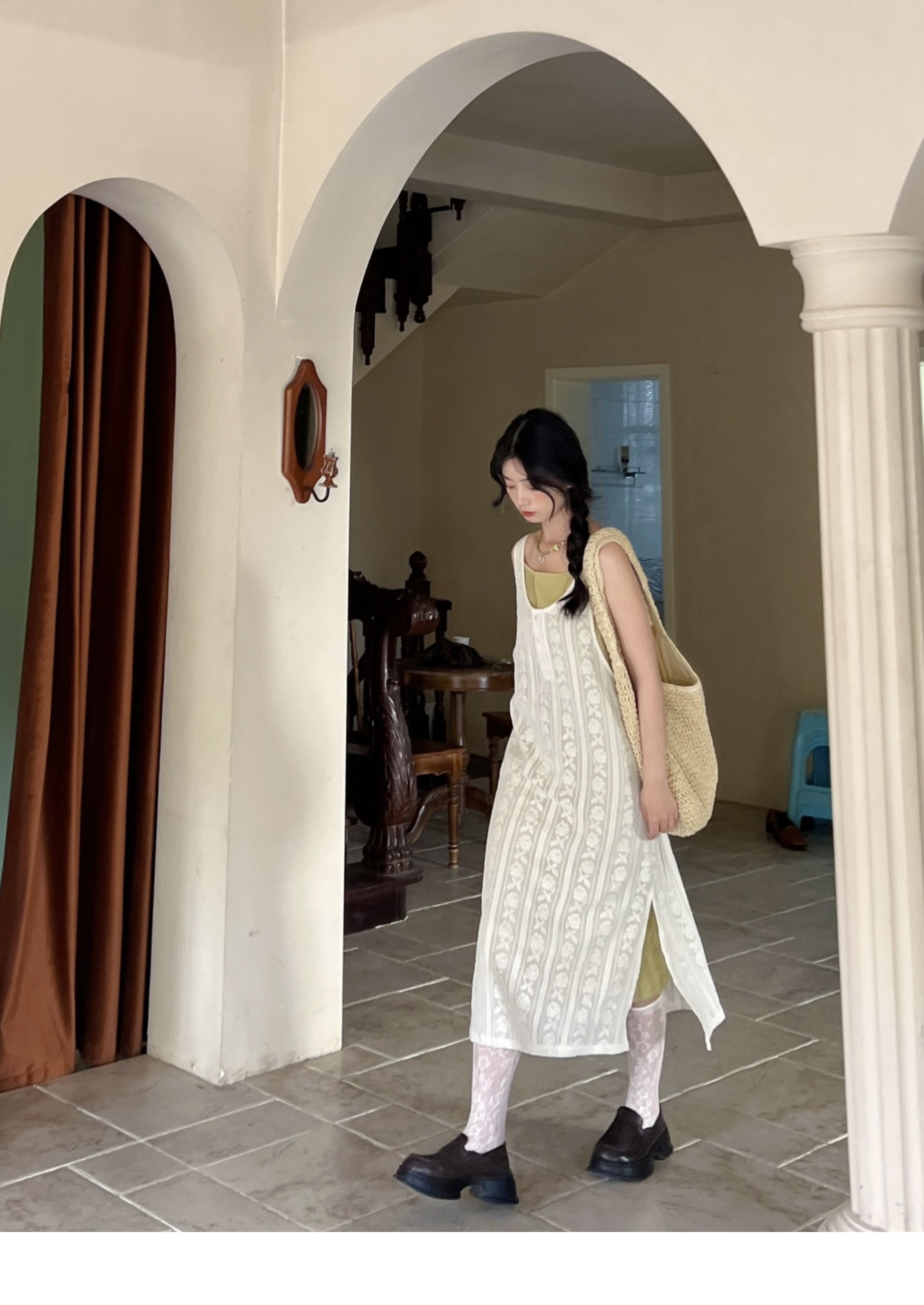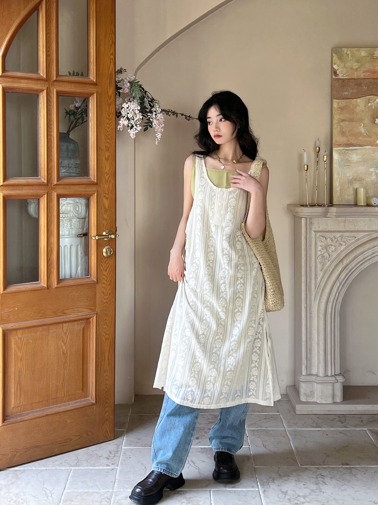NERVOUS FROG自制復古鏤空蕾絲罩裙長版背心洋裝