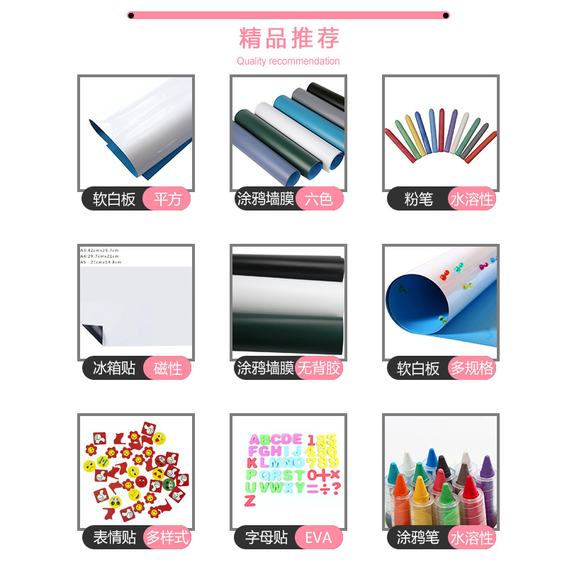 主营产品:多规格磁性涂鸦墙膜、PET软白板、双面水洗墙膜、水溶性涂鸦笔、水溶性固体粉笔、液体白板笔、磁钉磁扣、磁性字母贴、磁性七巧板、磁性收纳袋、磁性田字格、磁性表情贴等