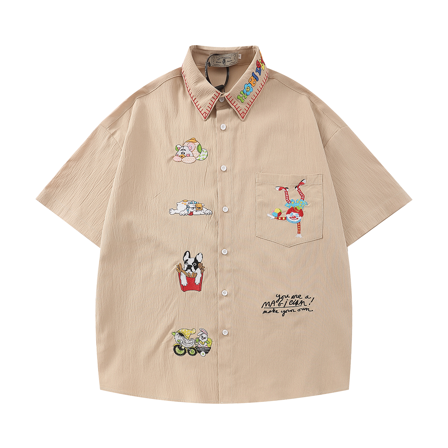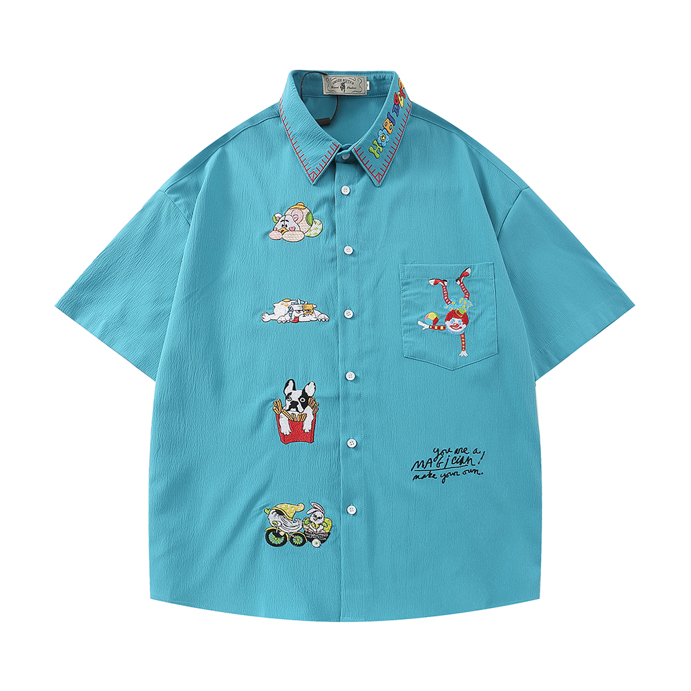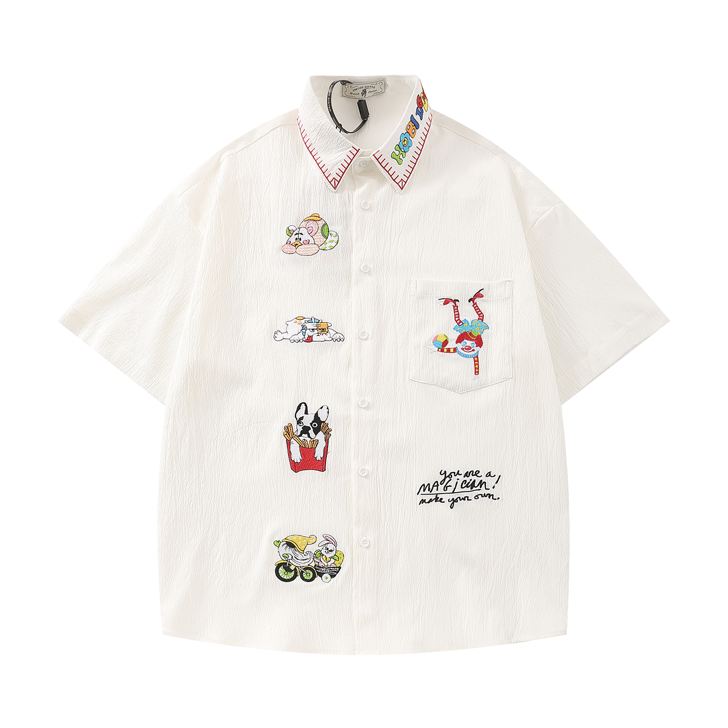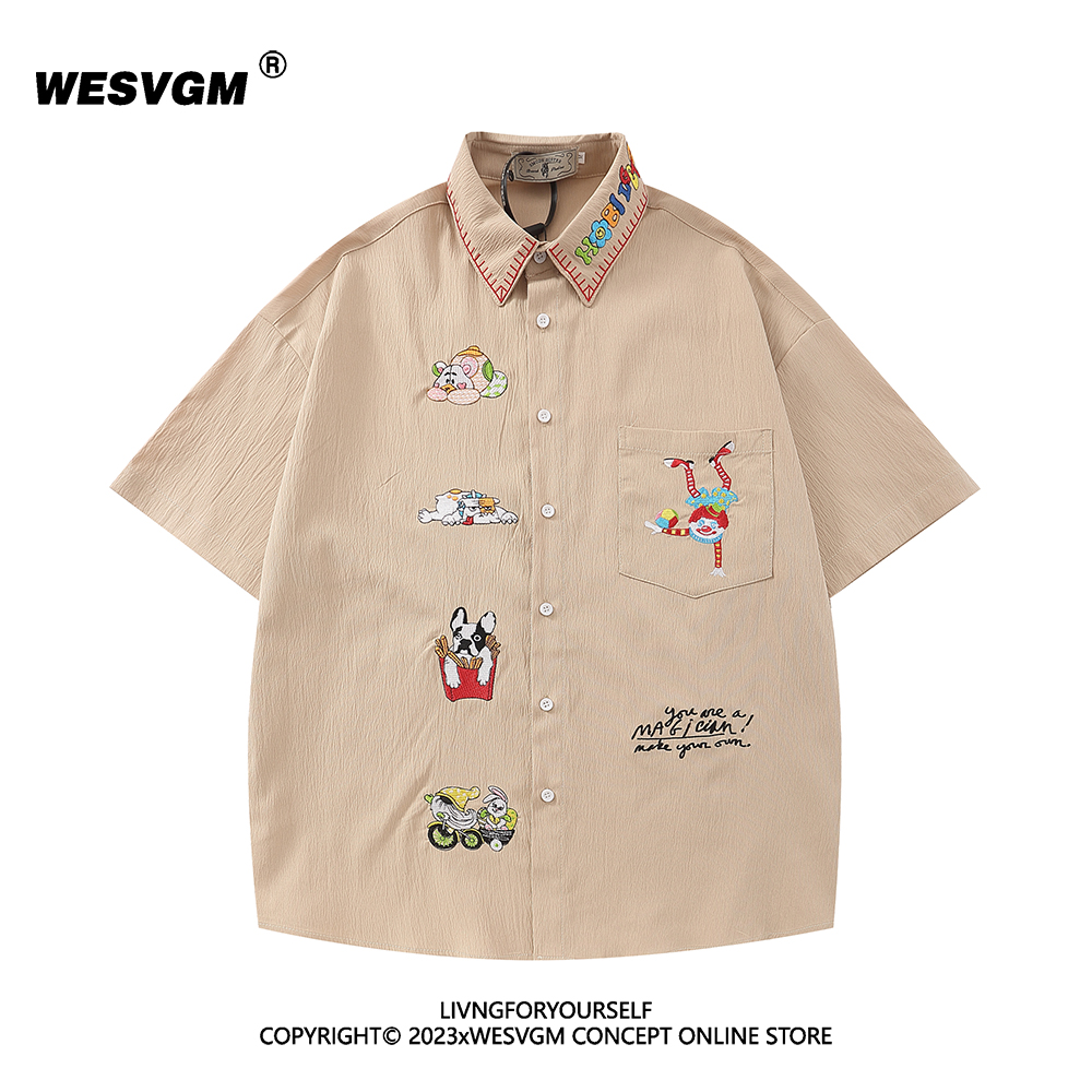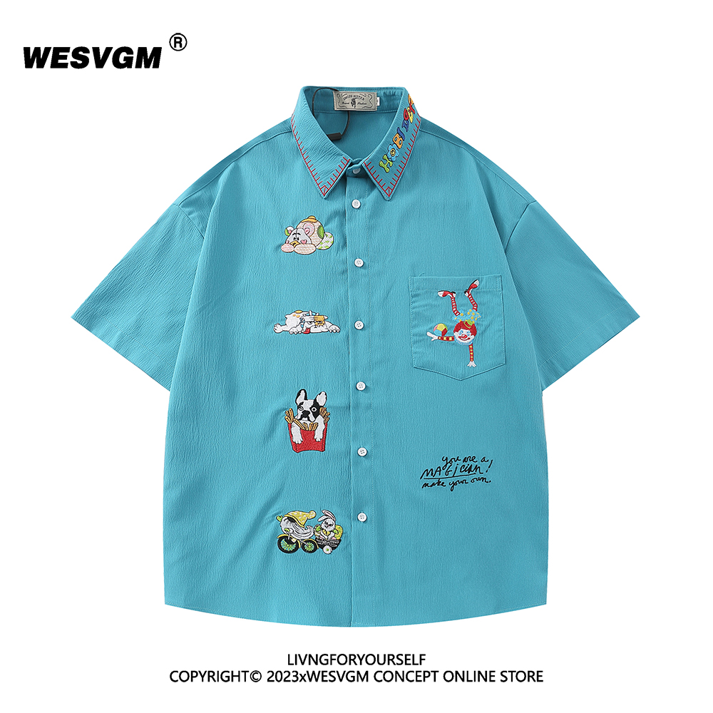 WESVGM美式復古趣味卡通刺繡短袖襯衫男女寬鬆情侶港味chic上衣潮