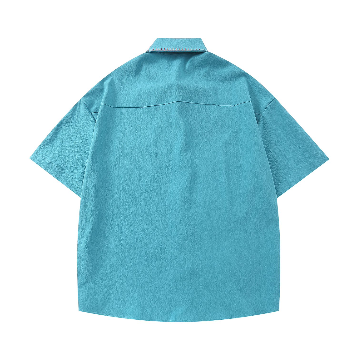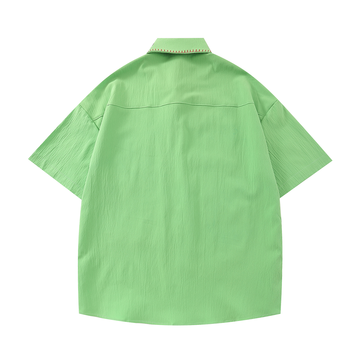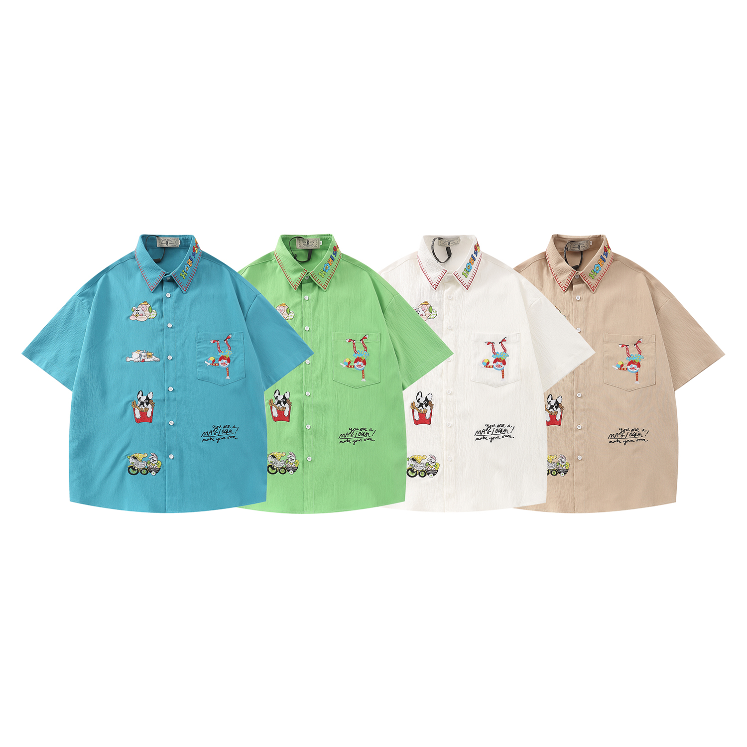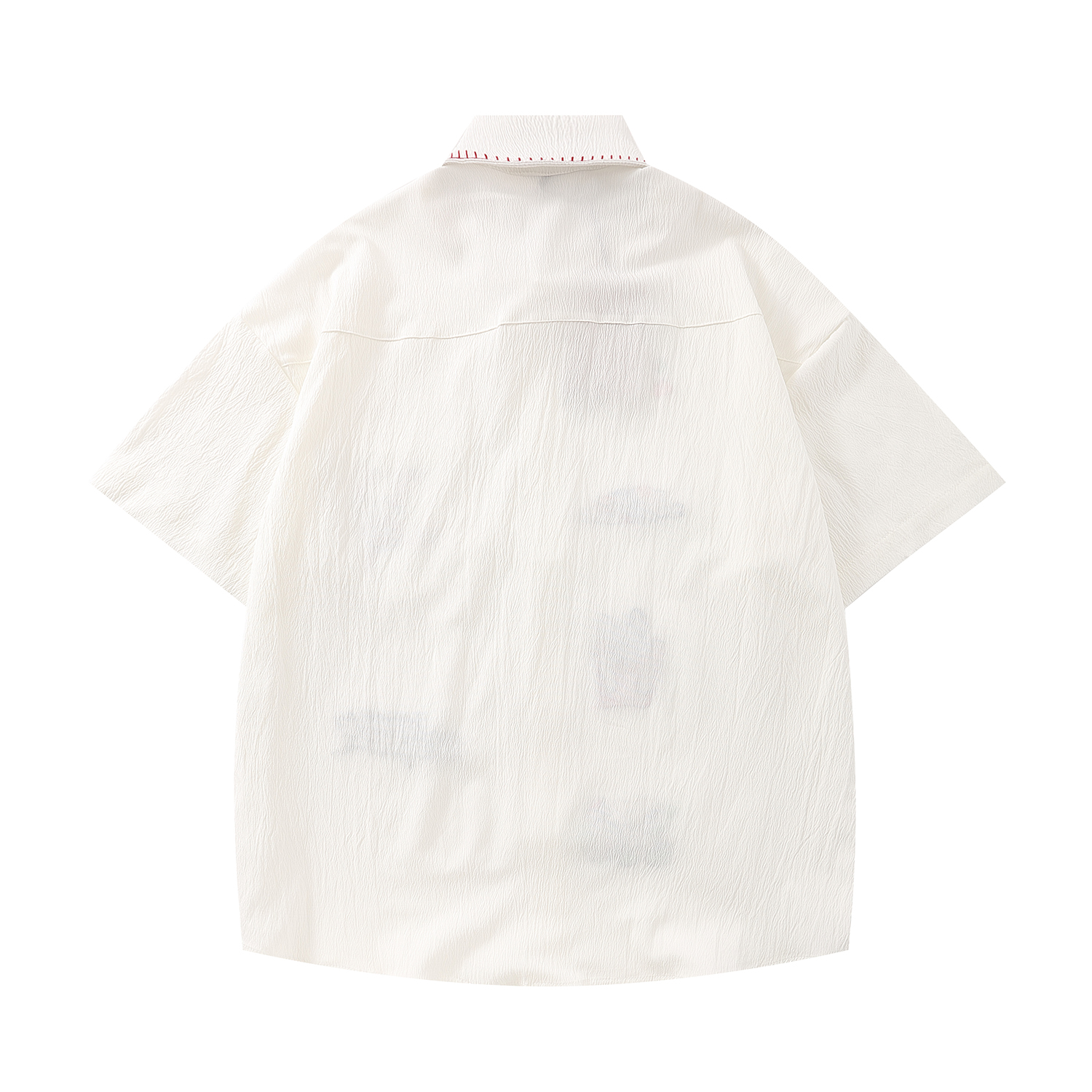 WESVGM美式復古趣味卡通刺繡短袖襯衫男女寬鬆情侶港味chic上衣潮