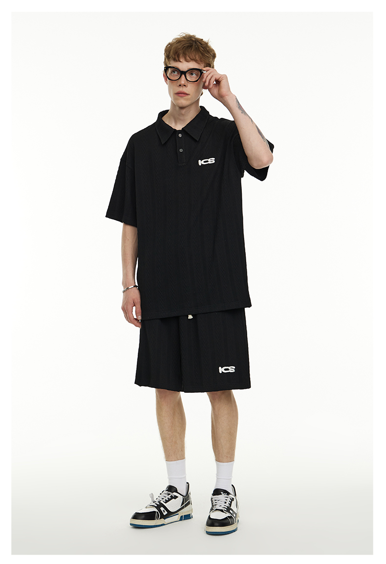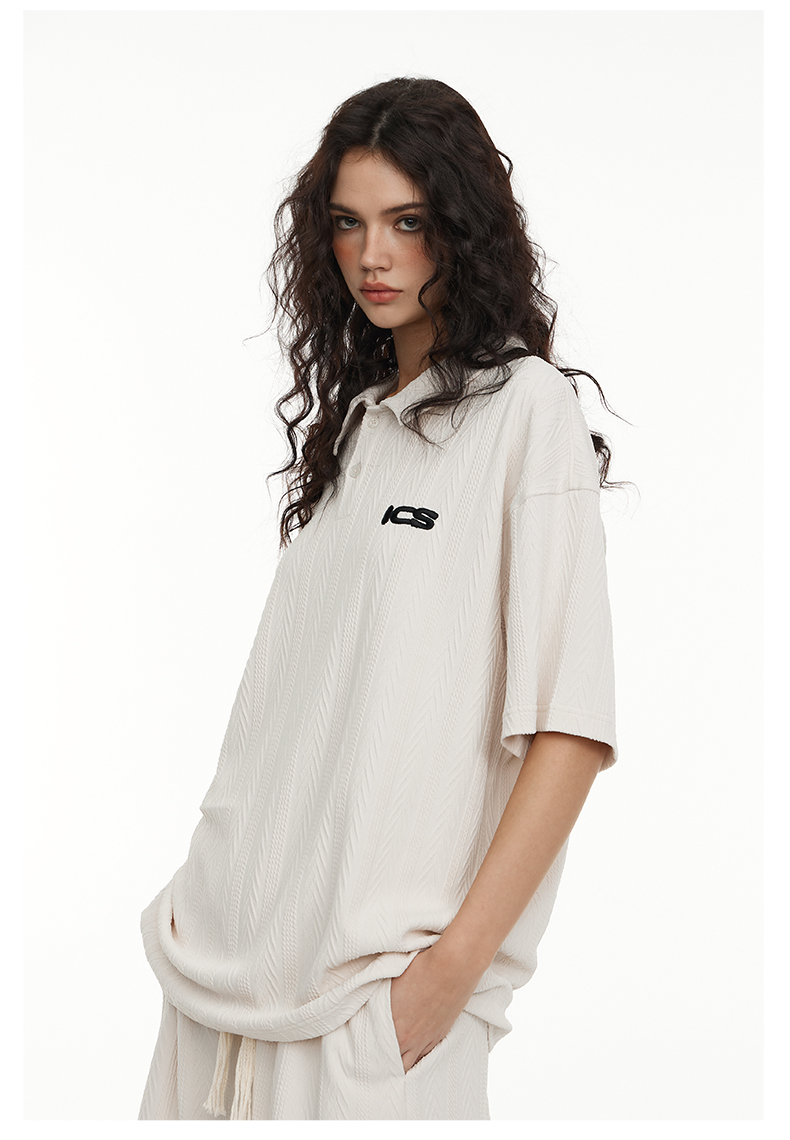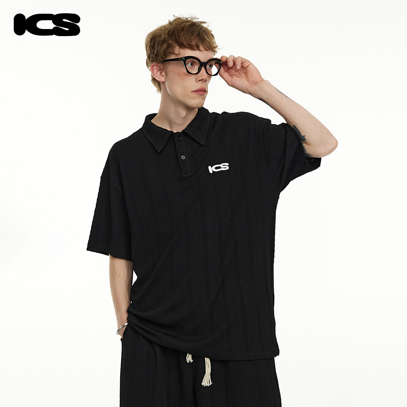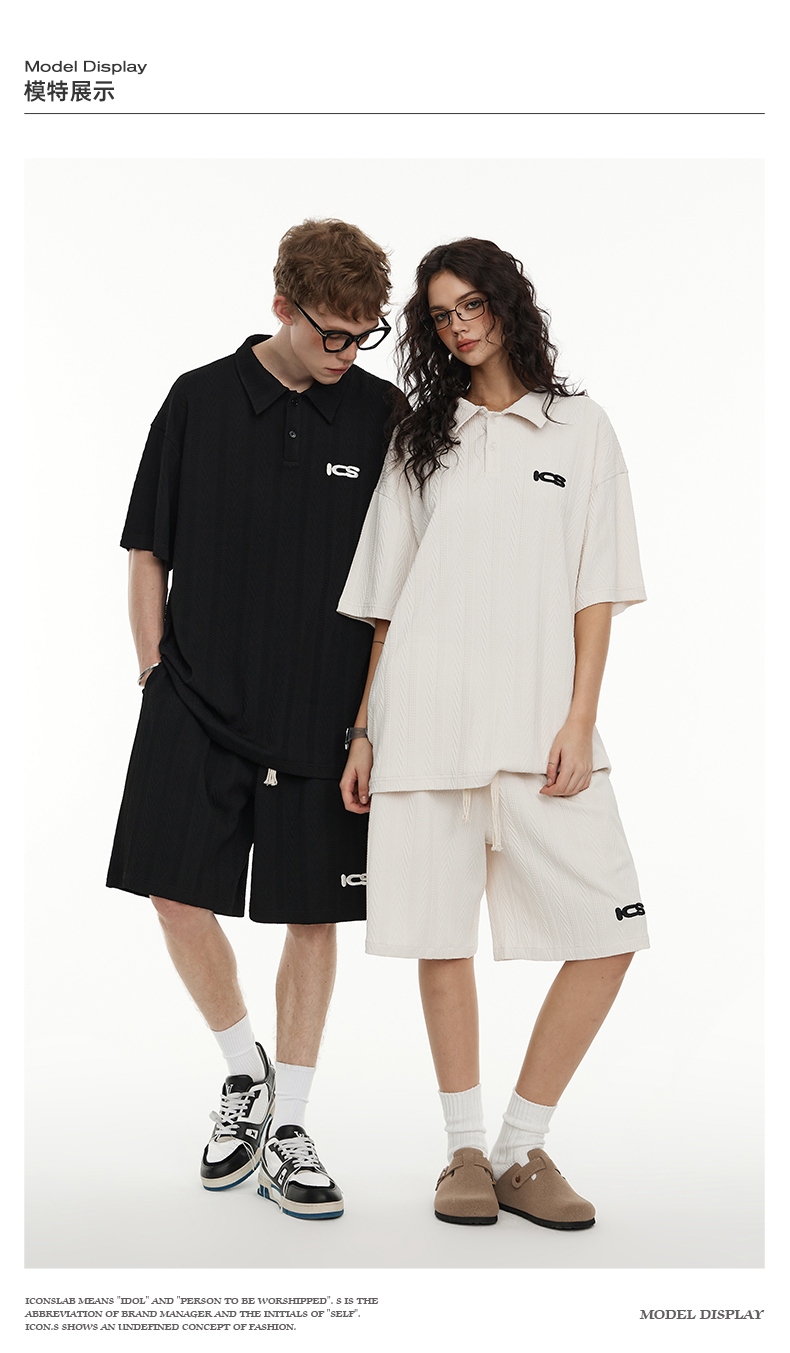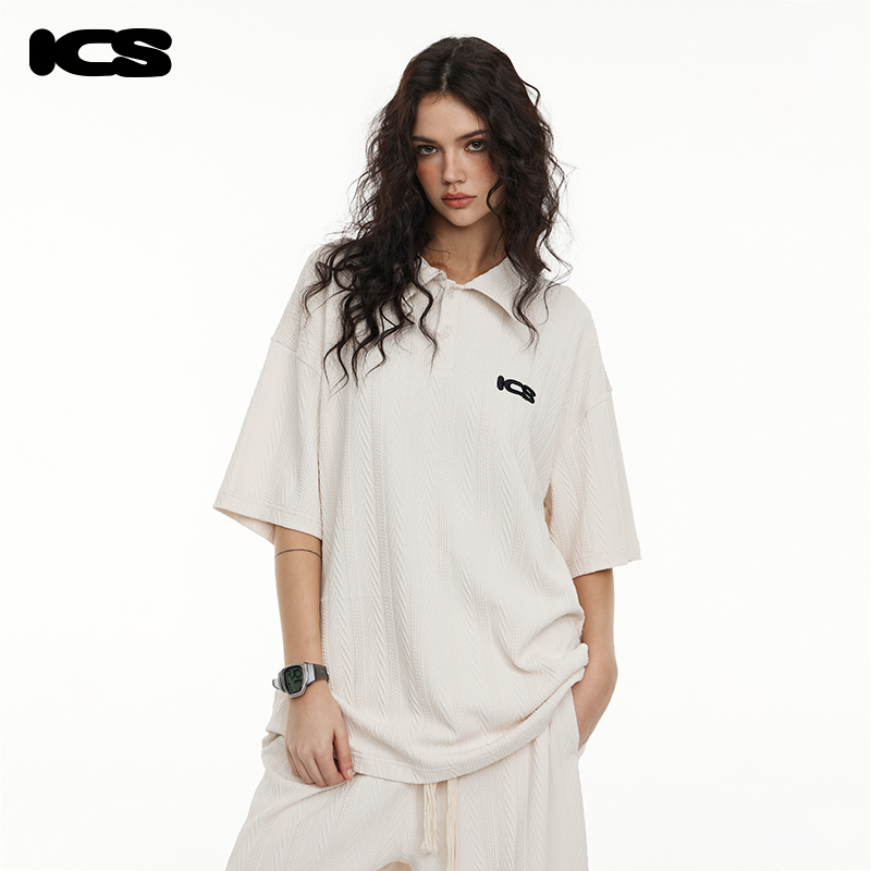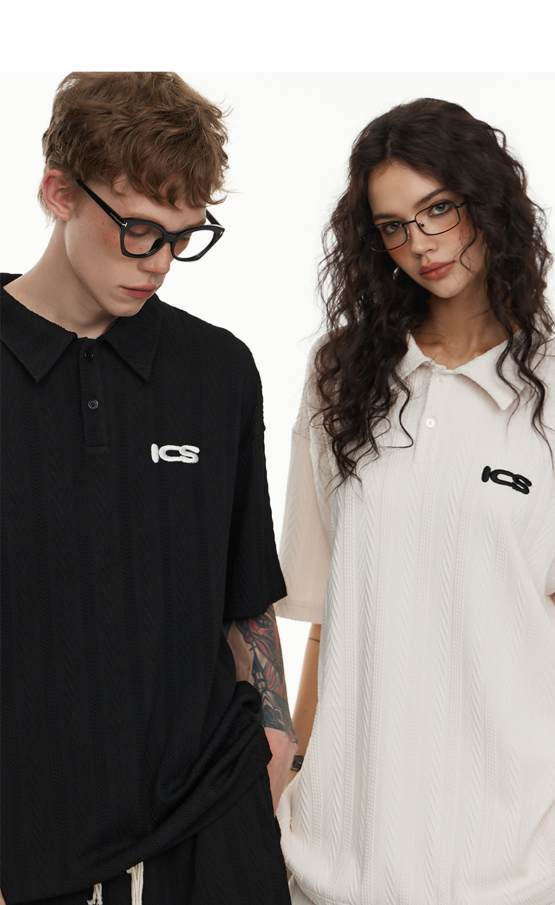 ICONSLAB美式絞花肌理紋路繡花短袖polo衫男復古情侶裝翻領T恤夏