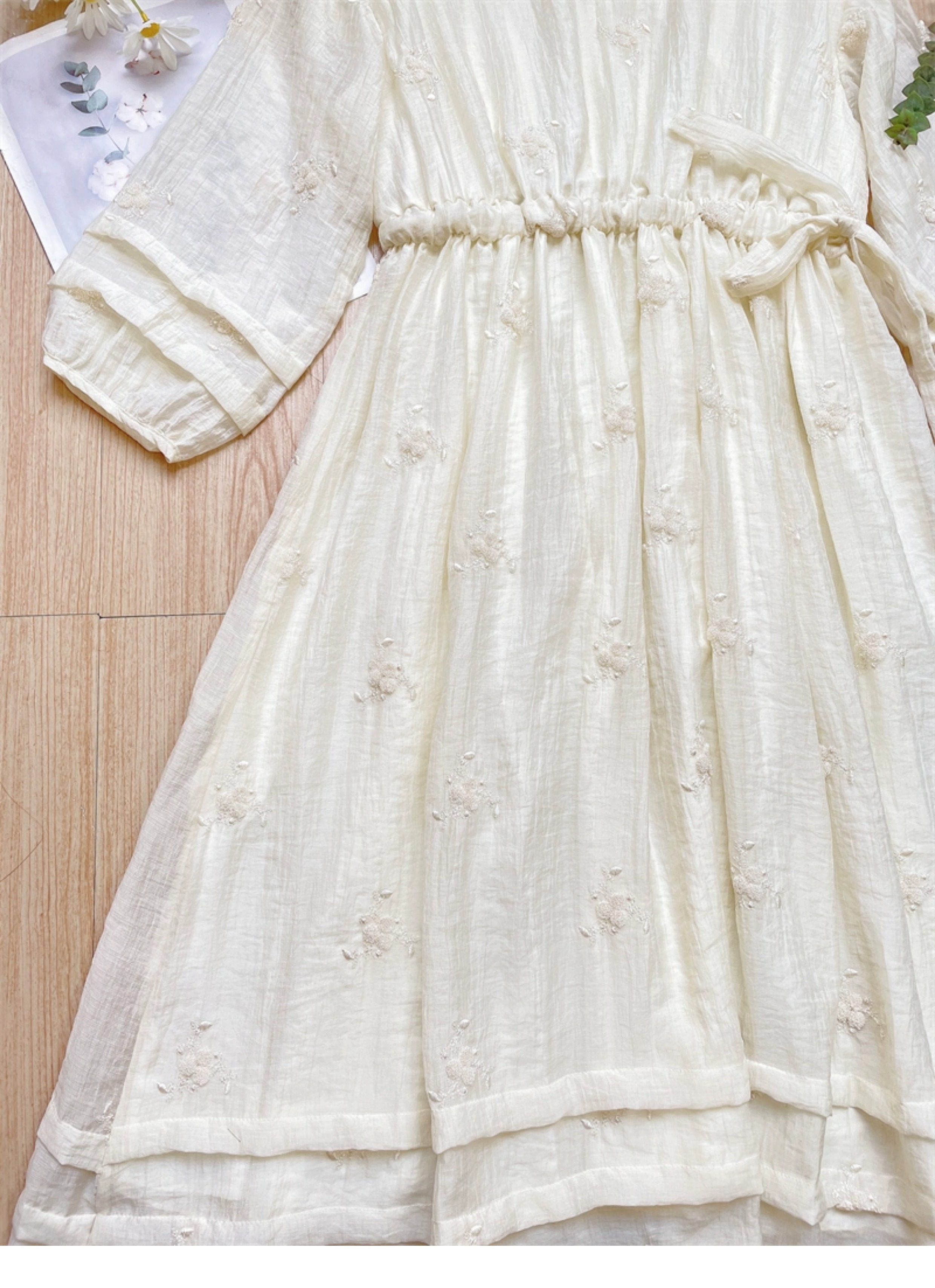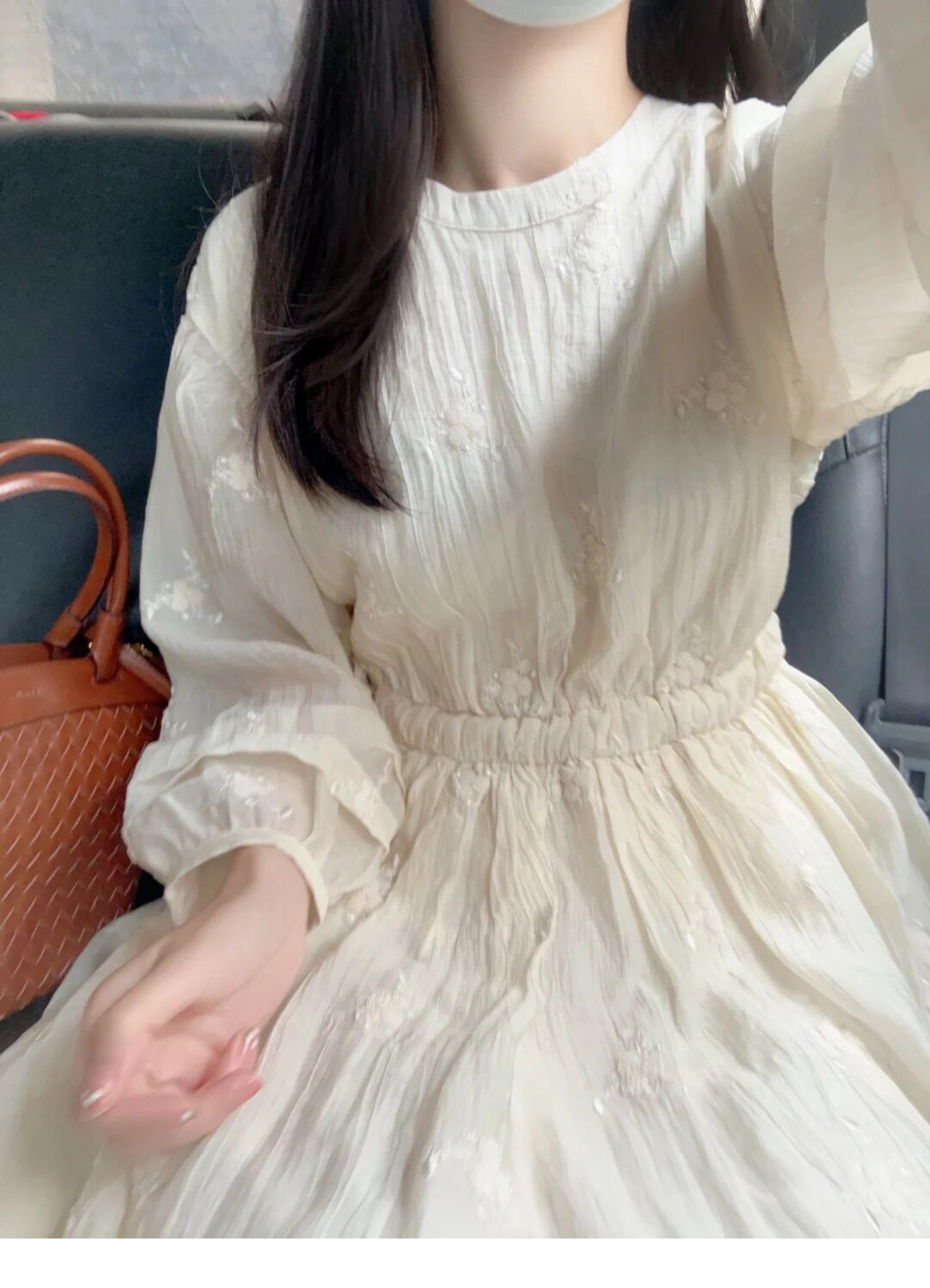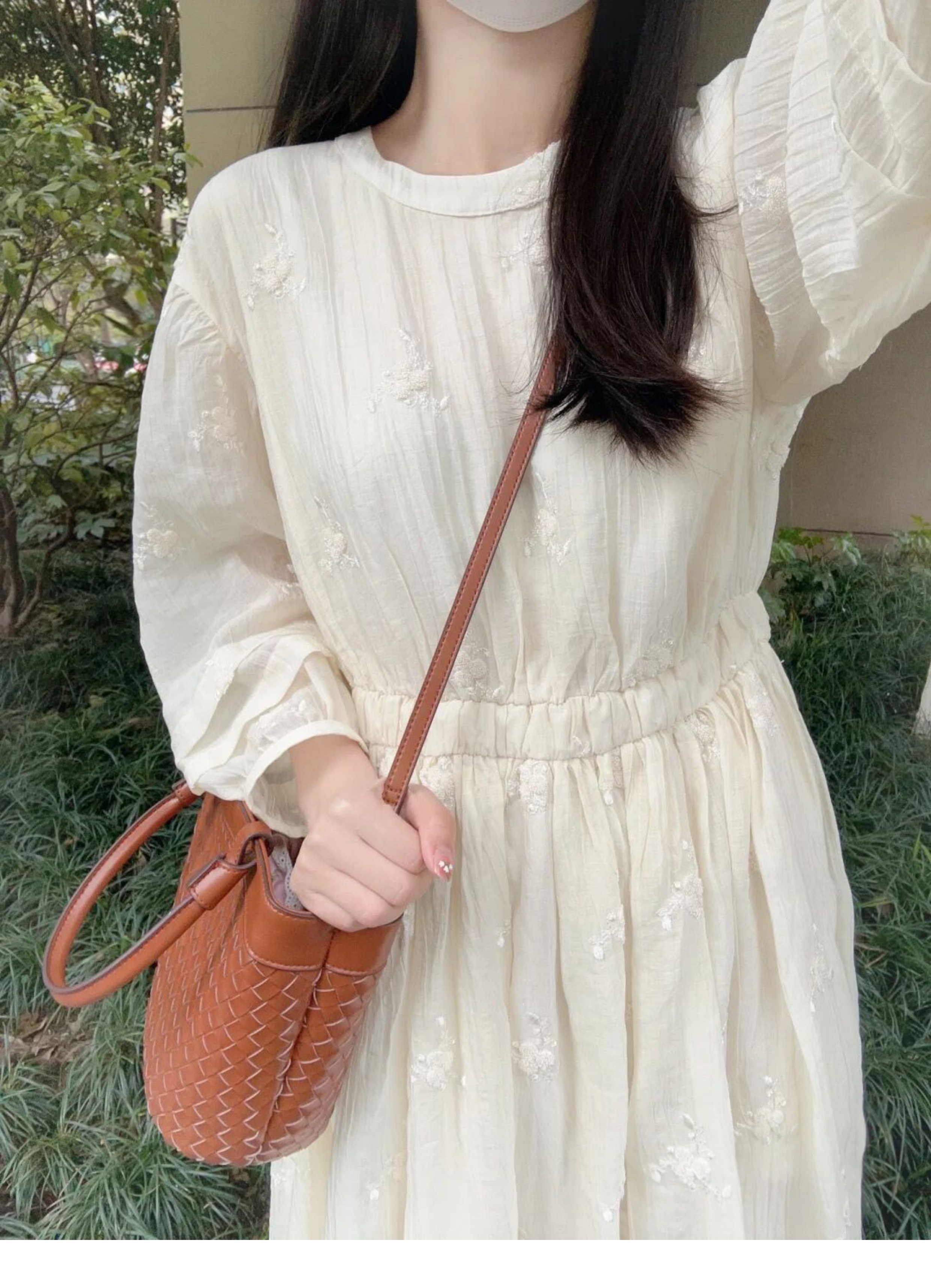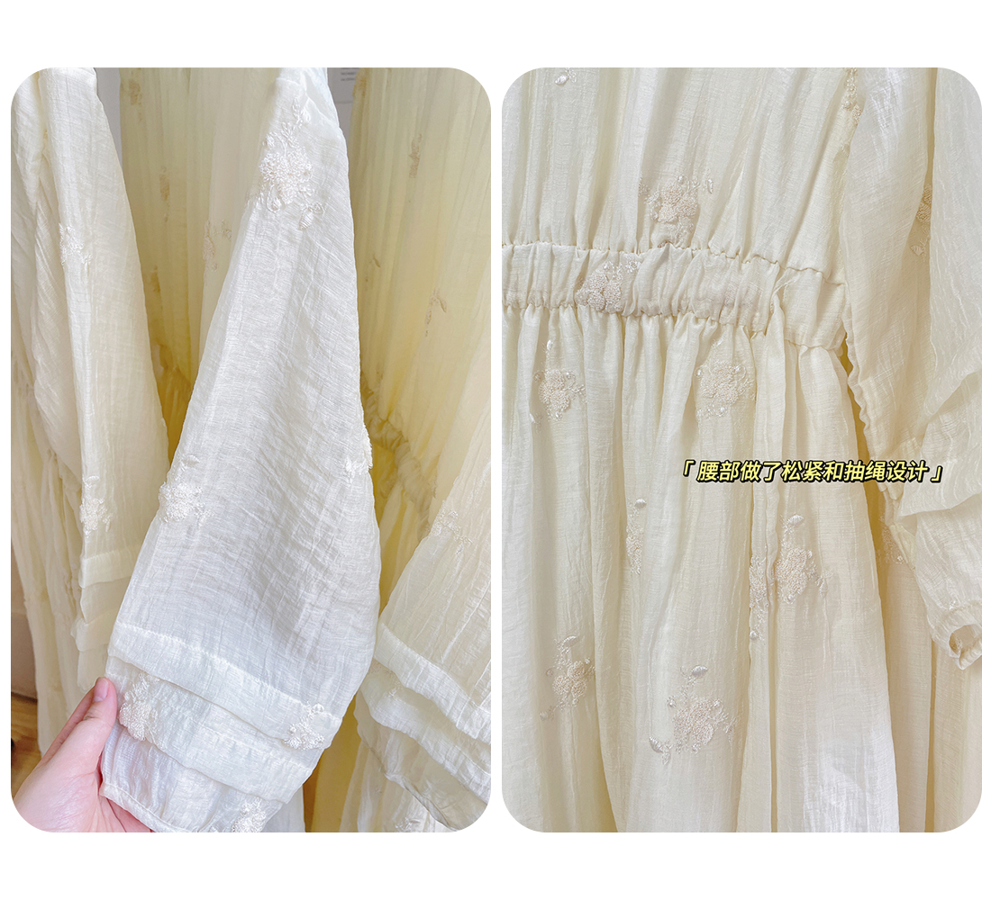 法式重工肌理感刺繡碎花長袖洋裝超仙女秋冬季繫帶收腰氣質長裙