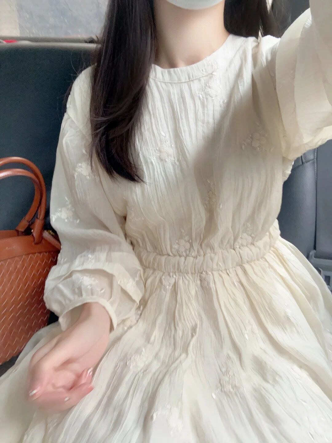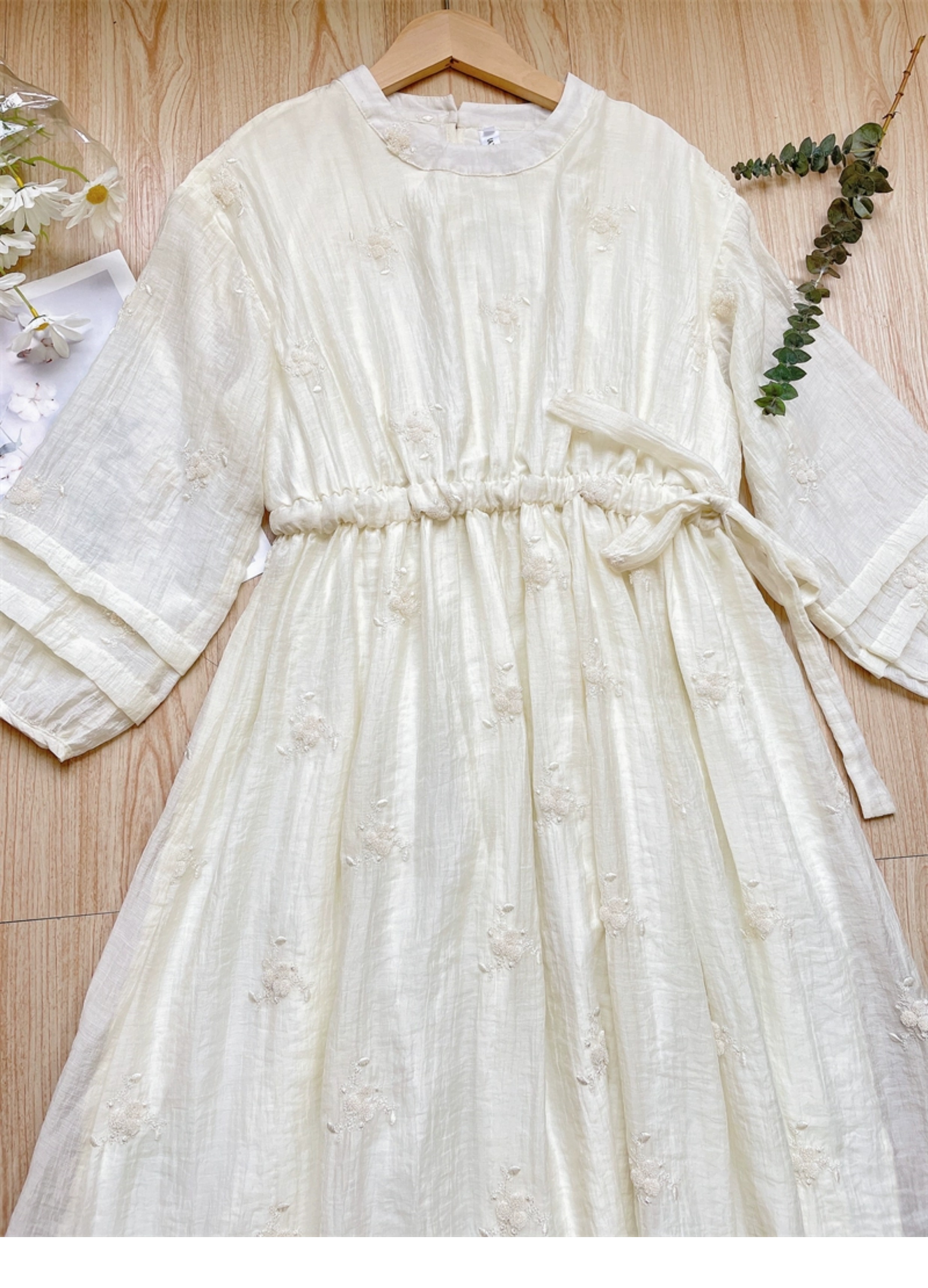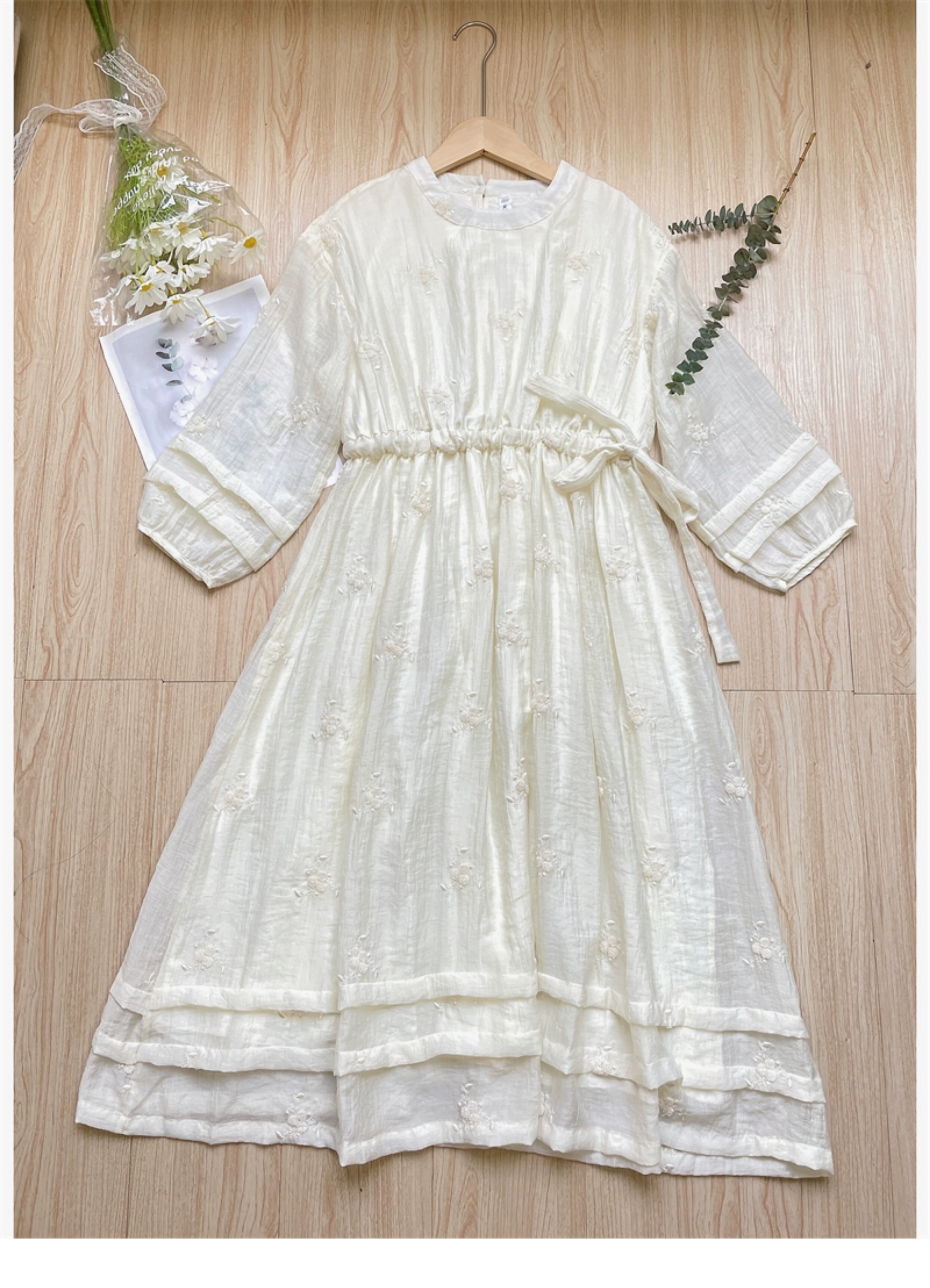法式重工肌理感刺繡碎花長袖洋裝超仙女秋冬季繫帶收腰氣質長裙