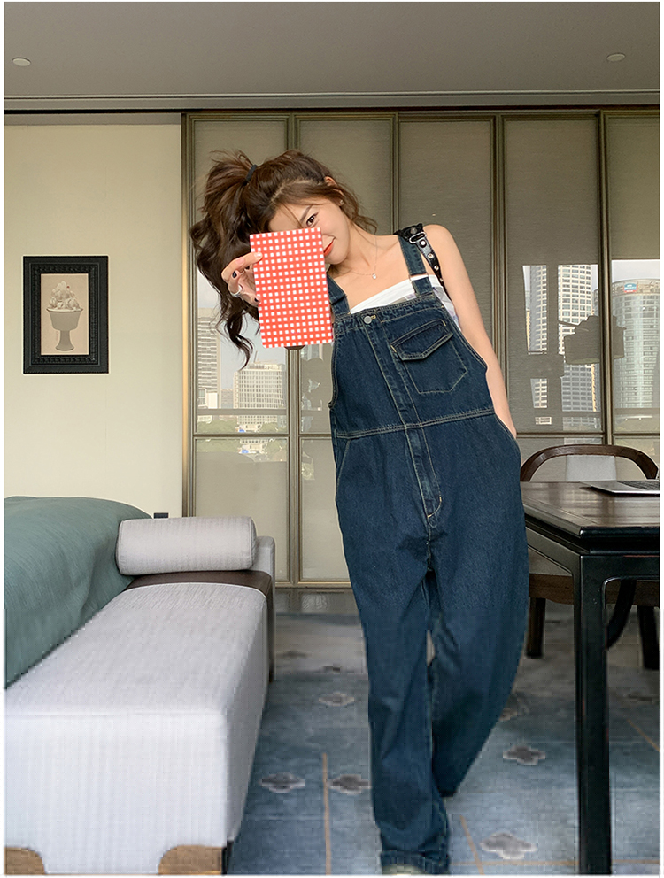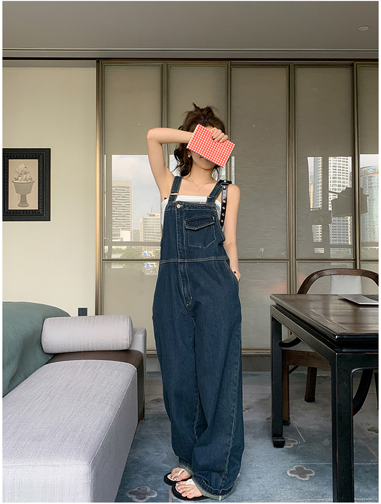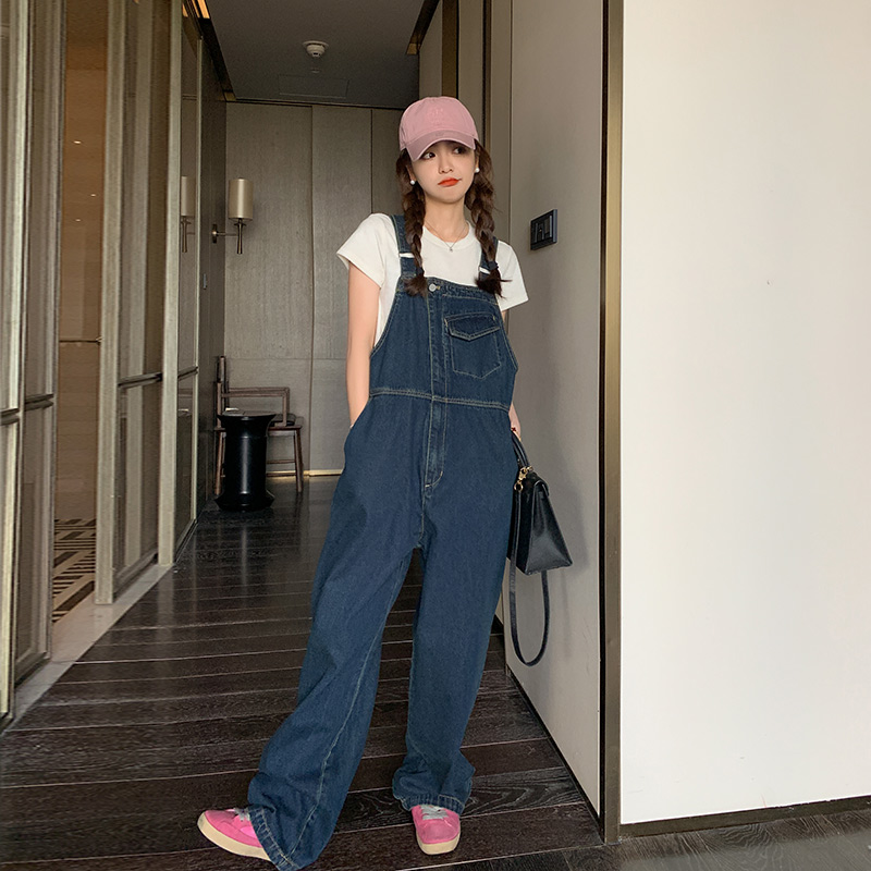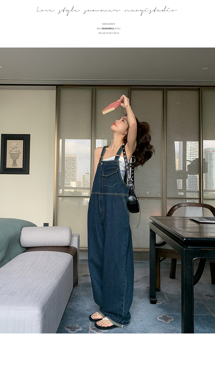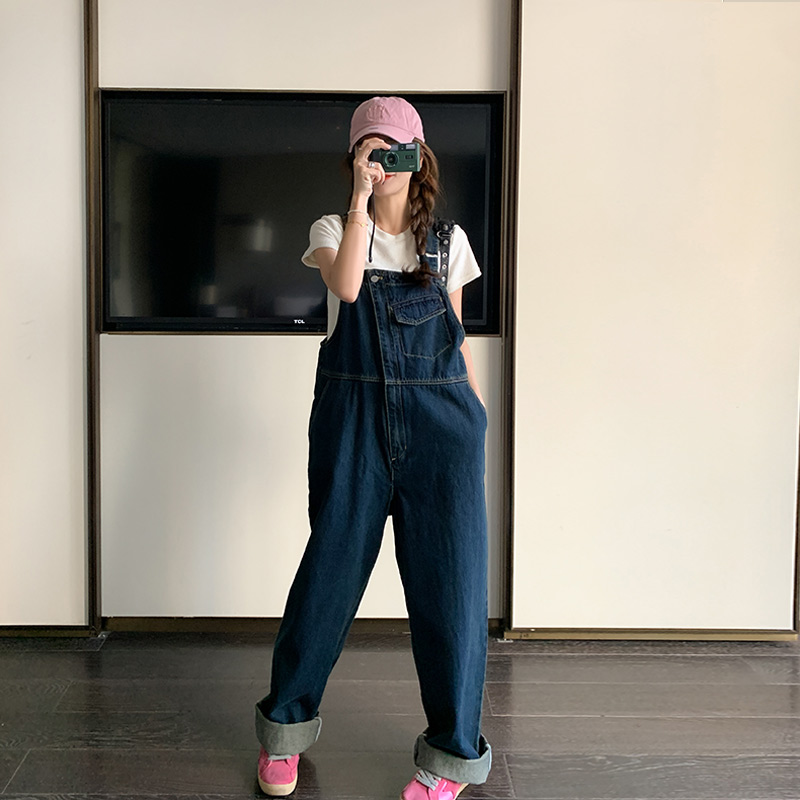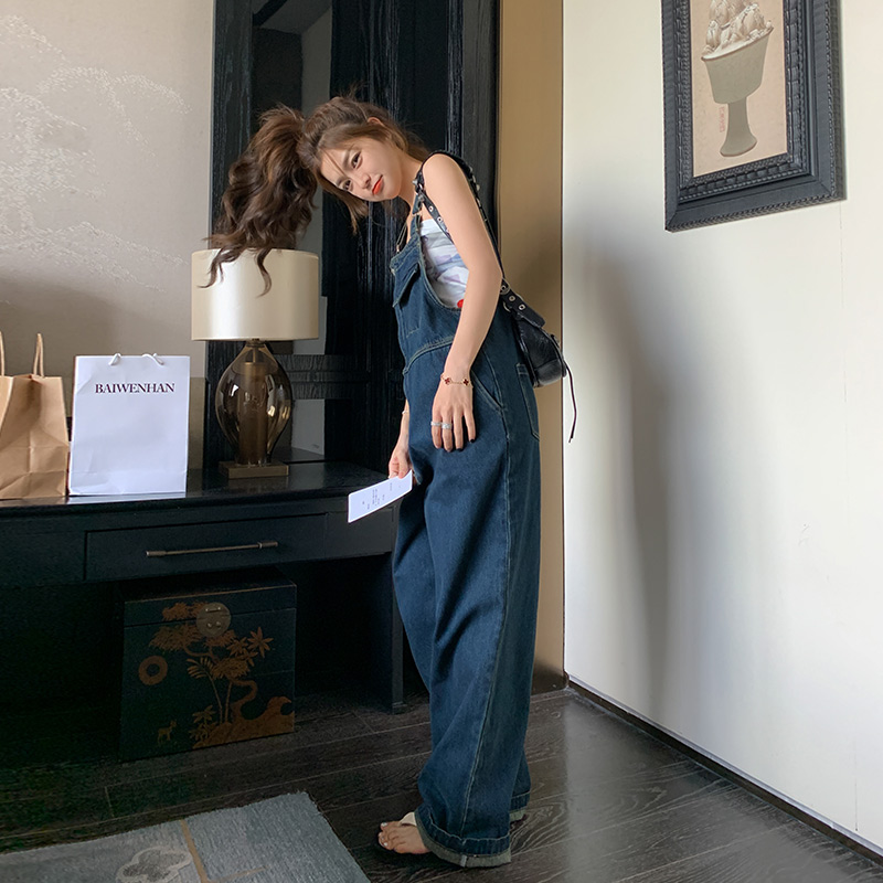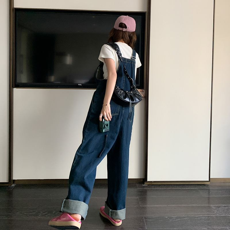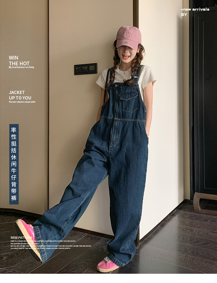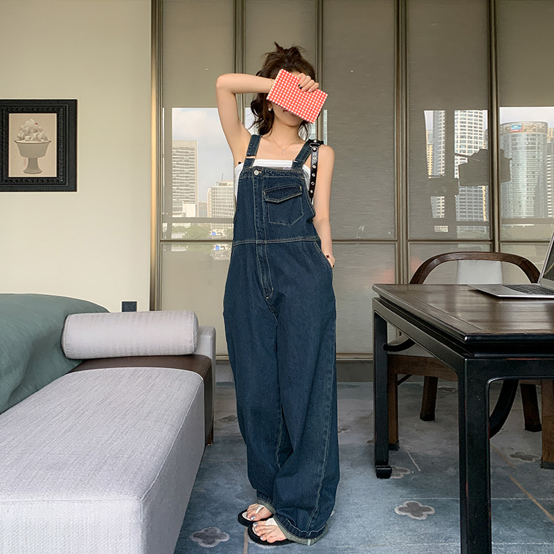 網紅直筒牛仔抱嬰袋褲女夏2023新款韓版高腰顯瘦闊腿垂感連身拖地褲