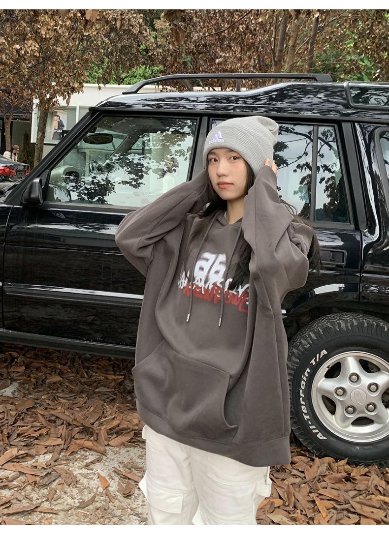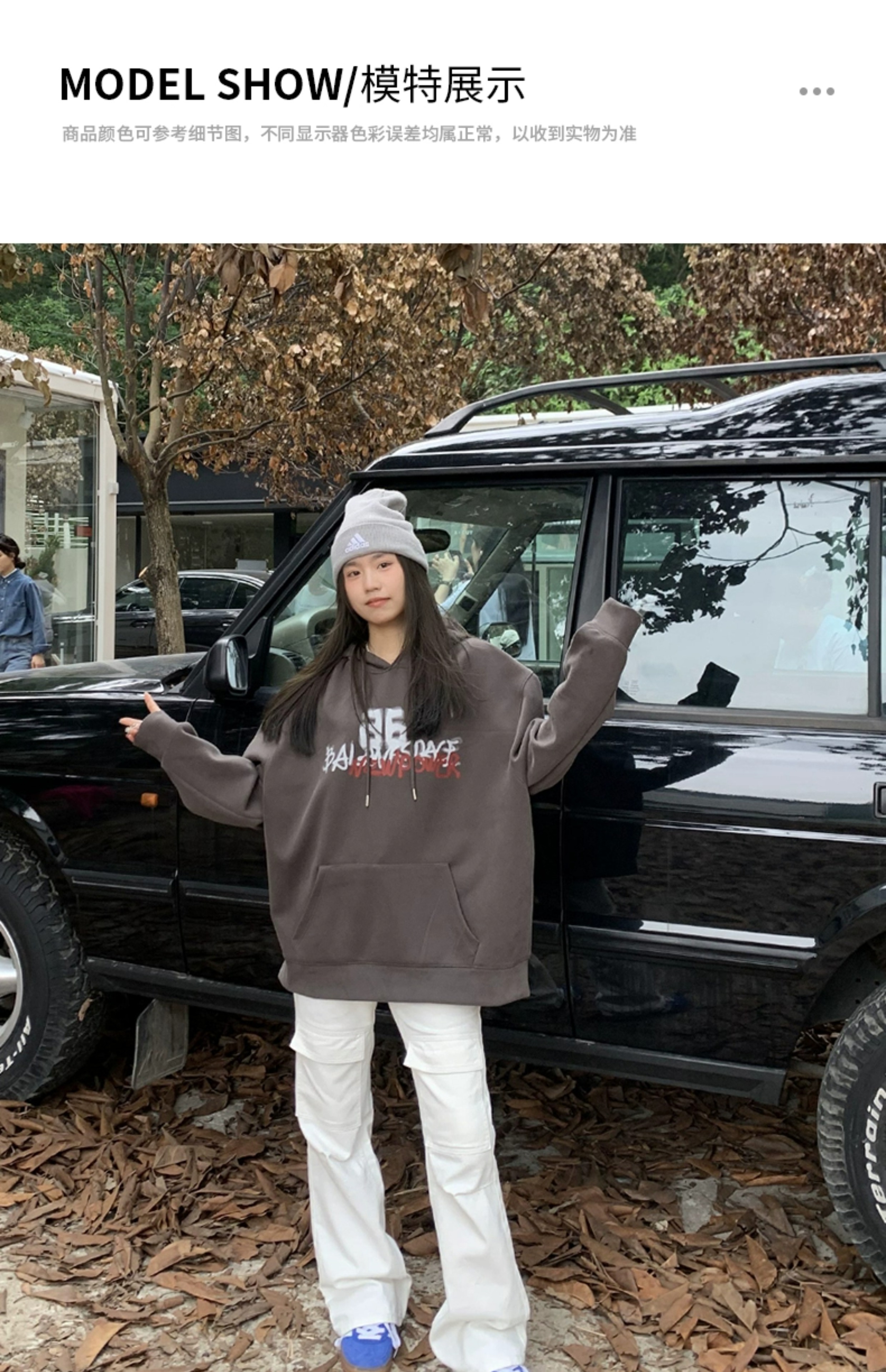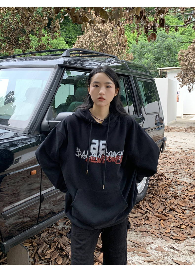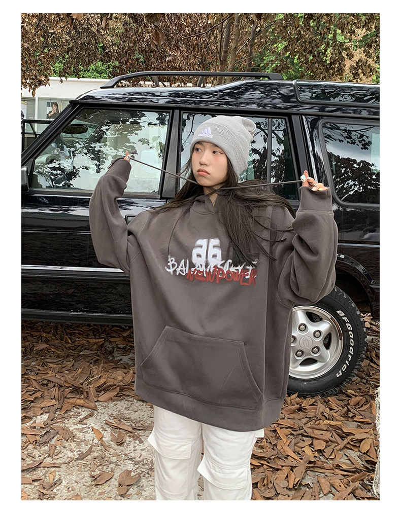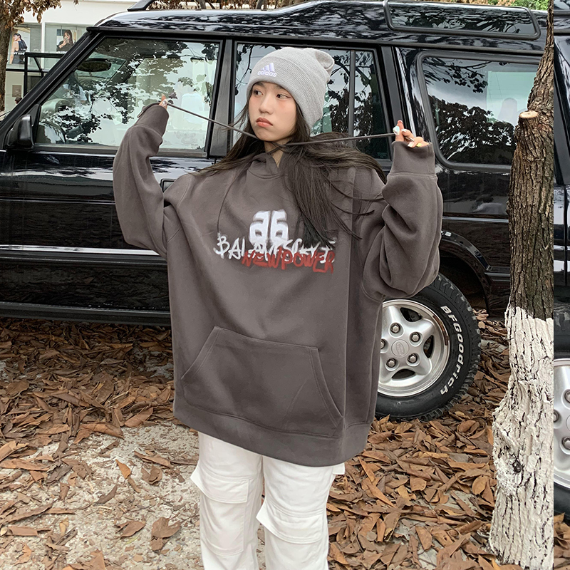 橘子樹在哪兒中性風男女同款連帽運動衫春秋寬鬆深灰色字母印花帽衫