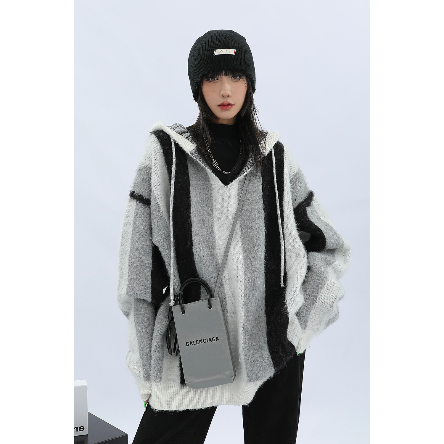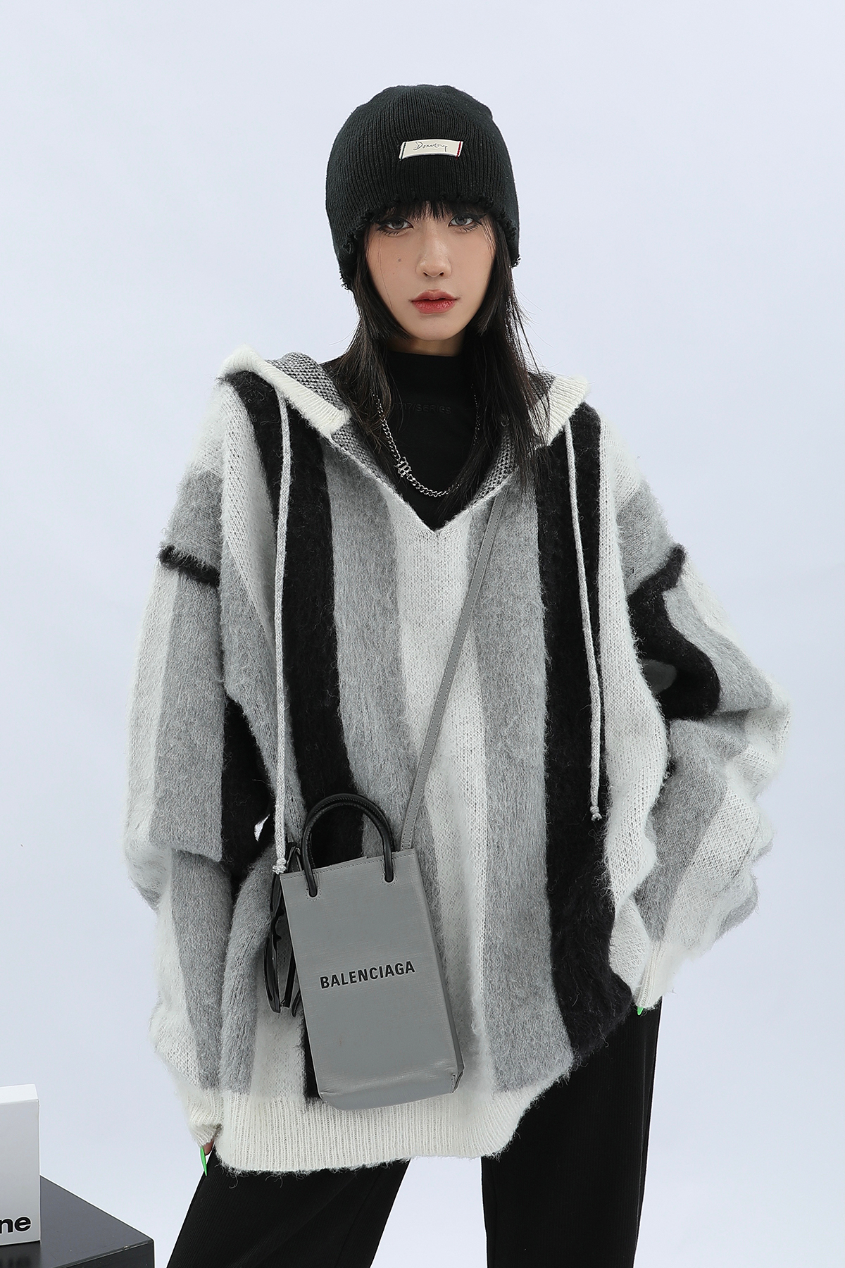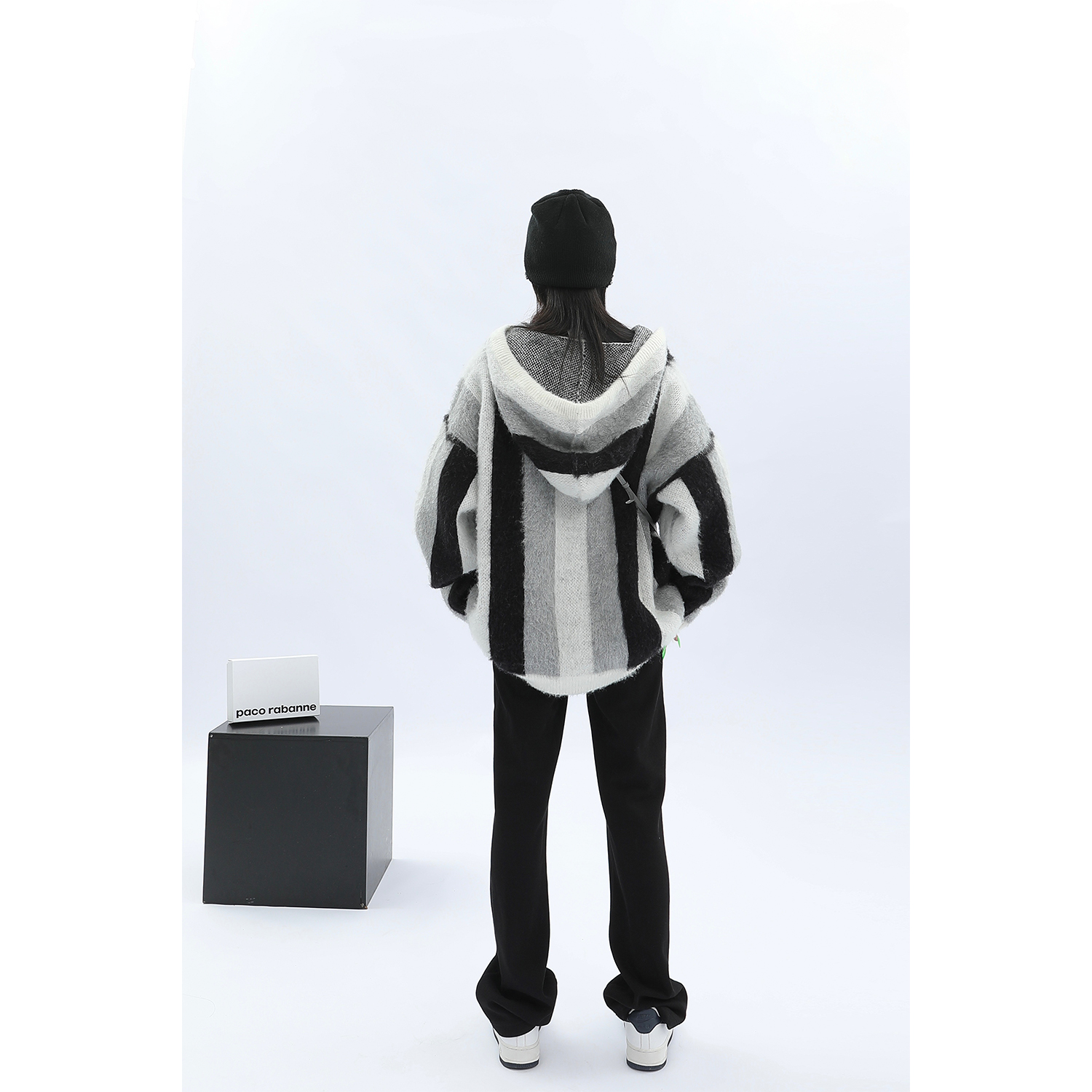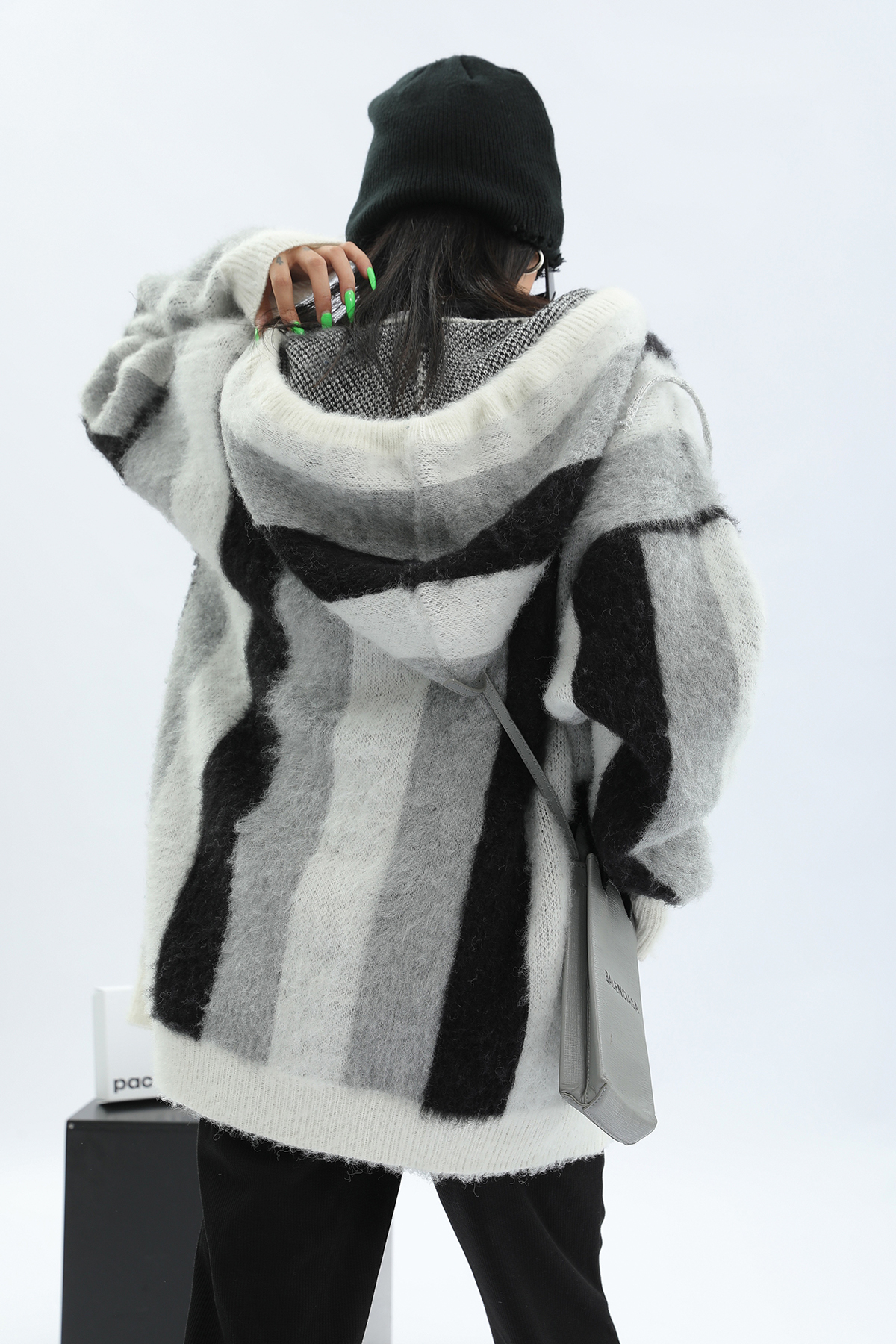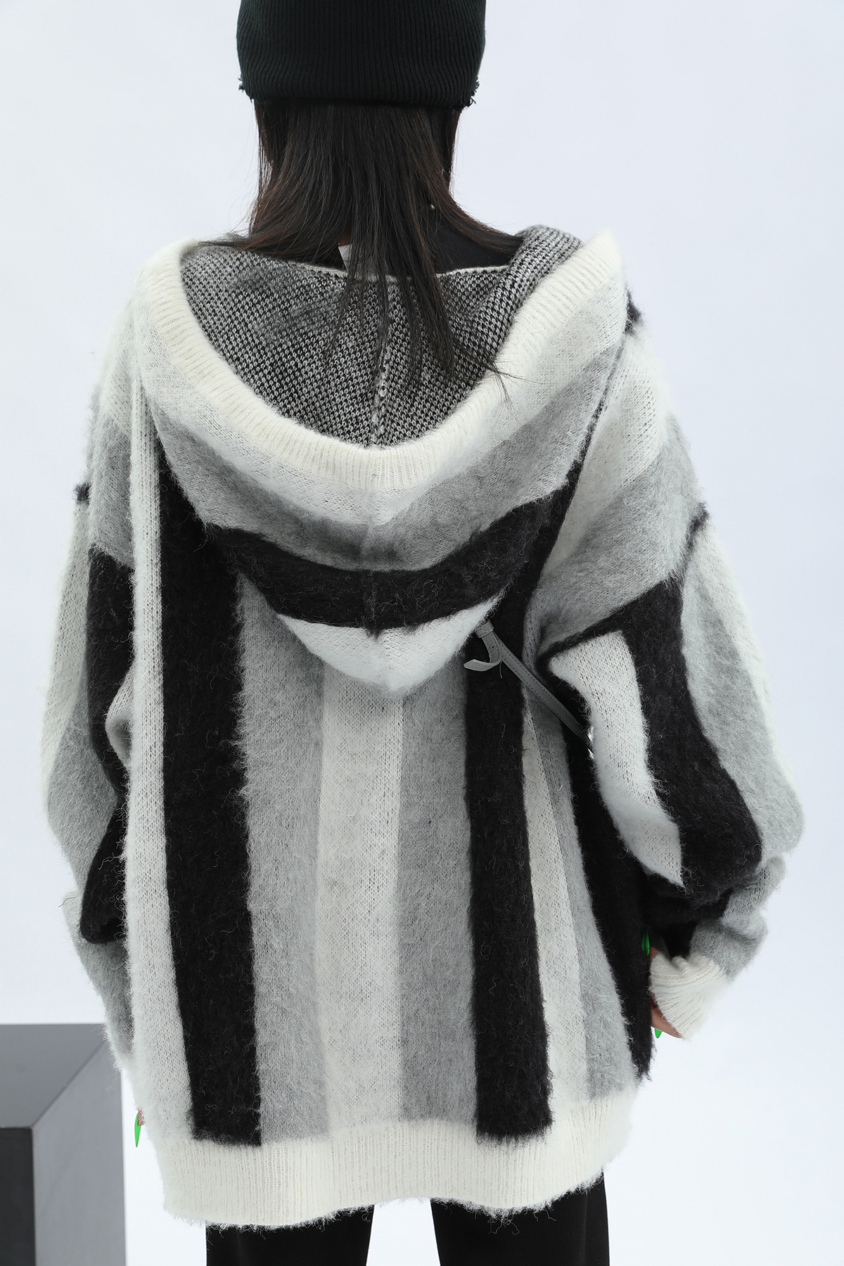 Acestudios 馬海毛連帽毛衣外套女2022春秋設計感條紋外穿針織衫