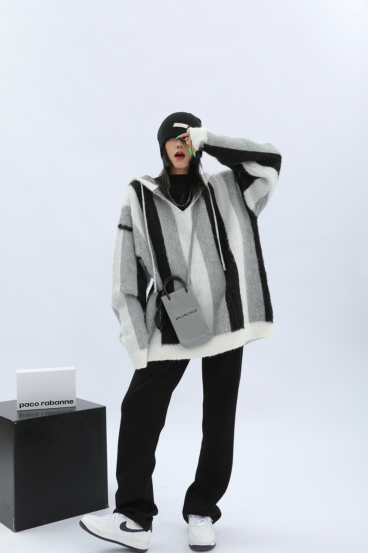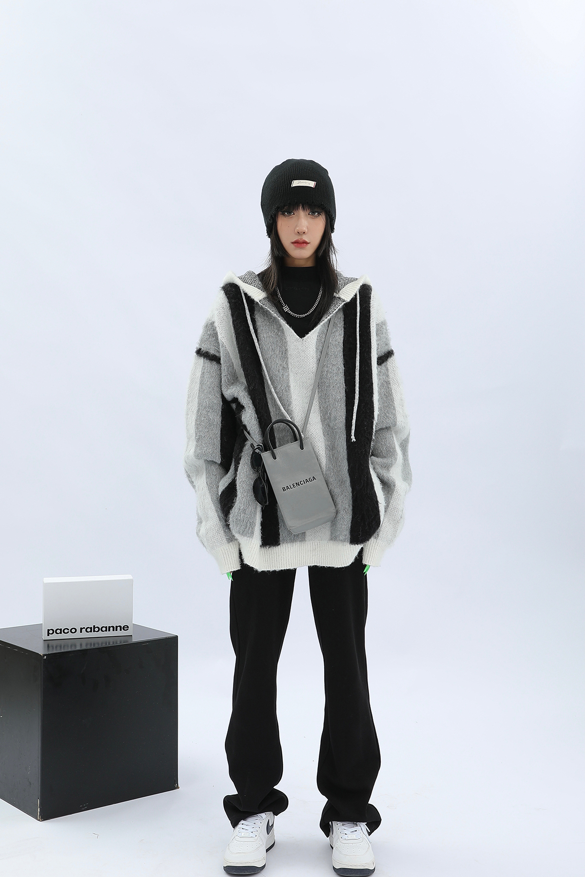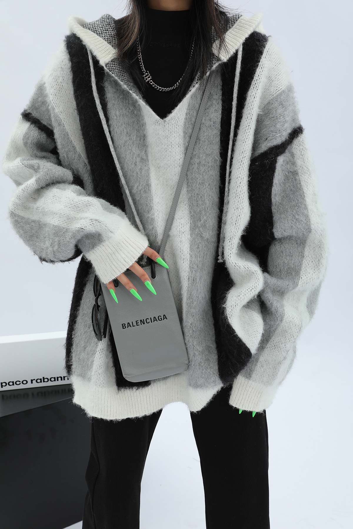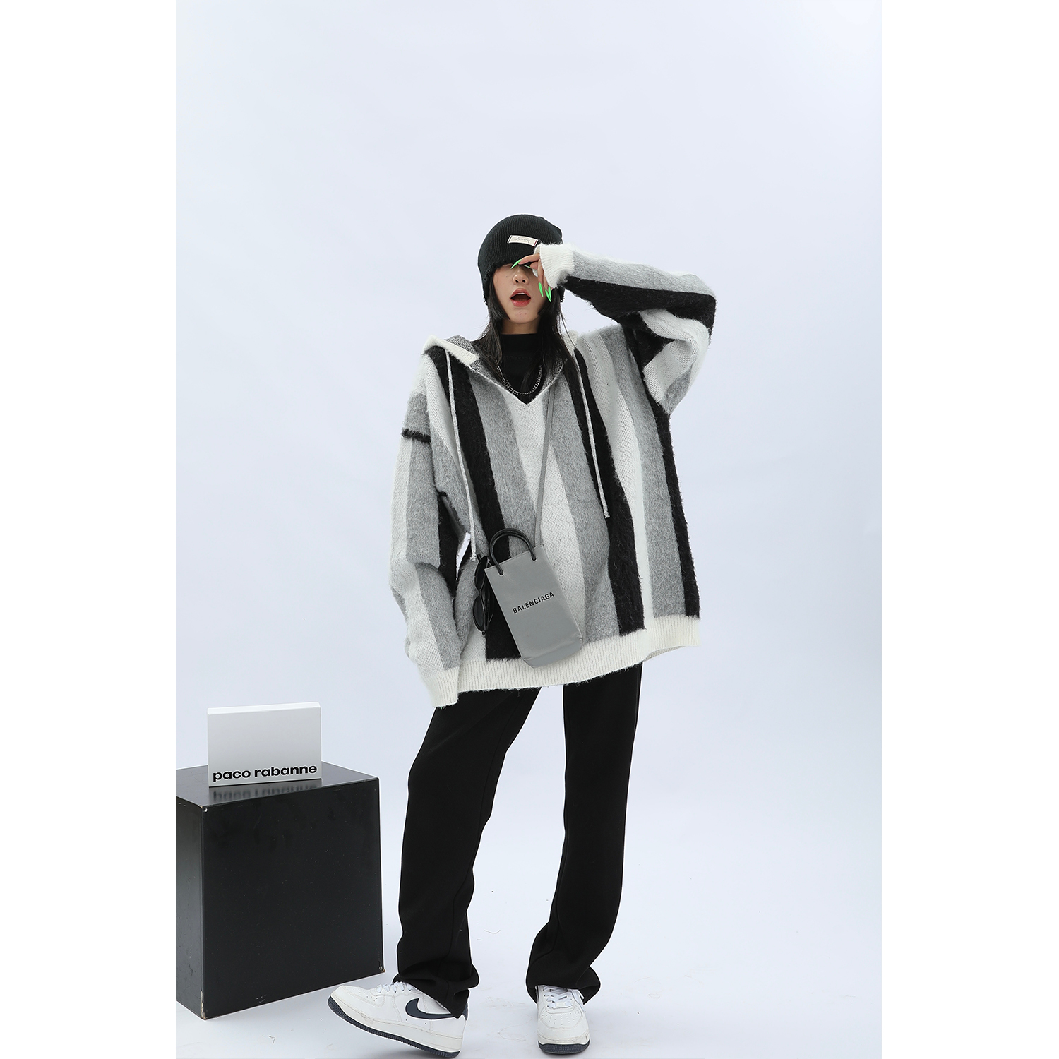 Acestudios 馬海毛連帽毛衣外套女2022春秋設計感條紋外穿針織衫