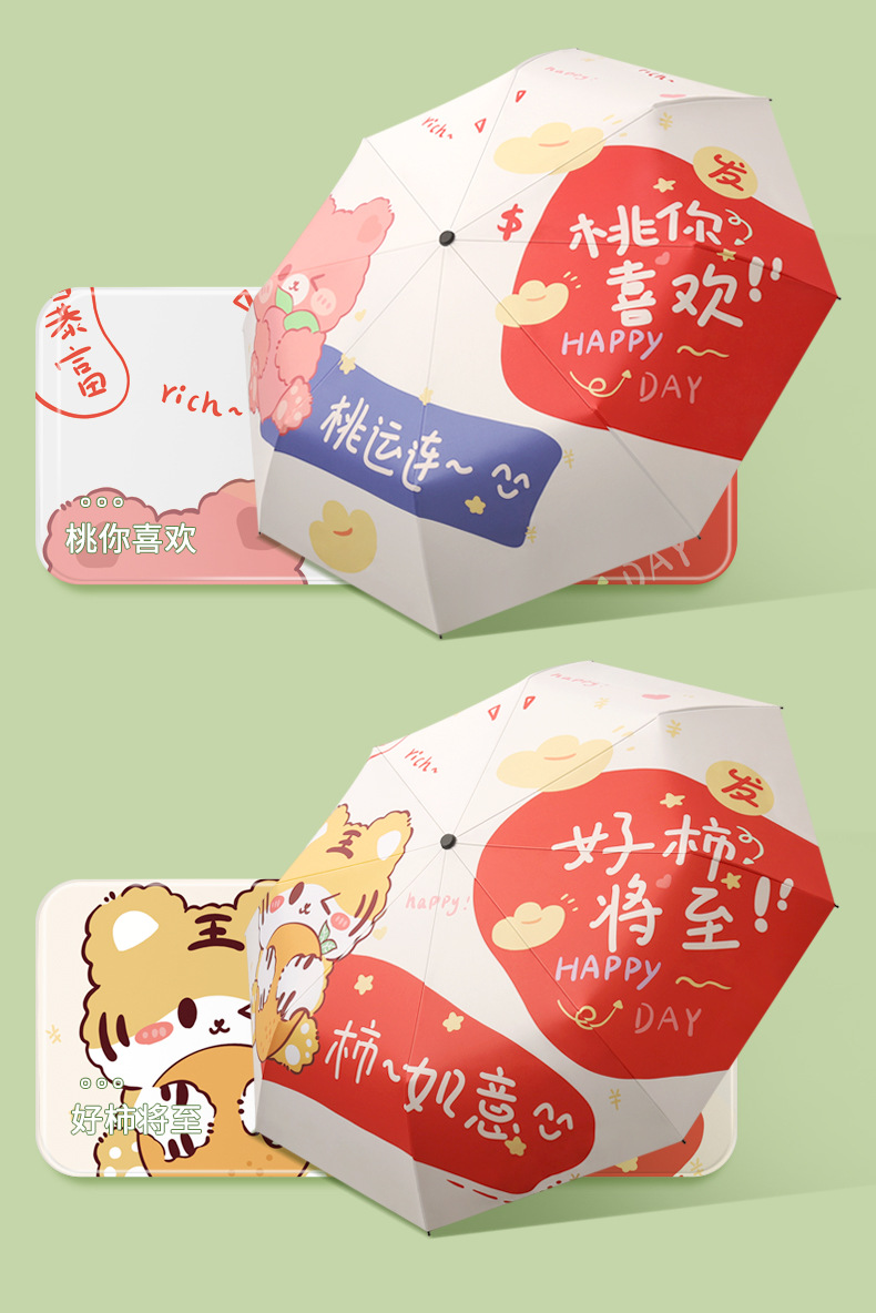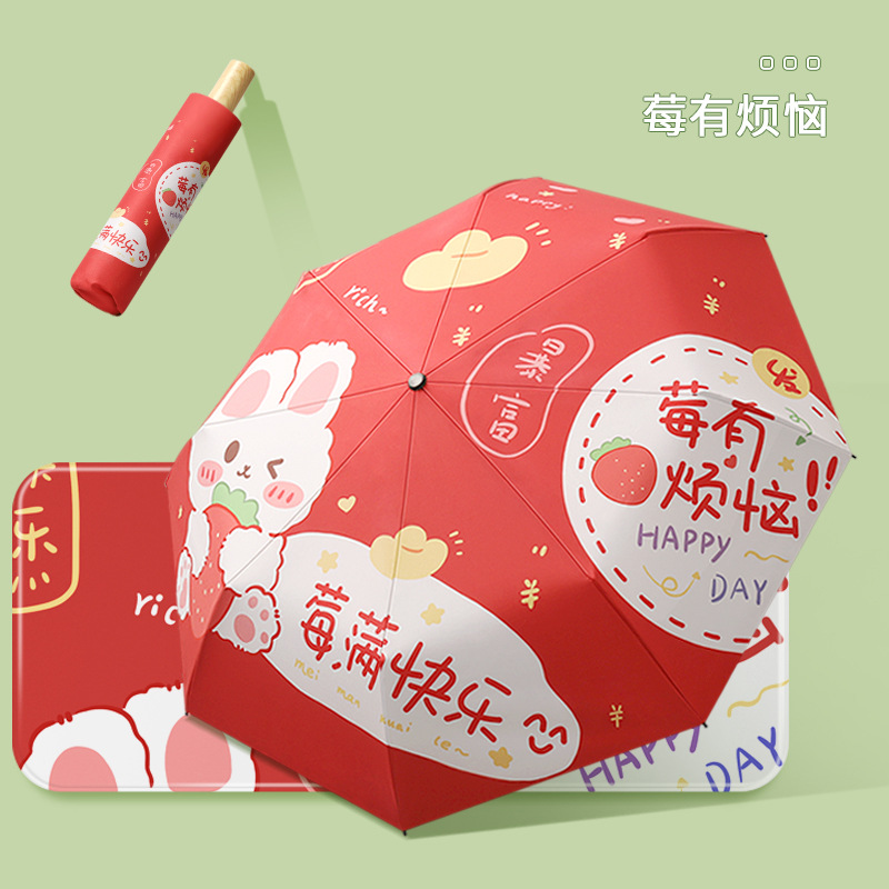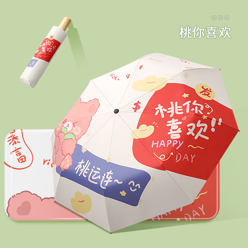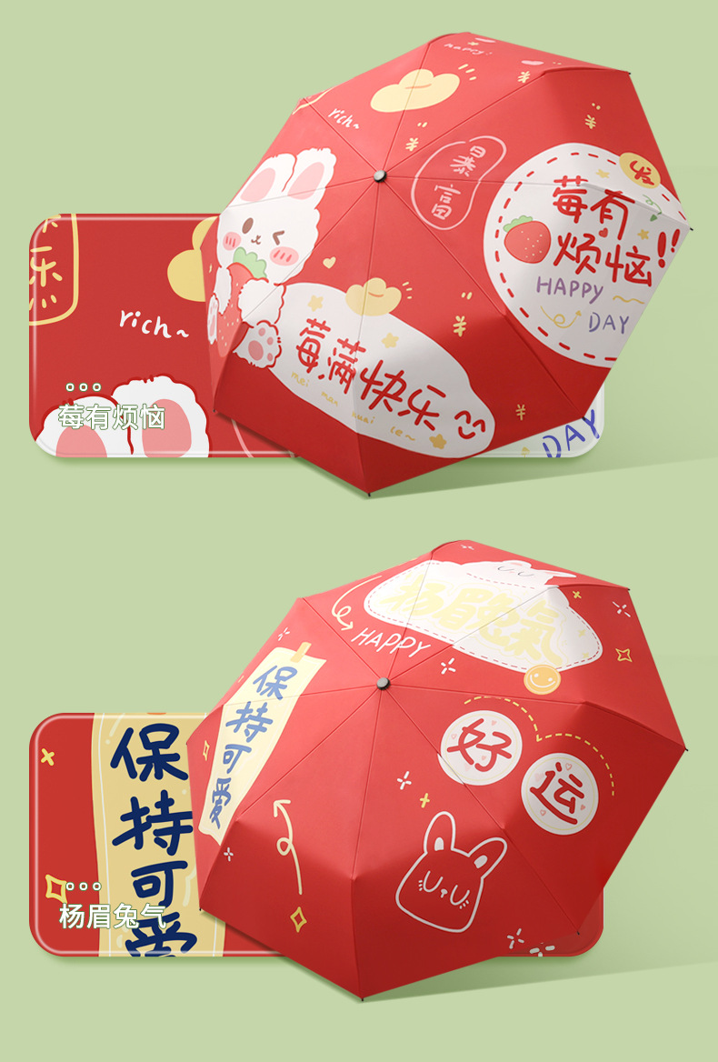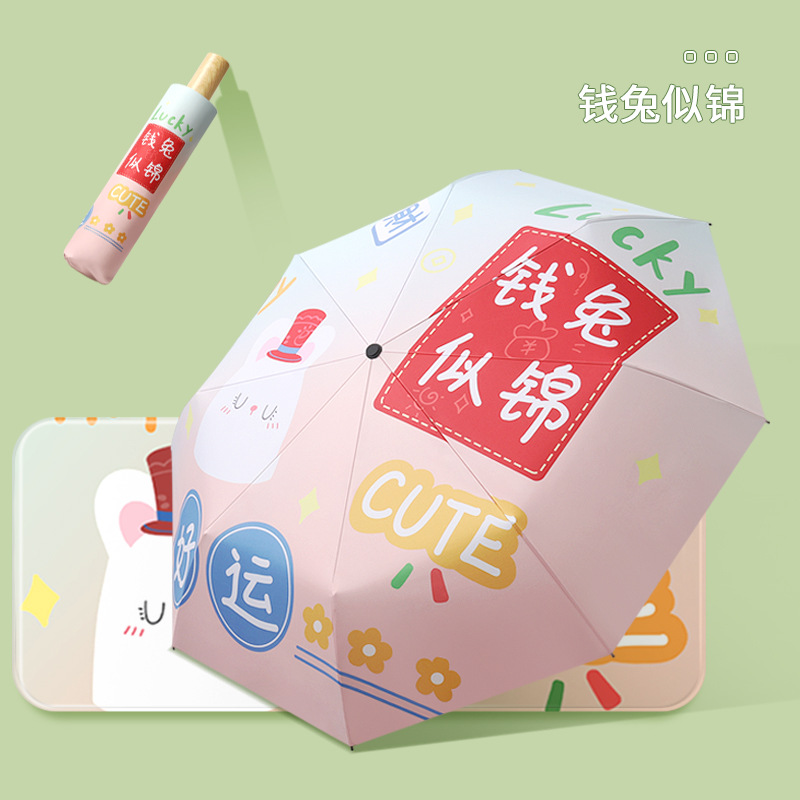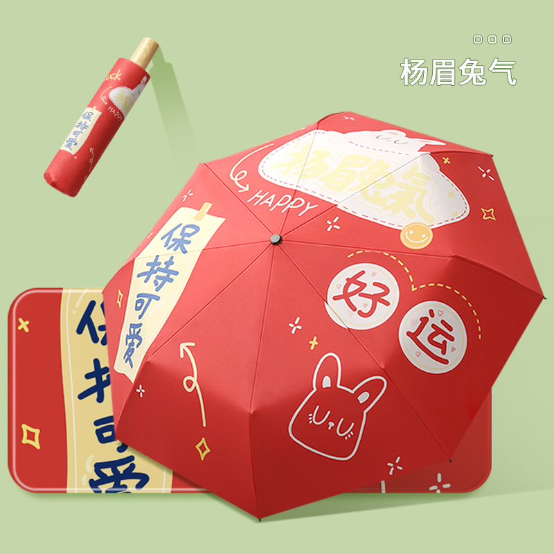 新款现货吉祥兔年黑胶数码印刷插画三折晴雨两用雨伞支持一件代发