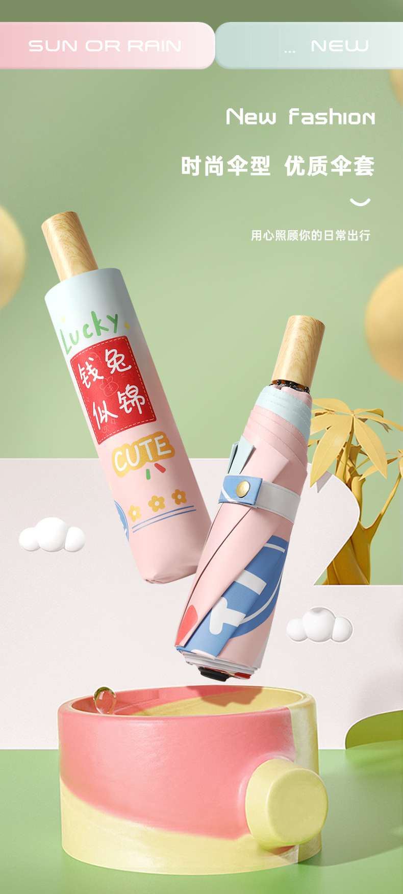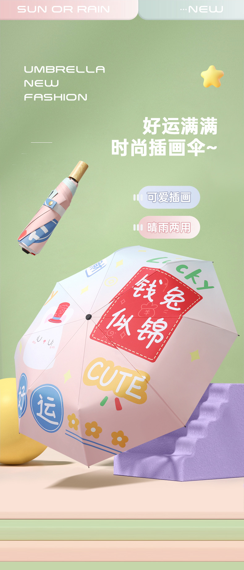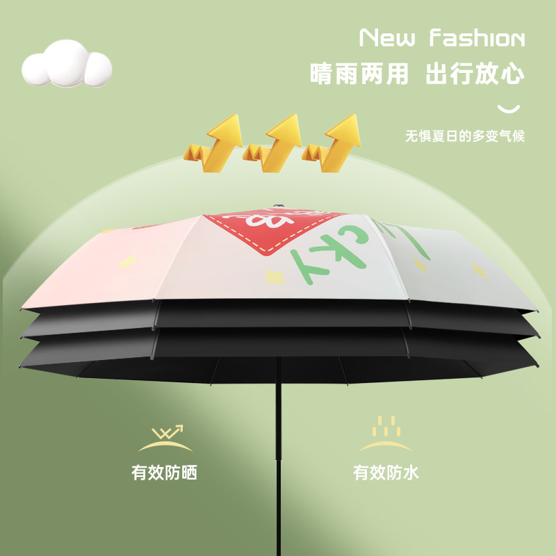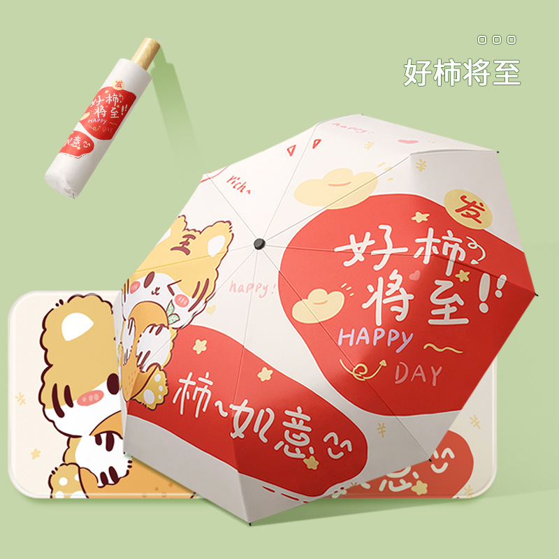 新款现货吉祥兔年黑胶数码印刷插画三折晴雨两用雨伞支持一件代发