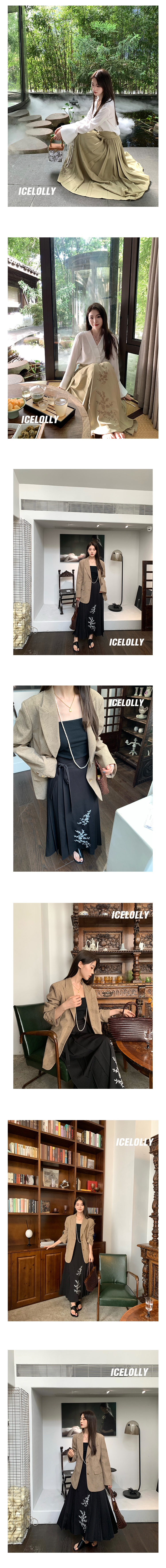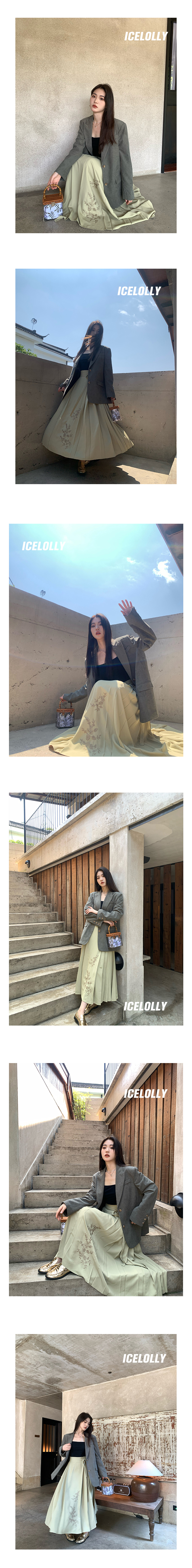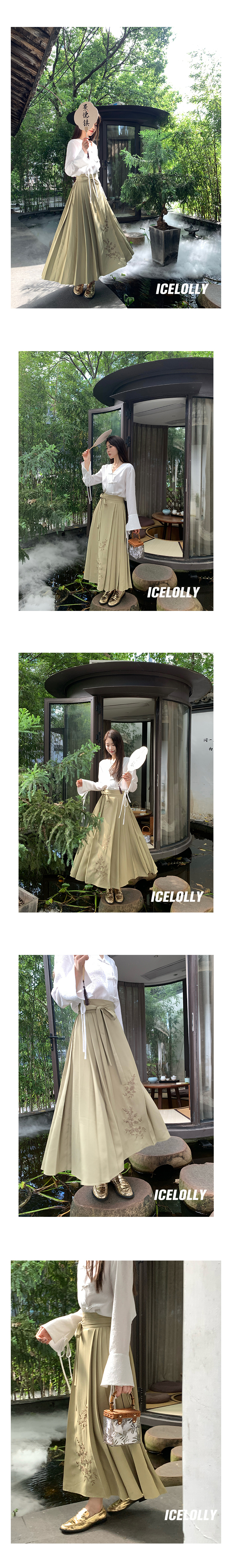 ICELOLLY綠色新中式國風高腰長裙半身裙女新款馬面裙秋季漢服裙子