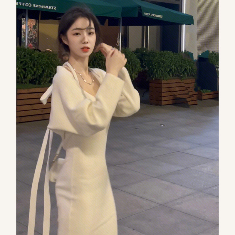 修身顯瘦純欲法式桔梗兩件套掛頸吊帶白色針織包臀連衣裙小眾設計