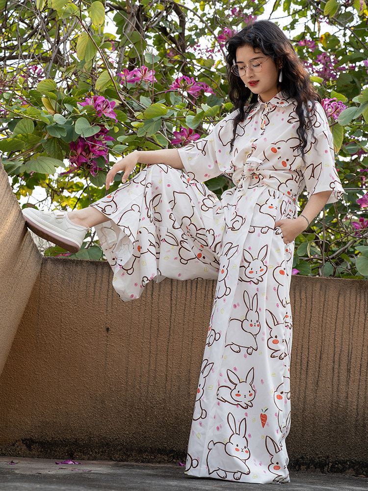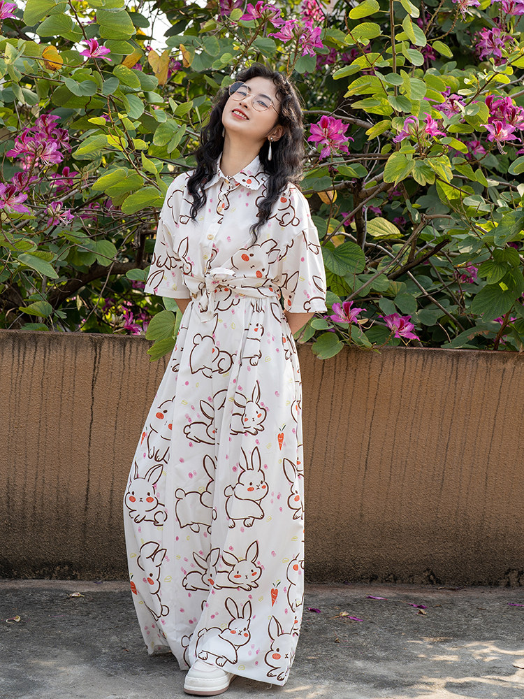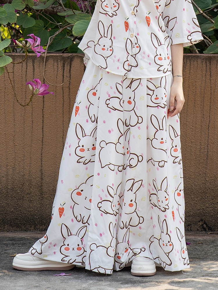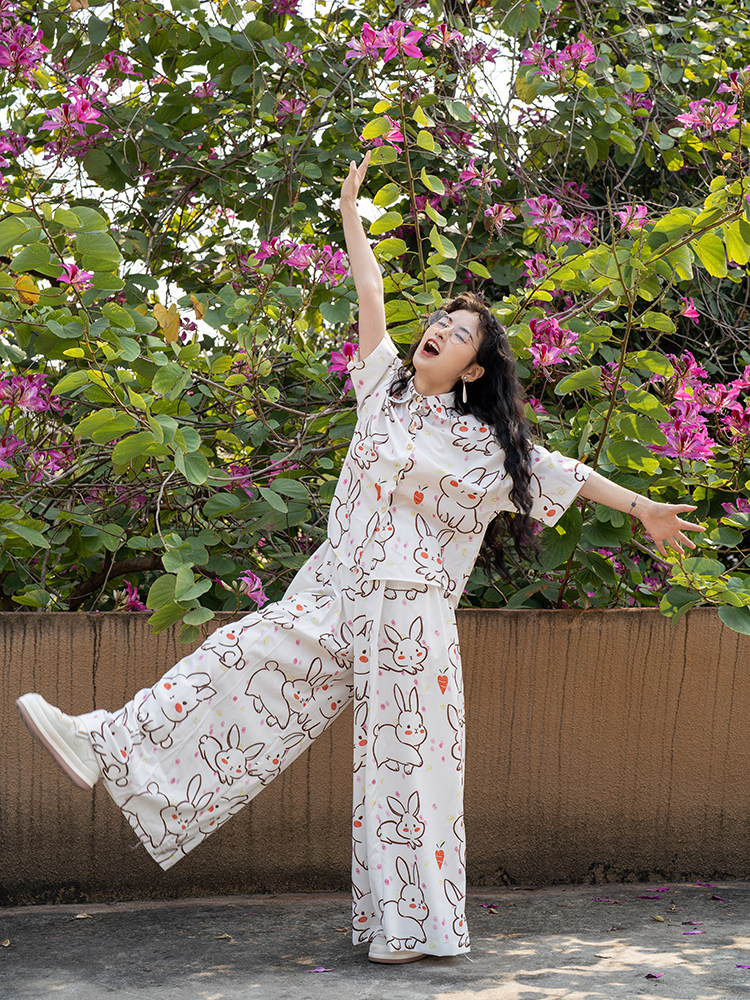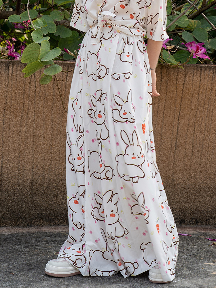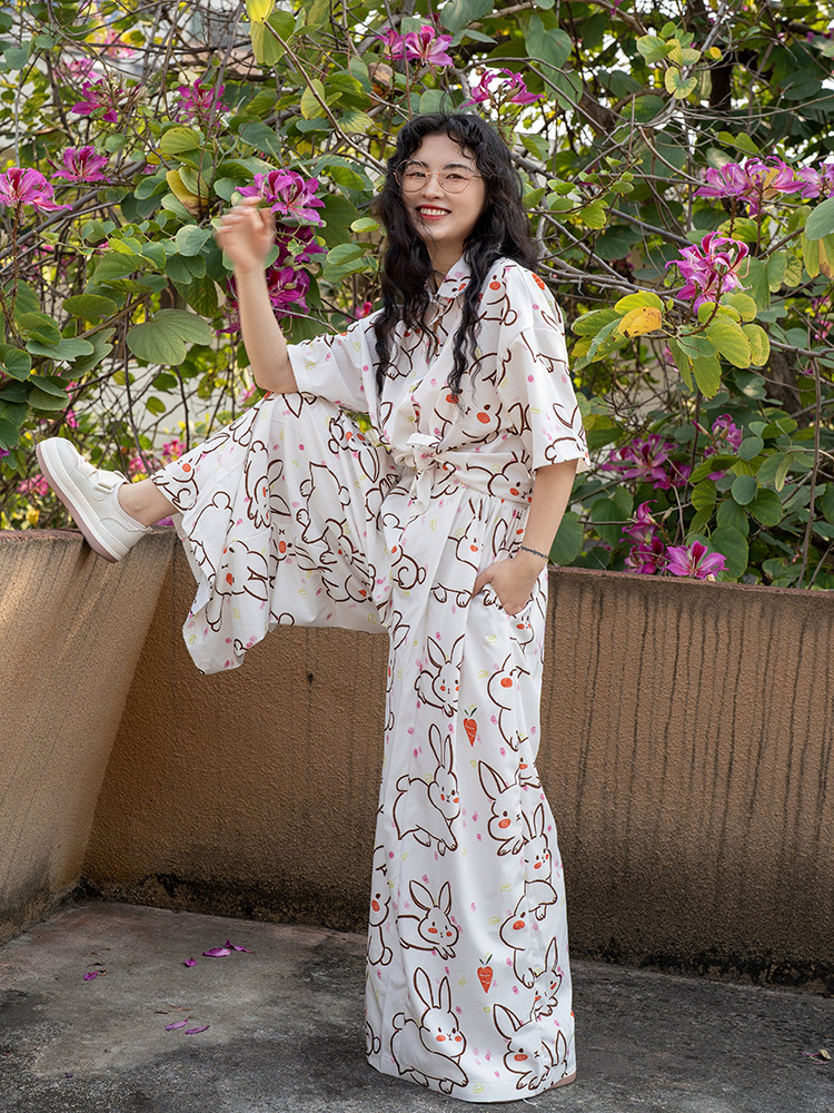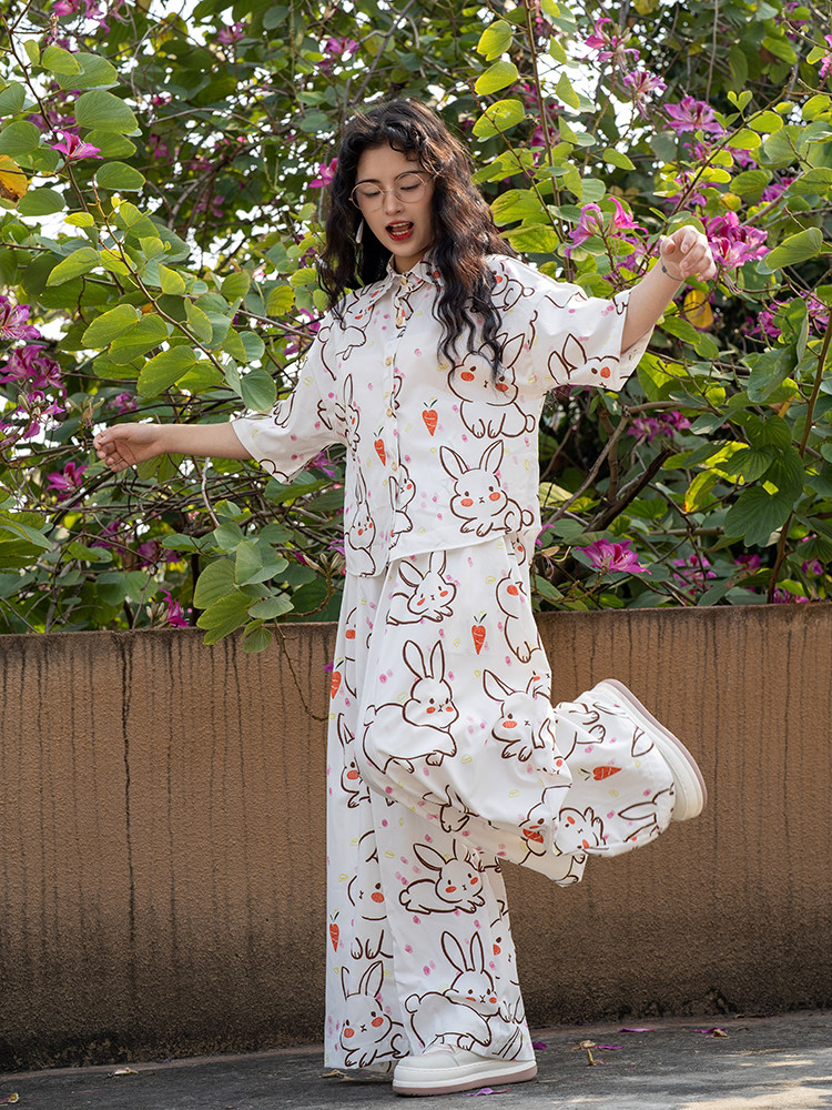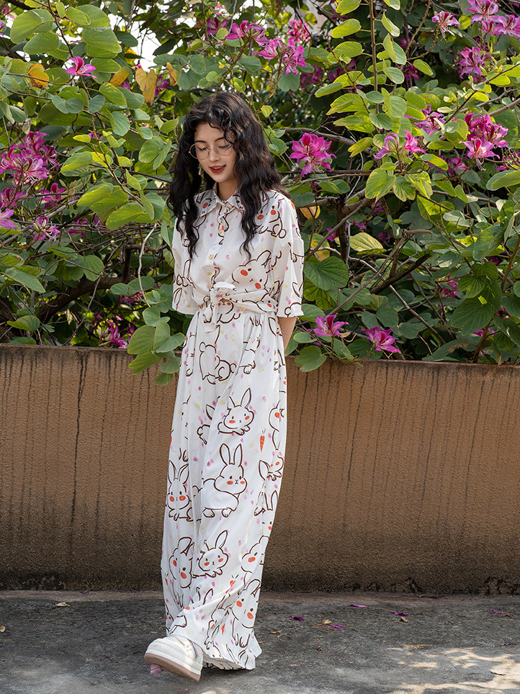 PINKWINK小星夜 夏季原創小兔印花長版復古寬鬆休閒褲女長褲子