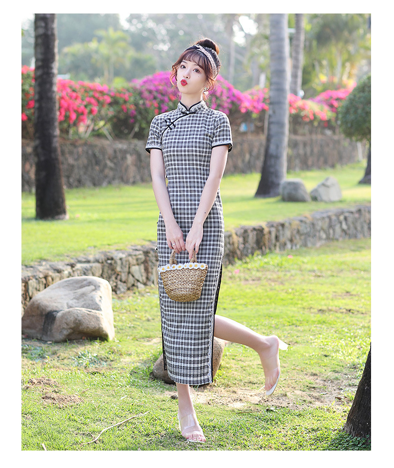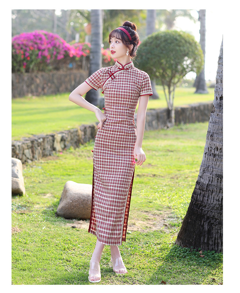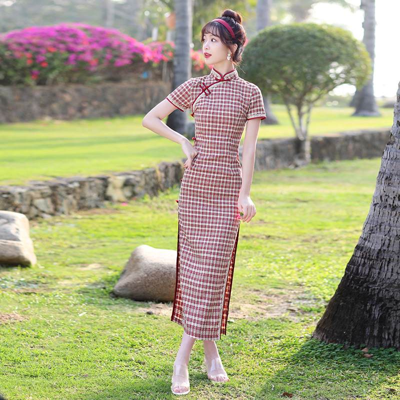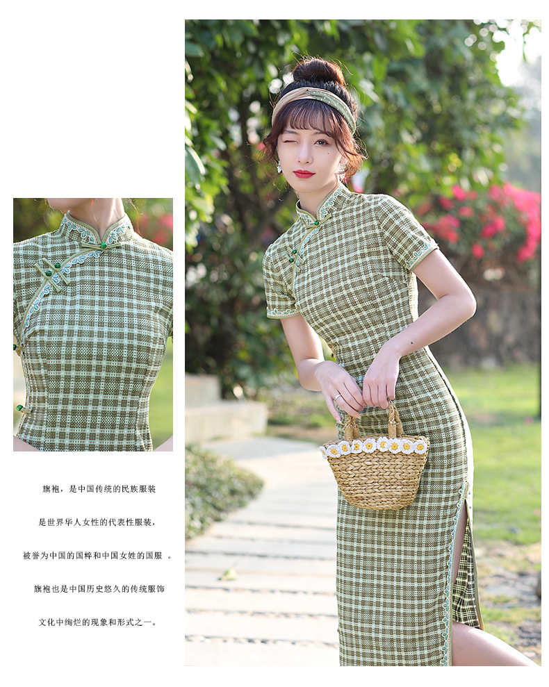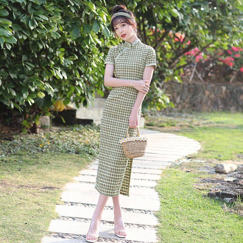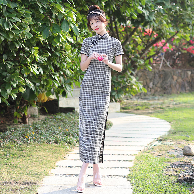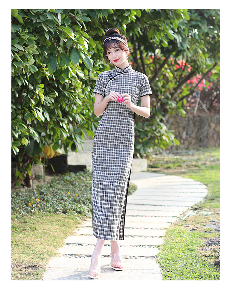 改良旗袍 长款复古中国风文艺格子修身演出弹力旗袍 少女款连衣裙