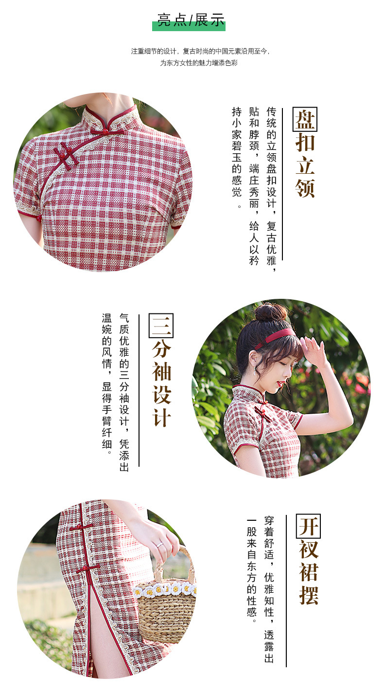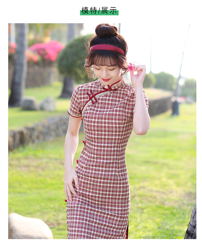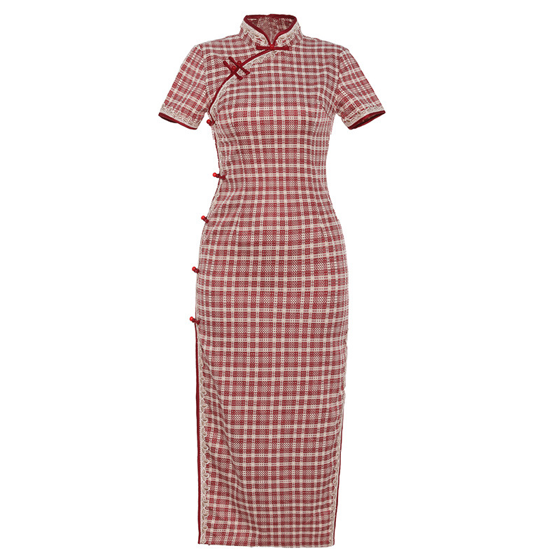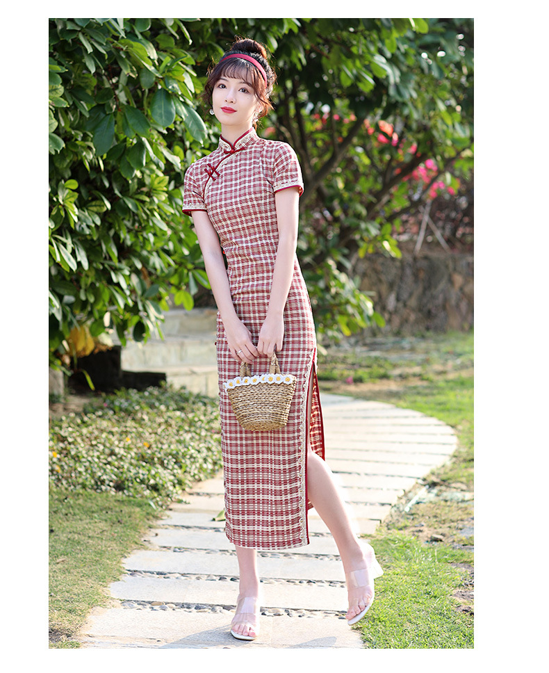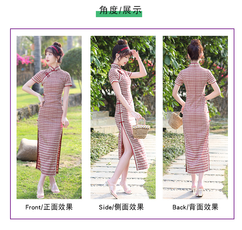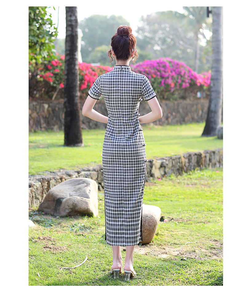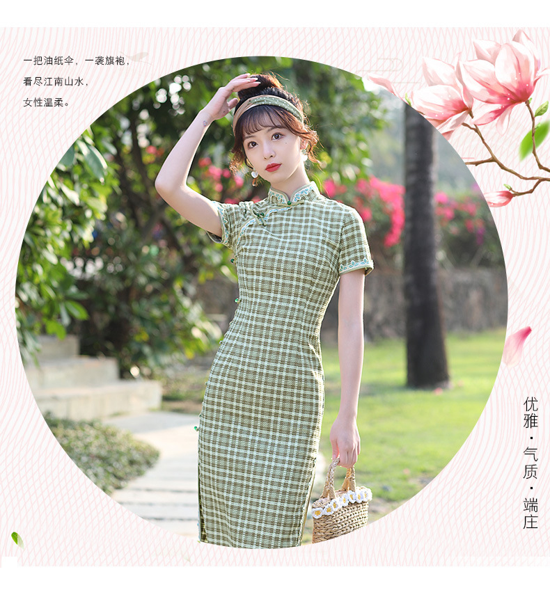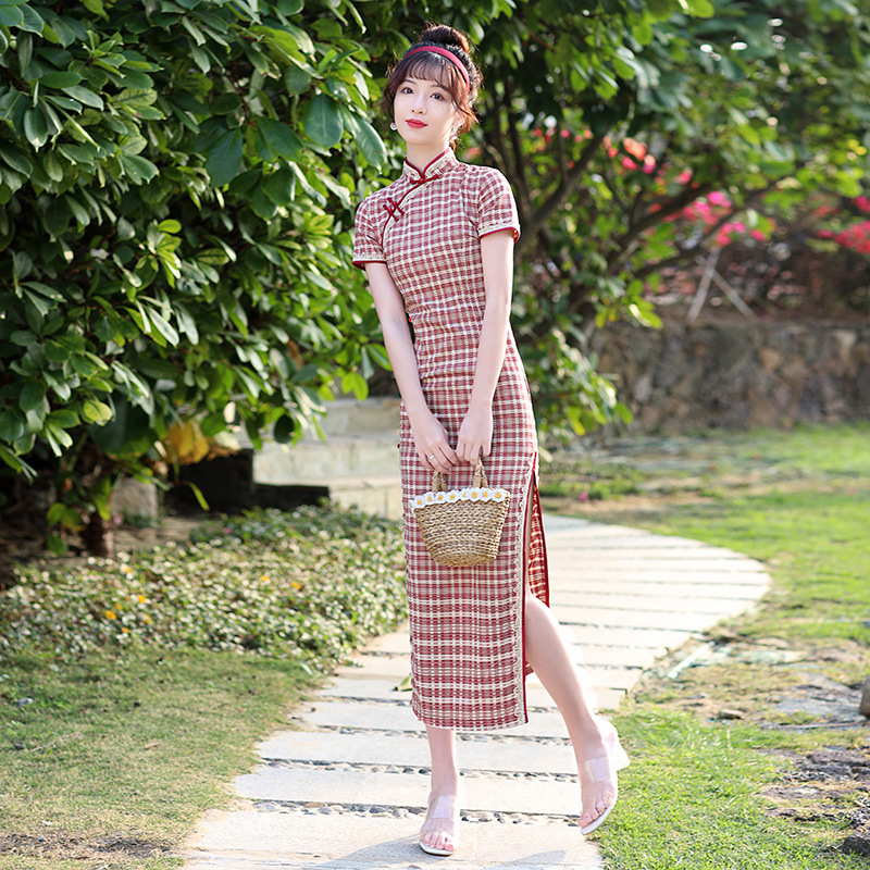 改良旗袍 长款复古中国风文艺格子修身演出弹力旗袍 少女款连衣裙