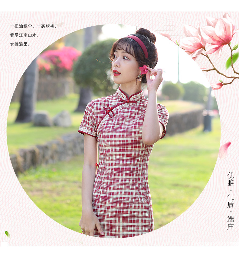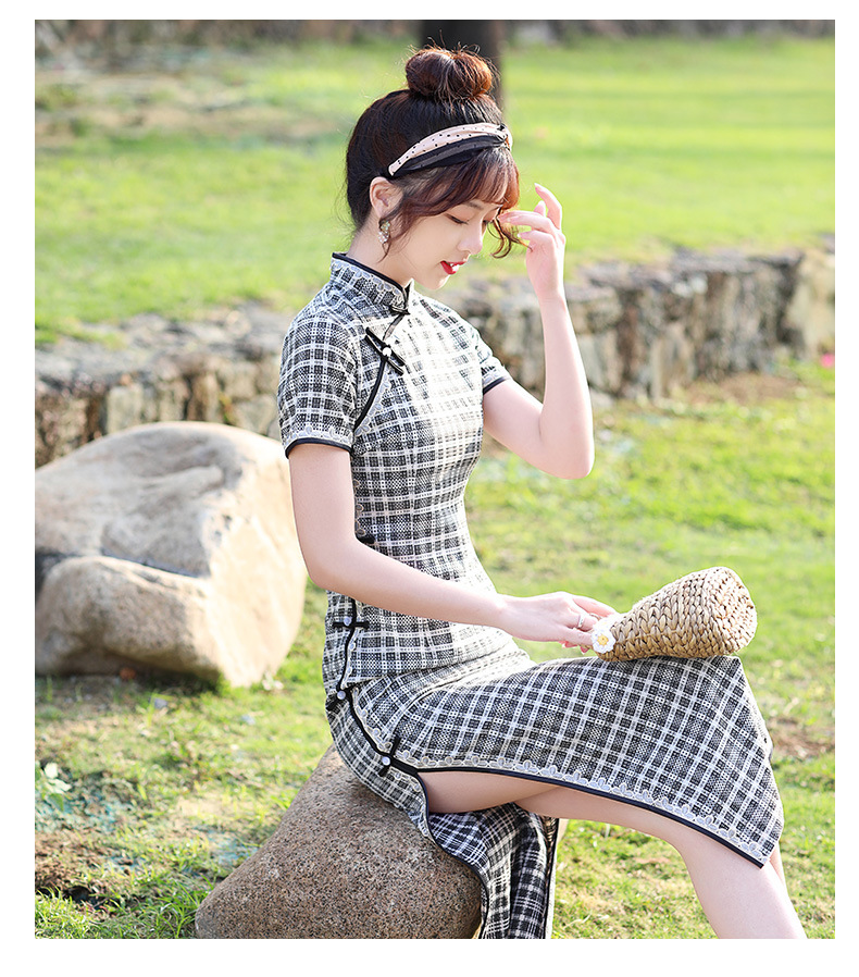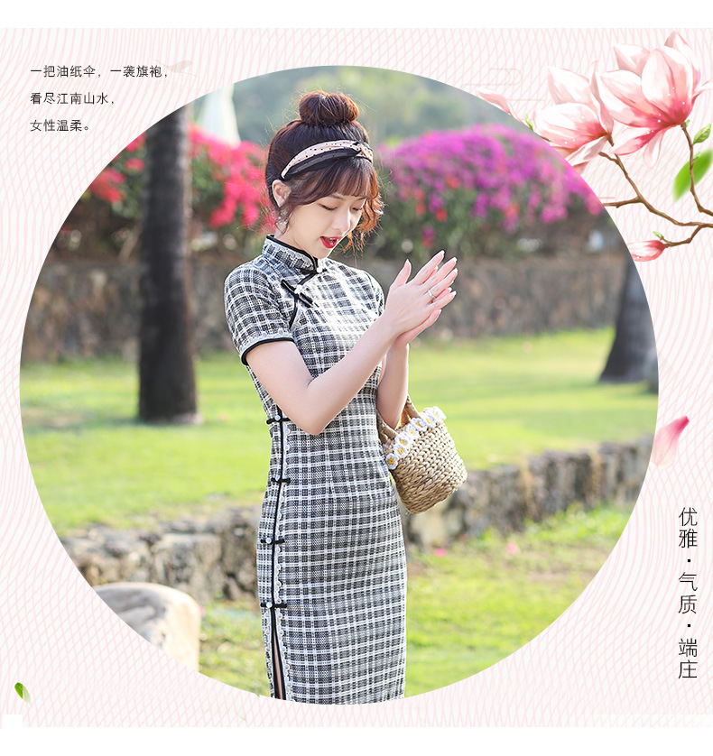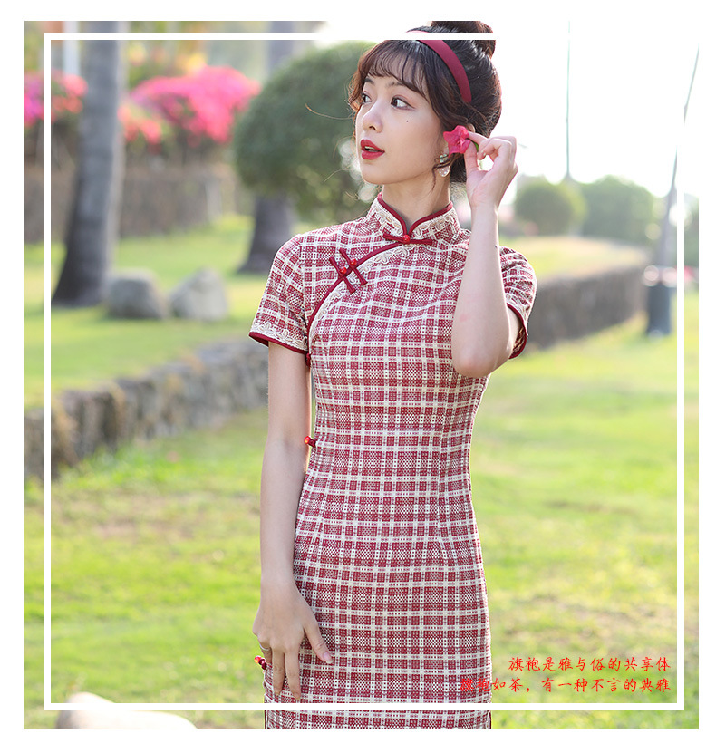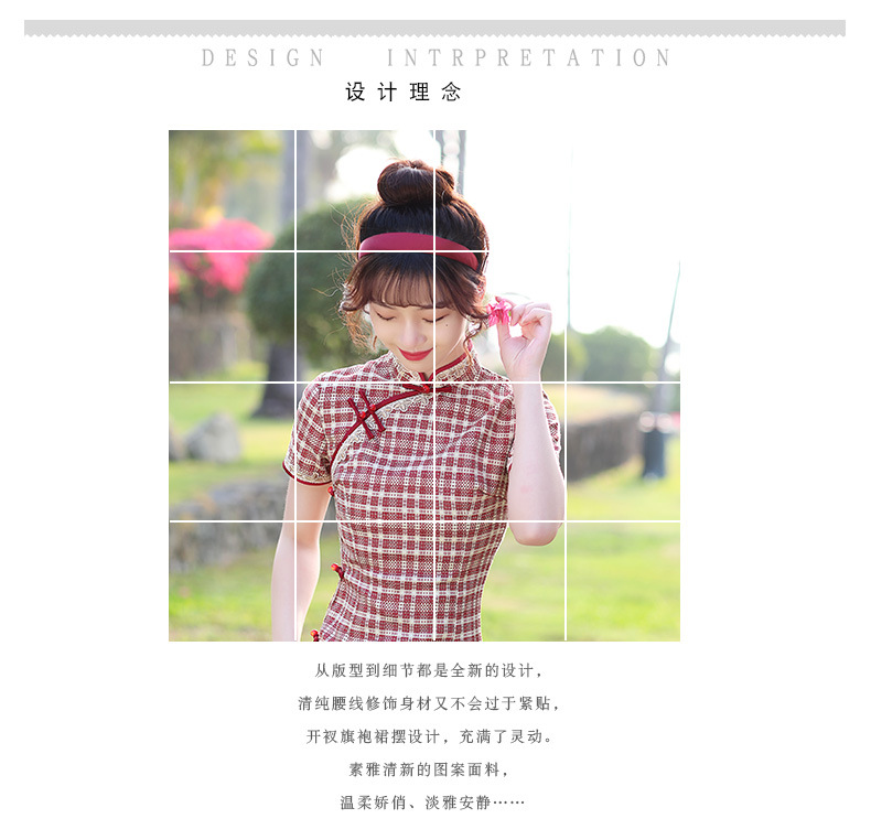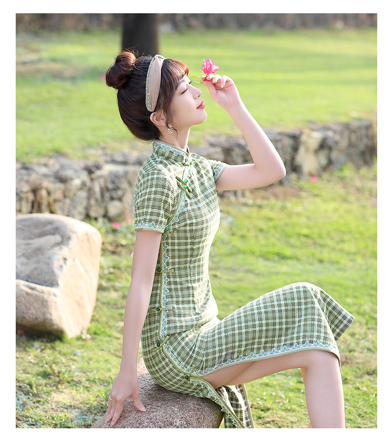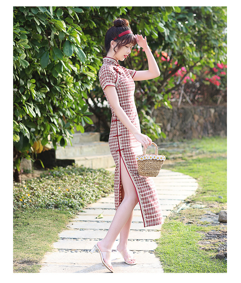 改良旗袍 长款复古中国风文艺格子修身演出弹力旗袍 少女款连衣裙