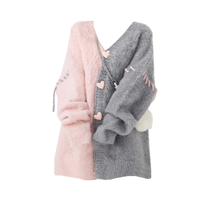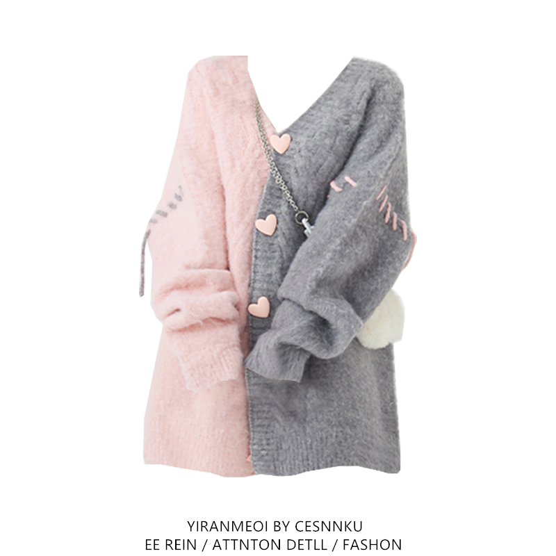 慵懶風軟糯馬海毛毛衣女秋冬拼接愛心鈕釦中長版水貂毛針織上衣