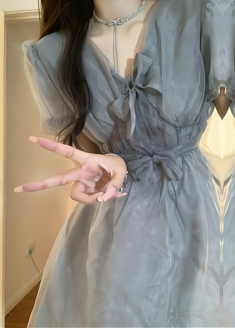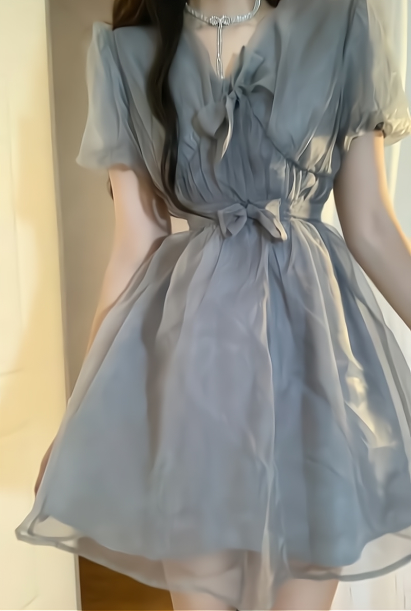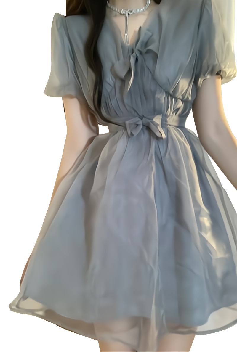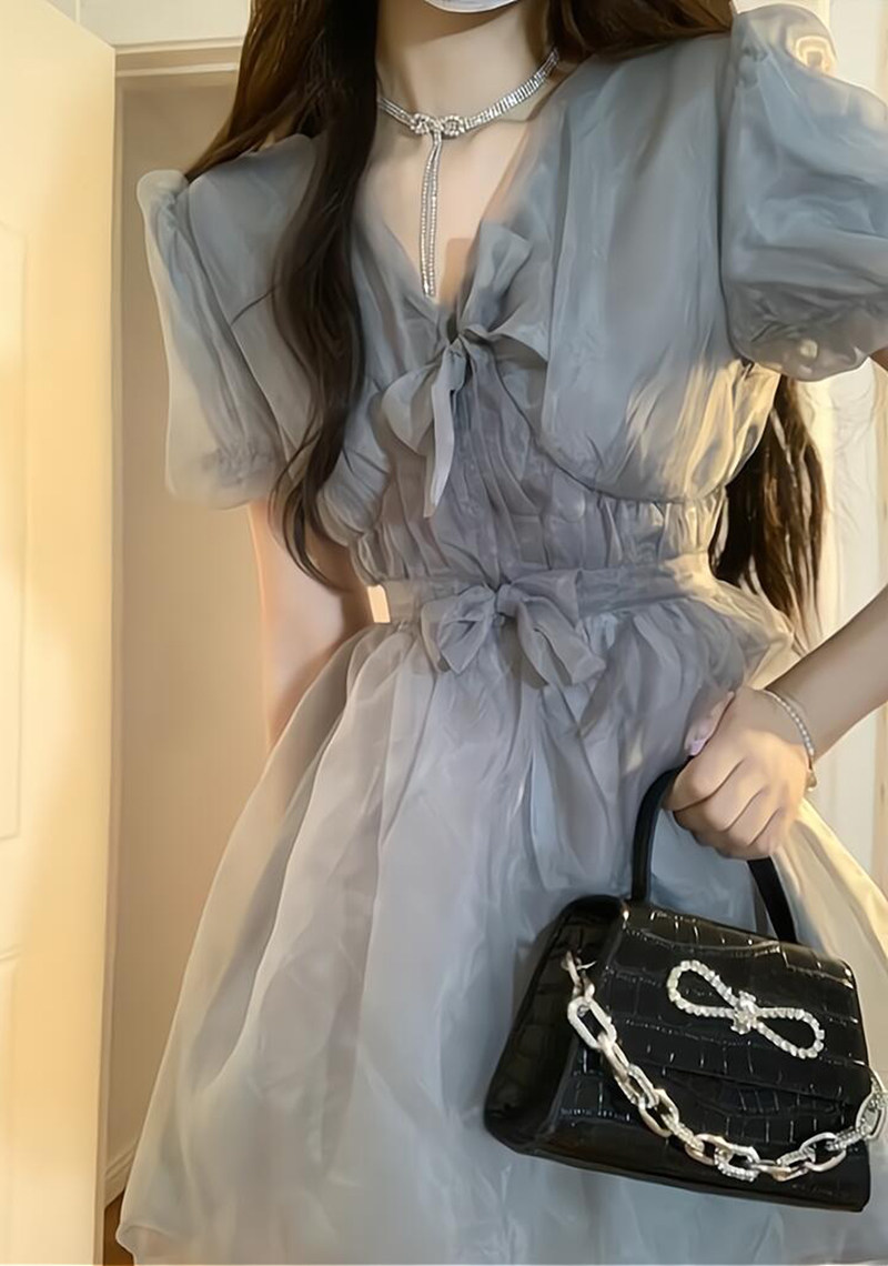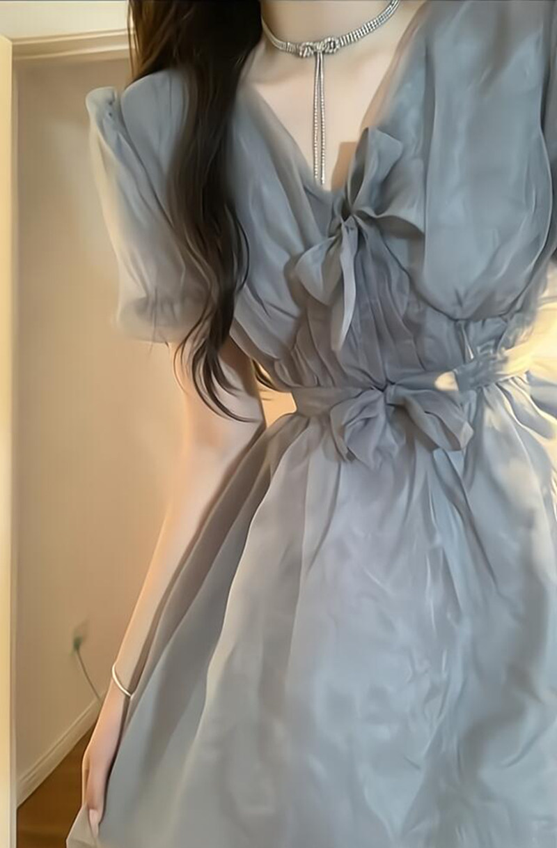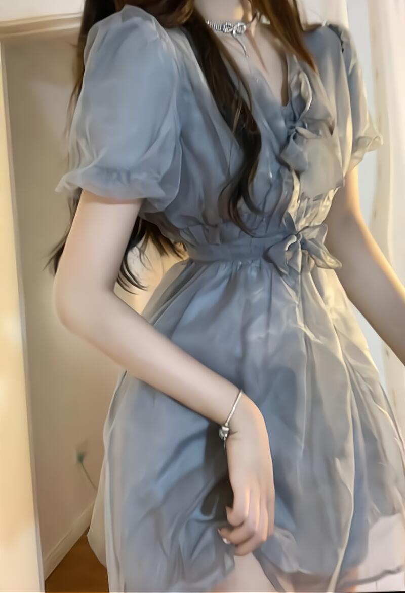 pin/ky辛德瑞拉 可甜可鹹V領高腰蝴蝶結仙女2023洋裝女泡泡袖