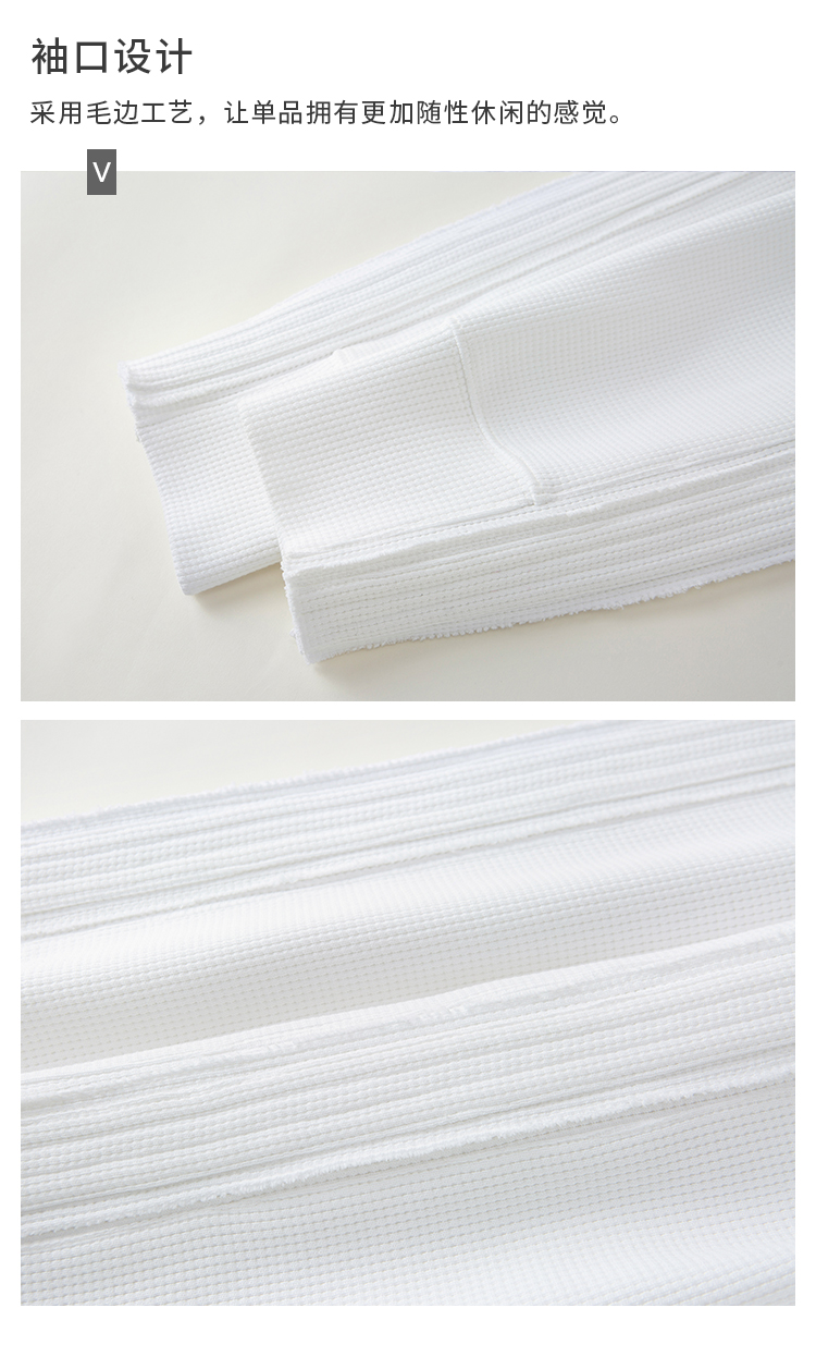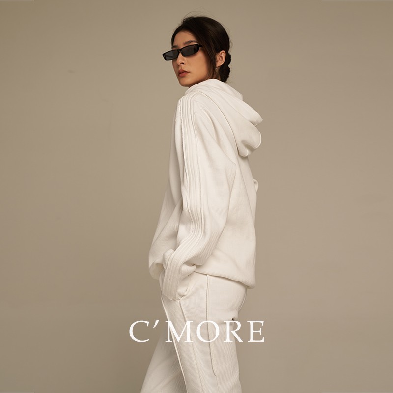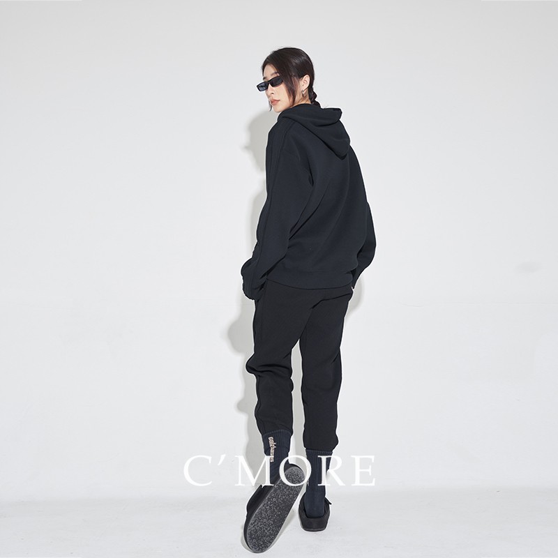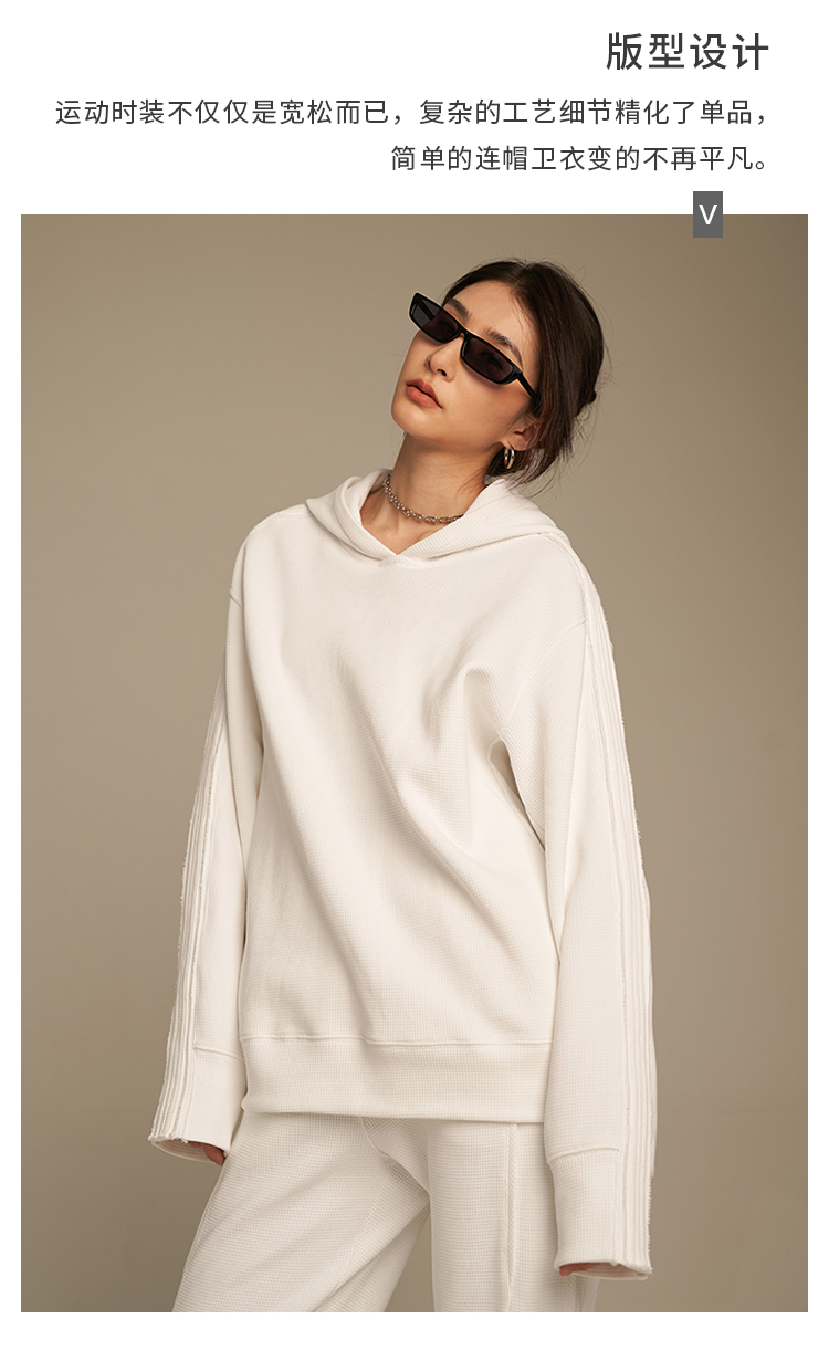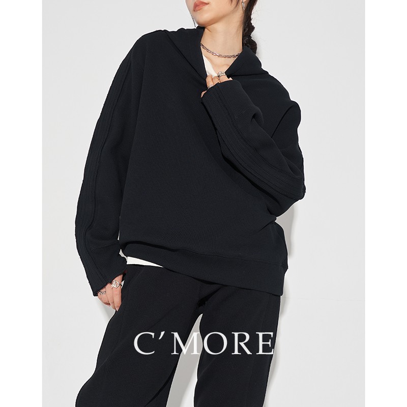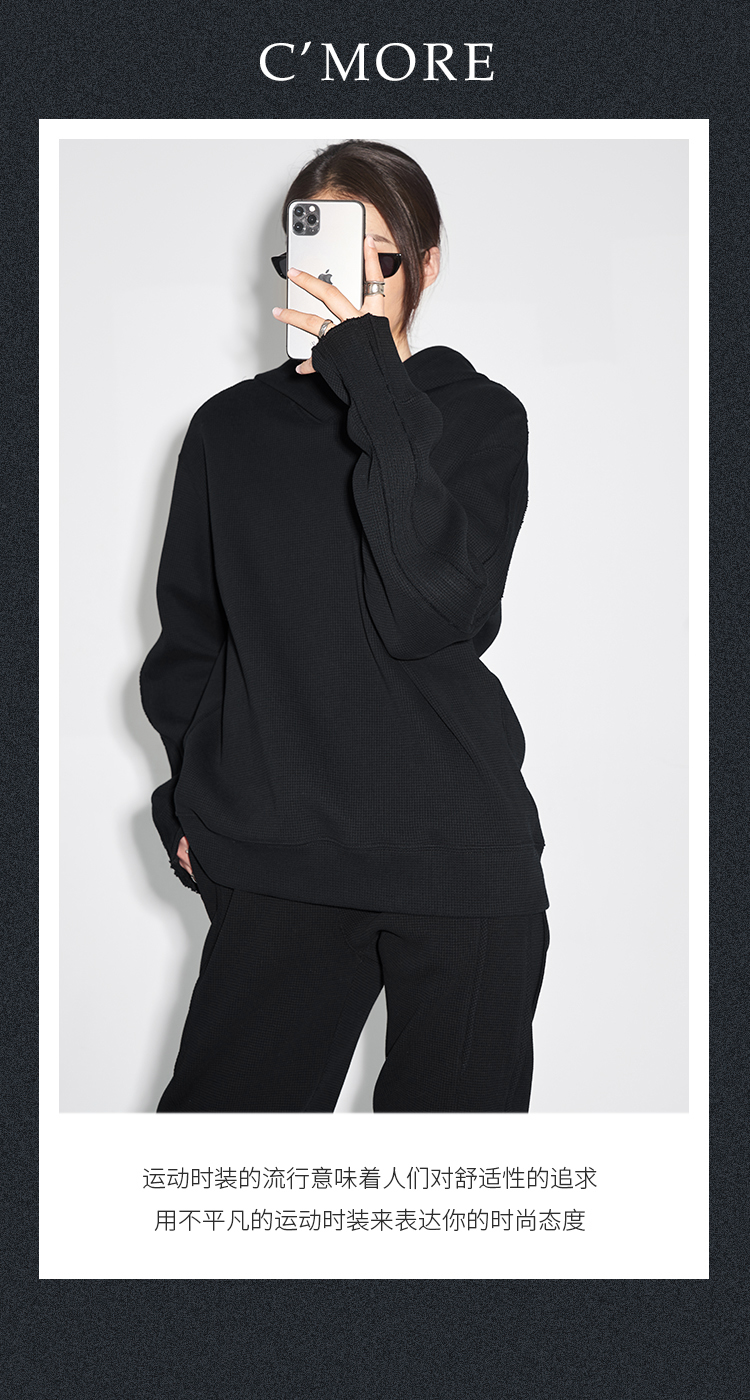 CMORE春秋款 黑/白華夫格 小眾設計感休閒寬鬆套頭連帽運動衫女