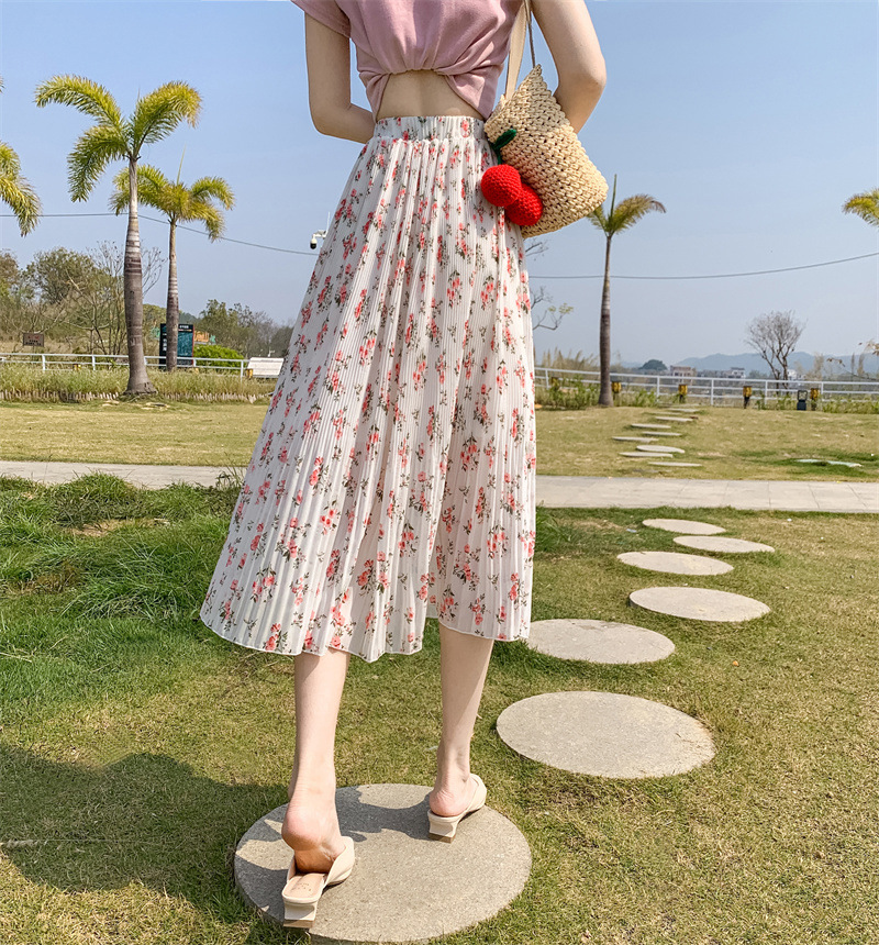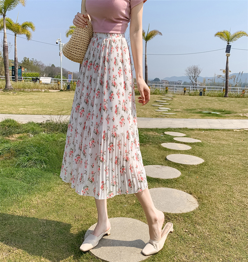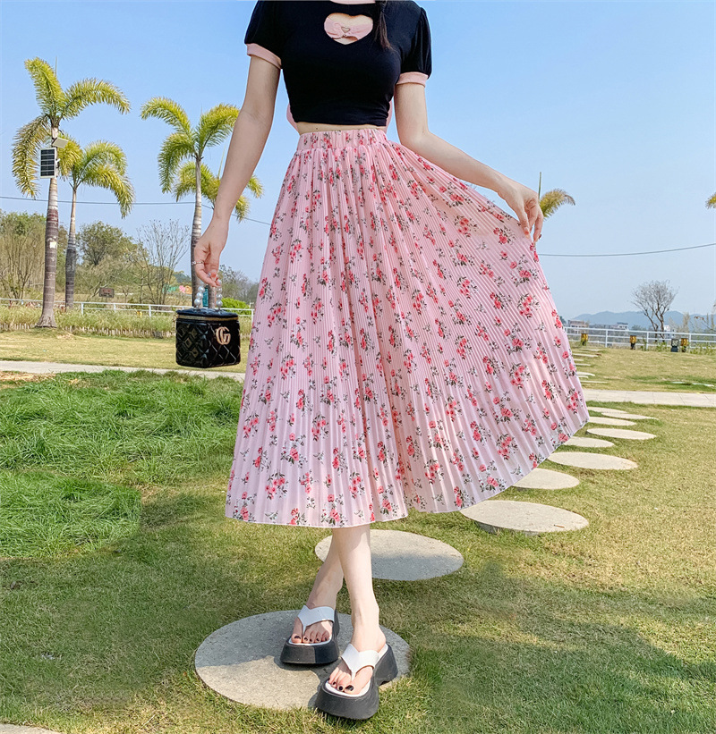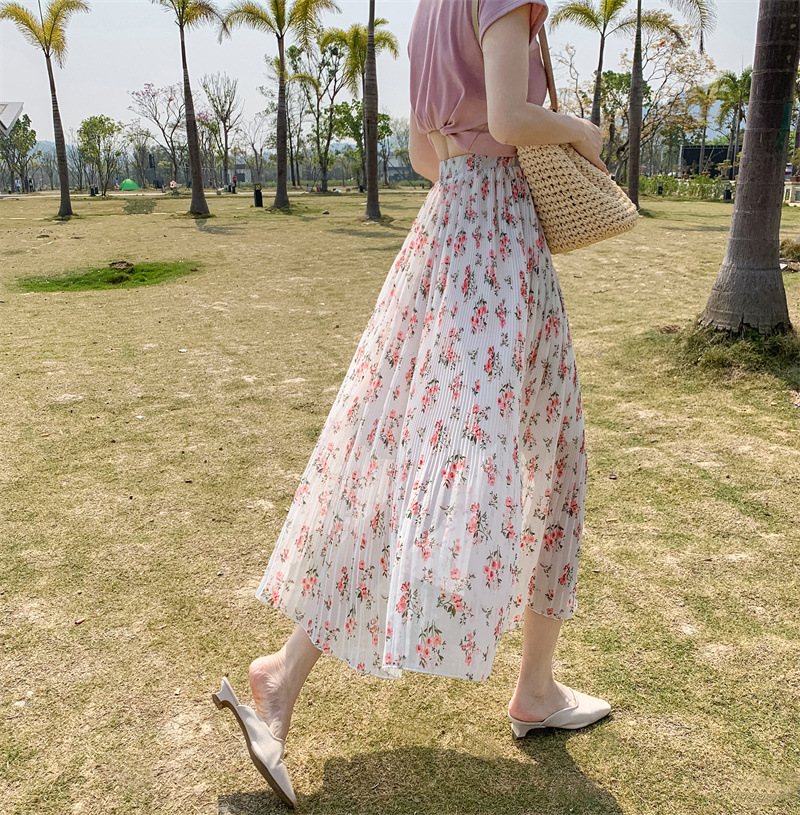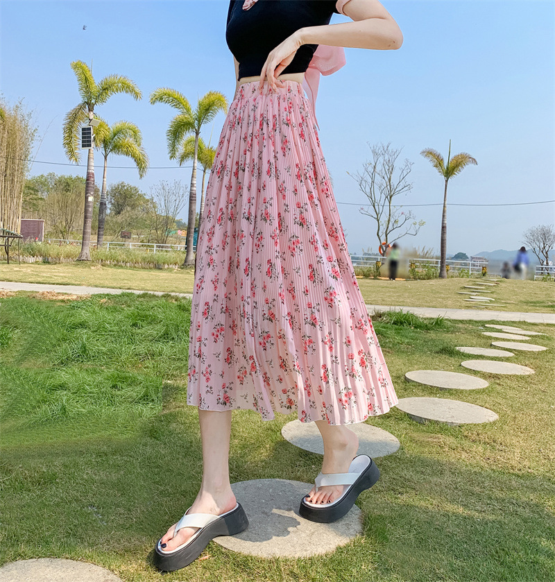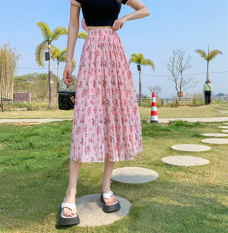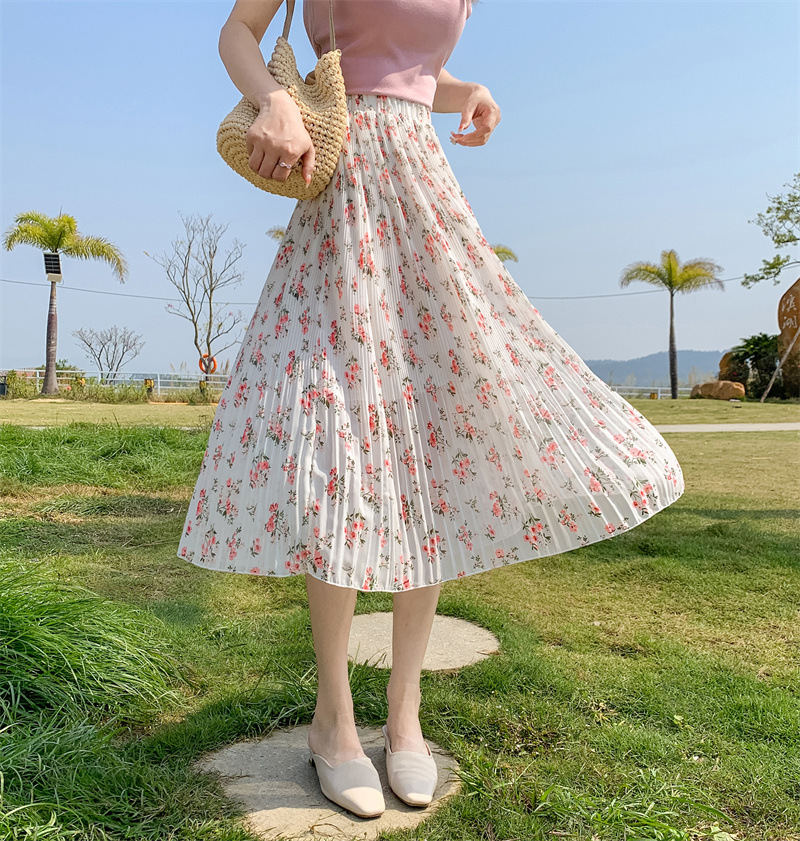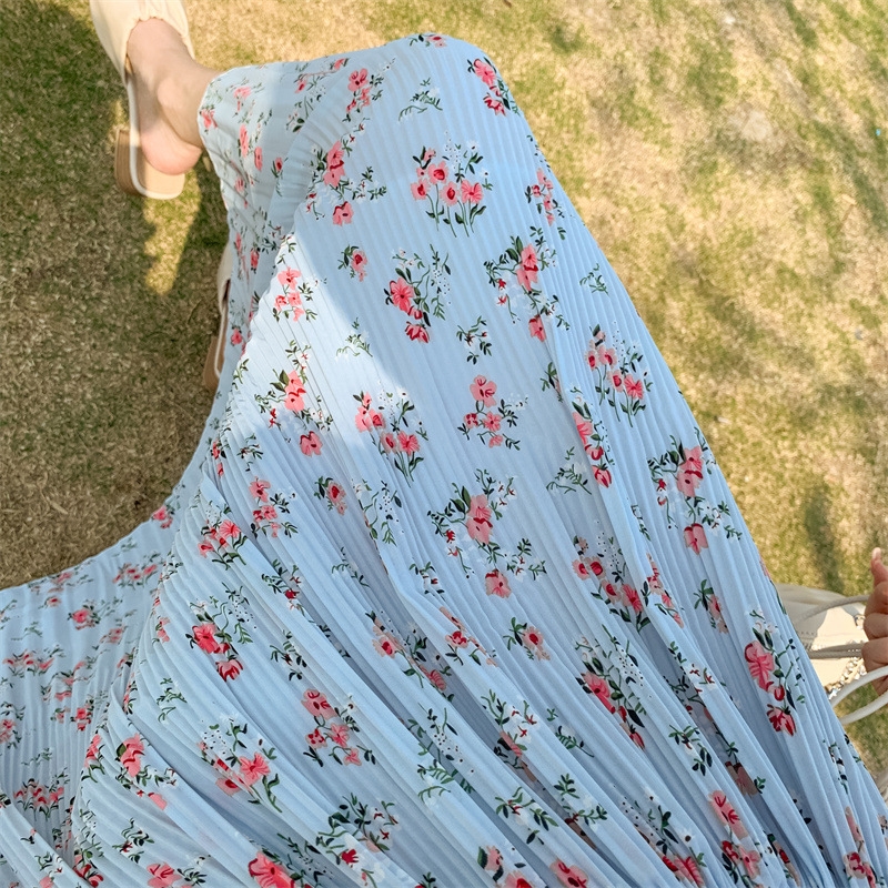 模特实拍田园清新碎花百褶裙中长款褶皱半身裙甜美雪纺女裙子夏季