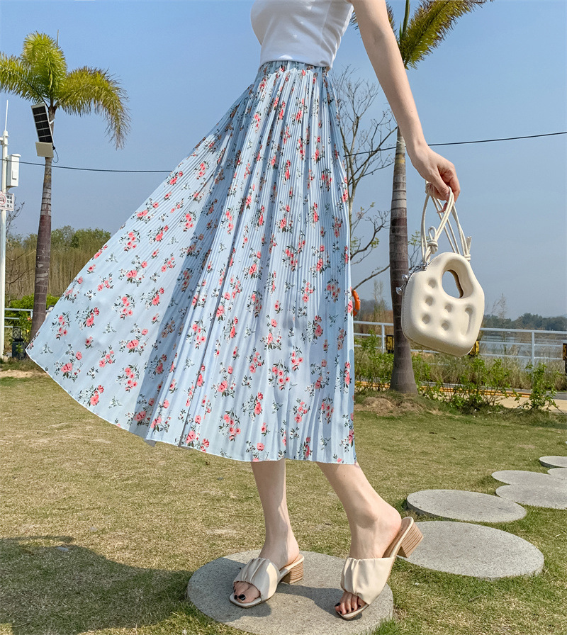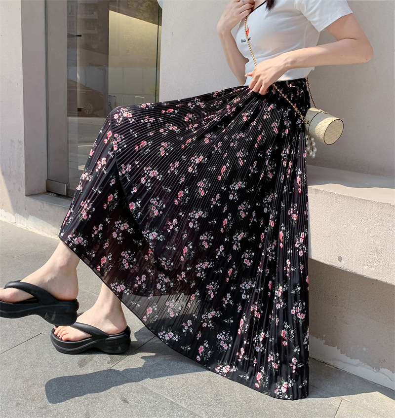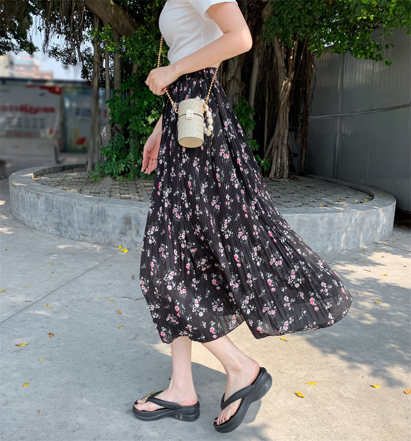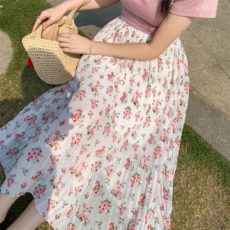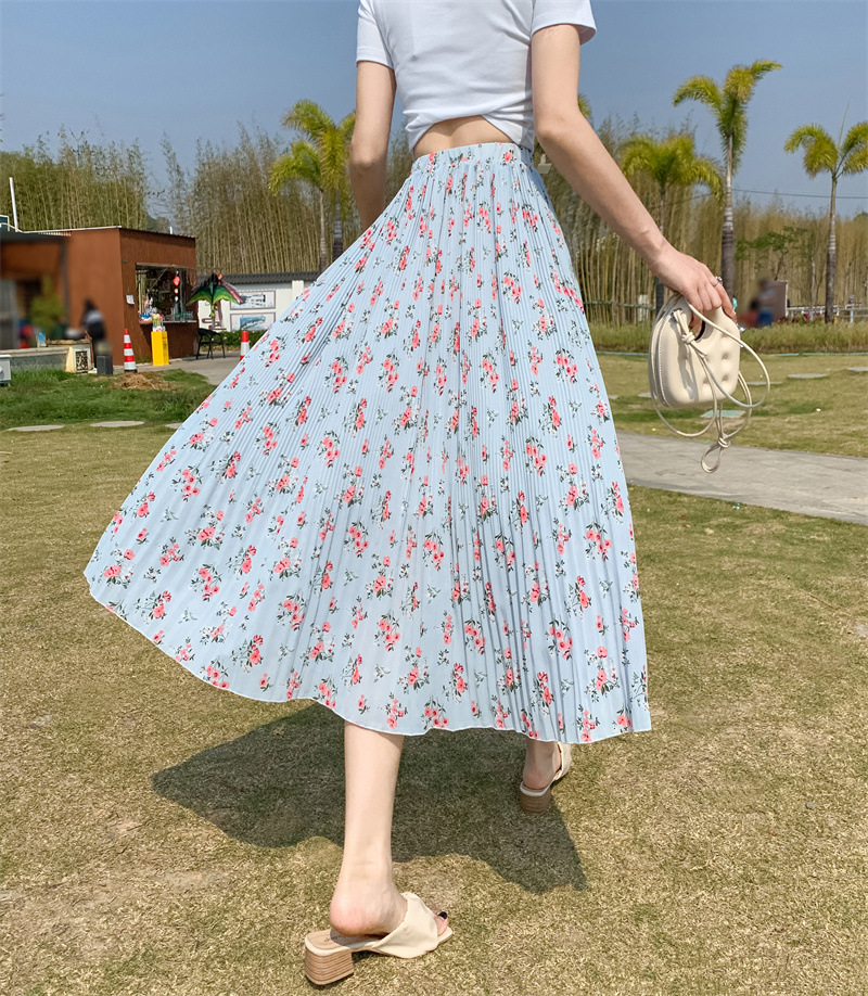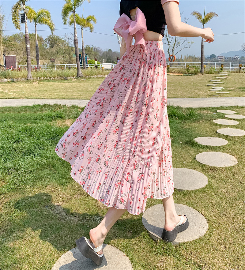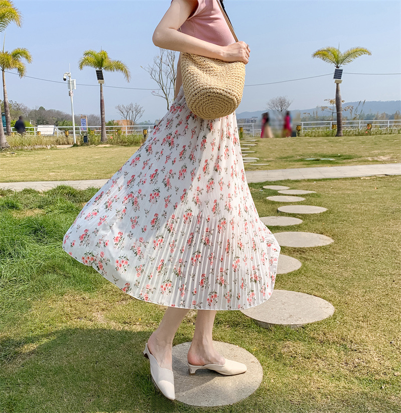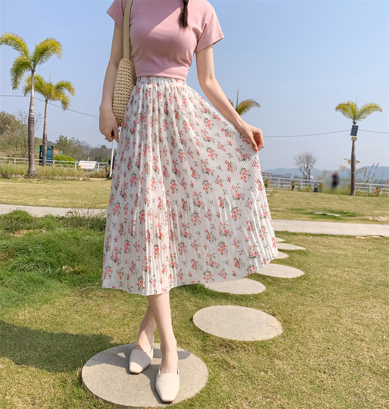 模特实拍田园清新碎花百褶裙中长款褶皱半身裙甜美雪纺女裙子夏季