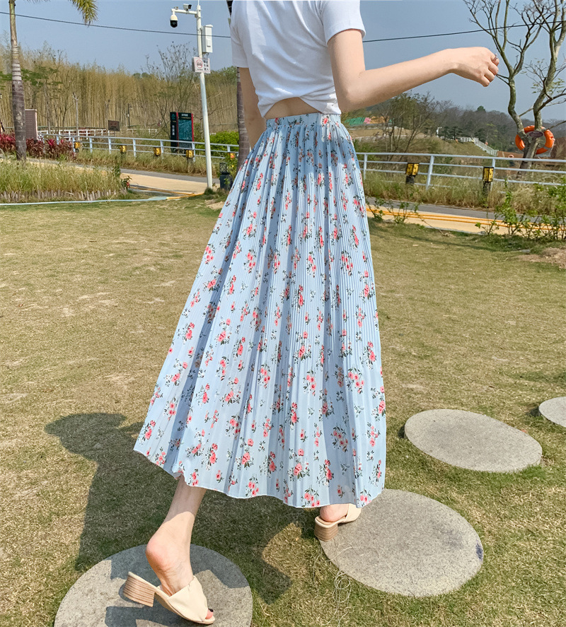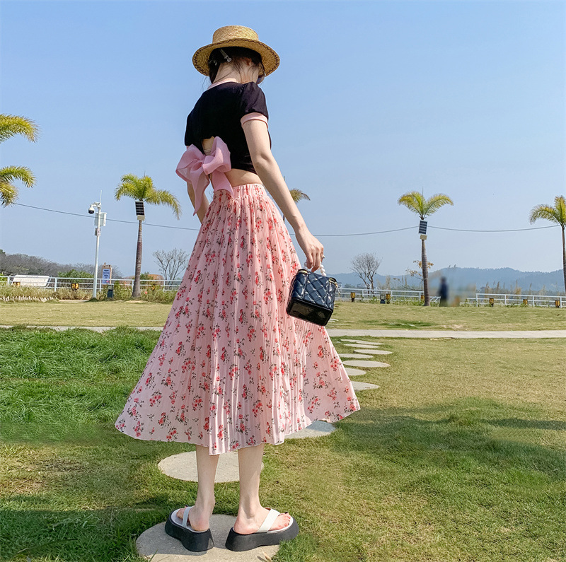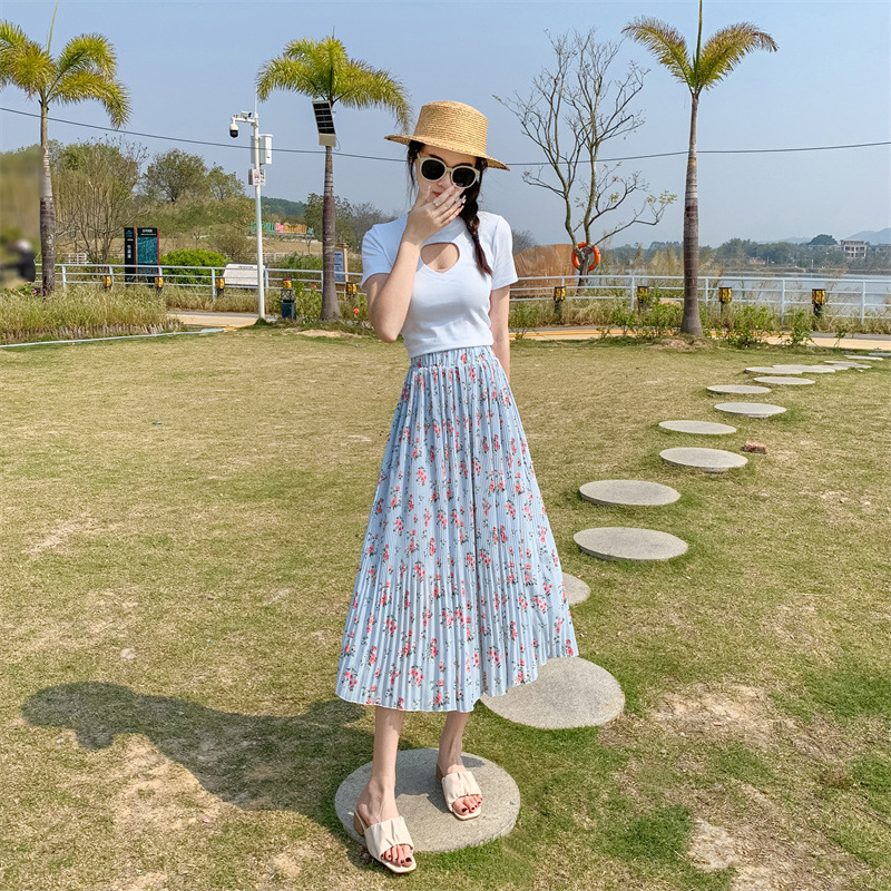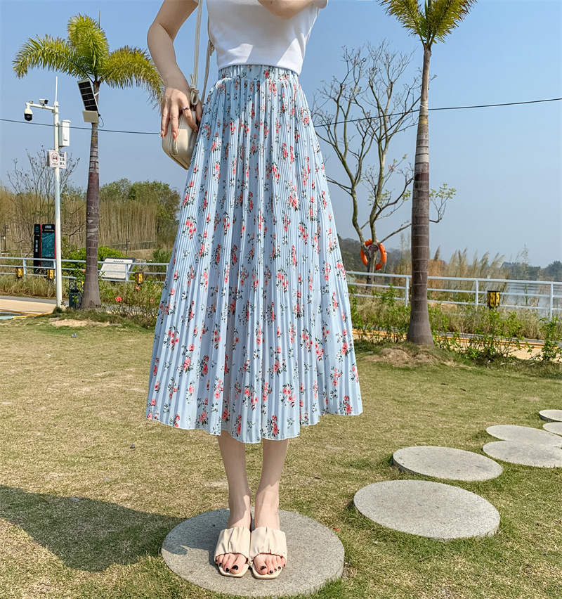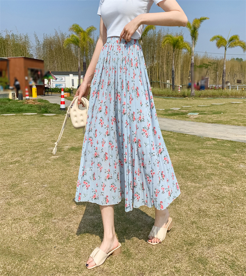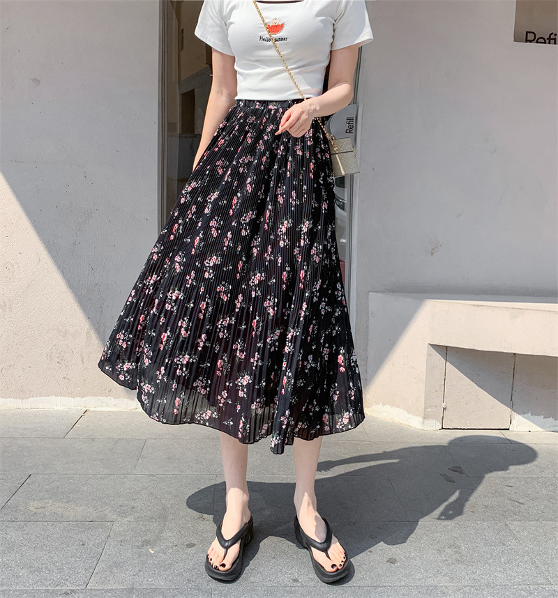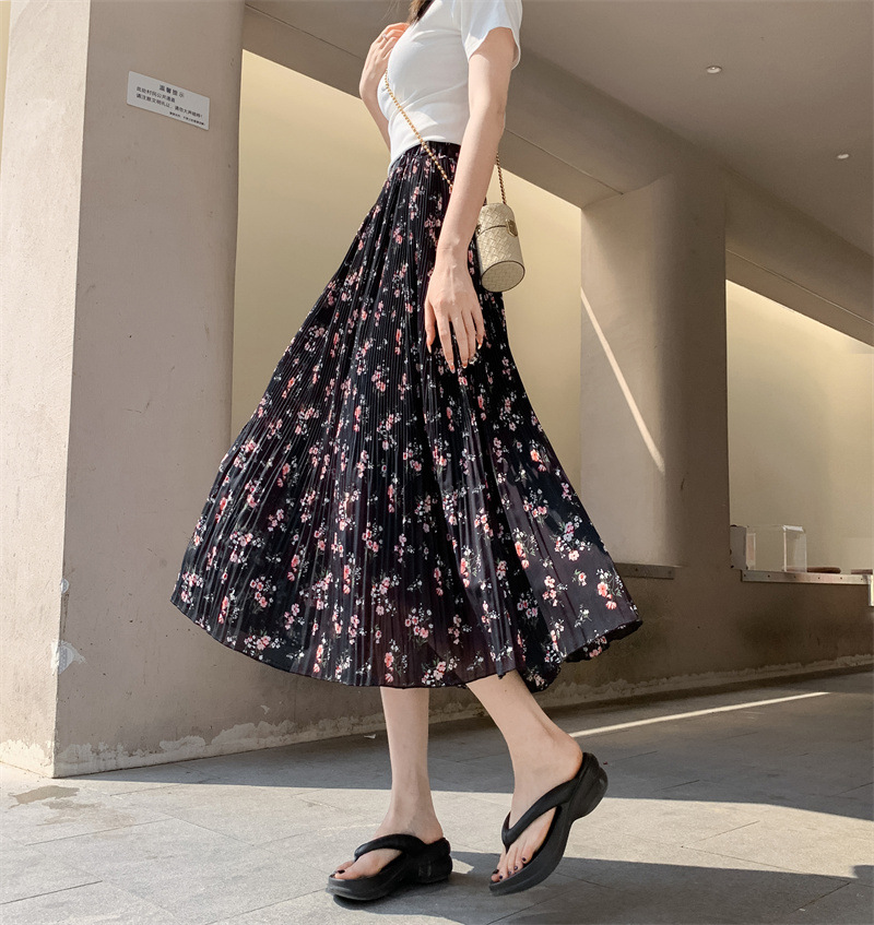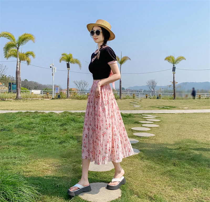 模特实拍田园清新碎花百褶裙中长款褶皱半身裙甜美雪纺女裙子夏季