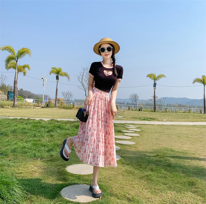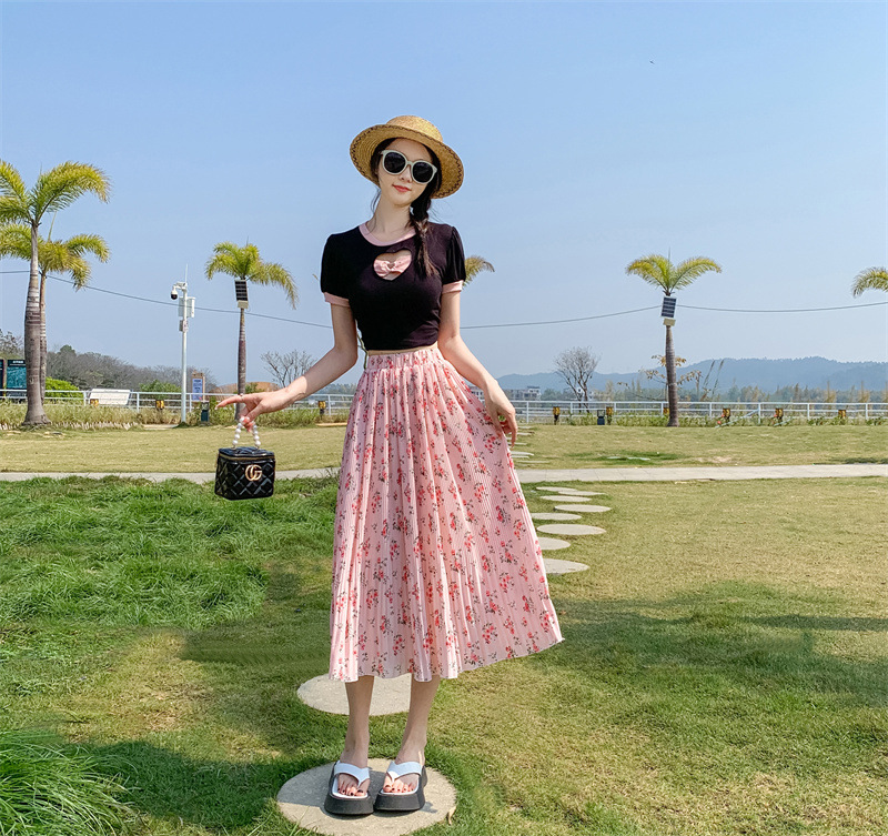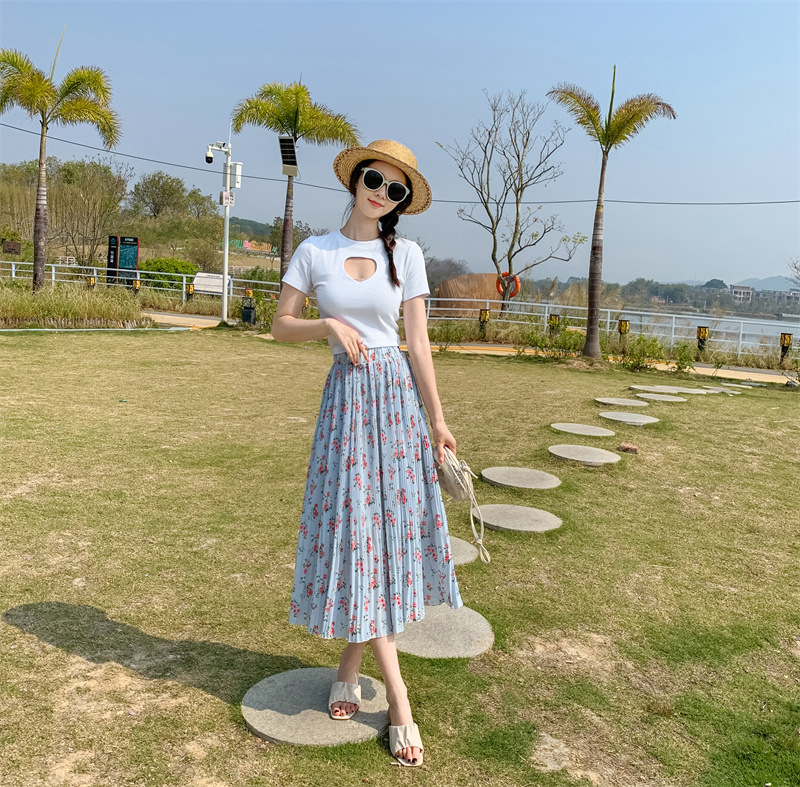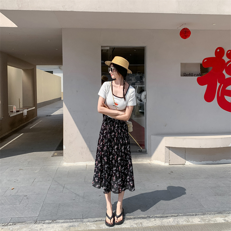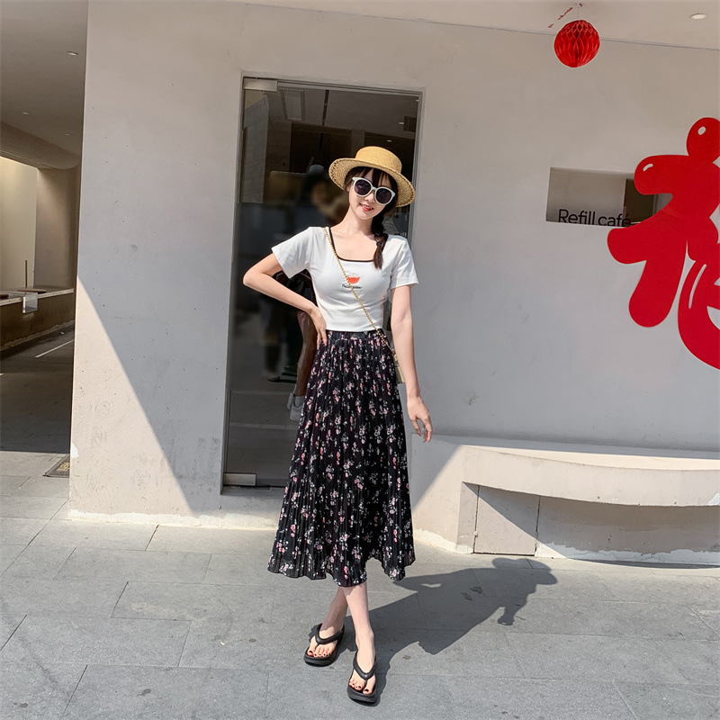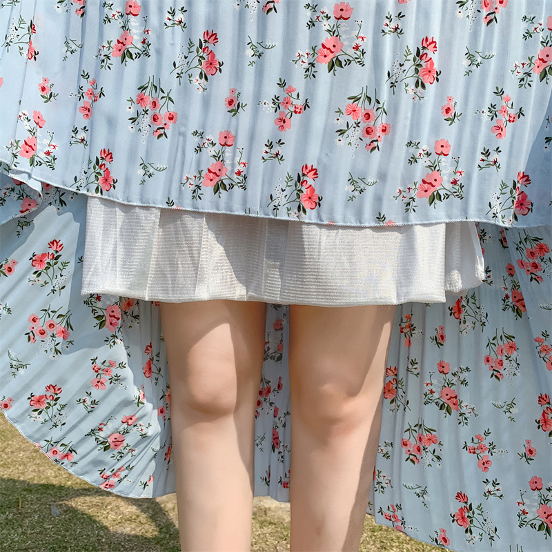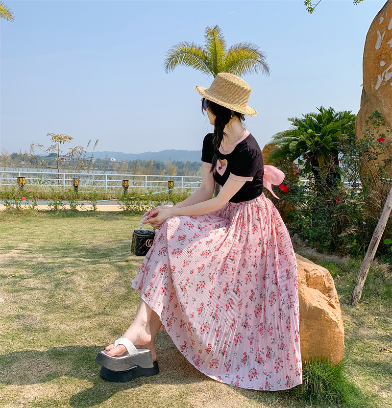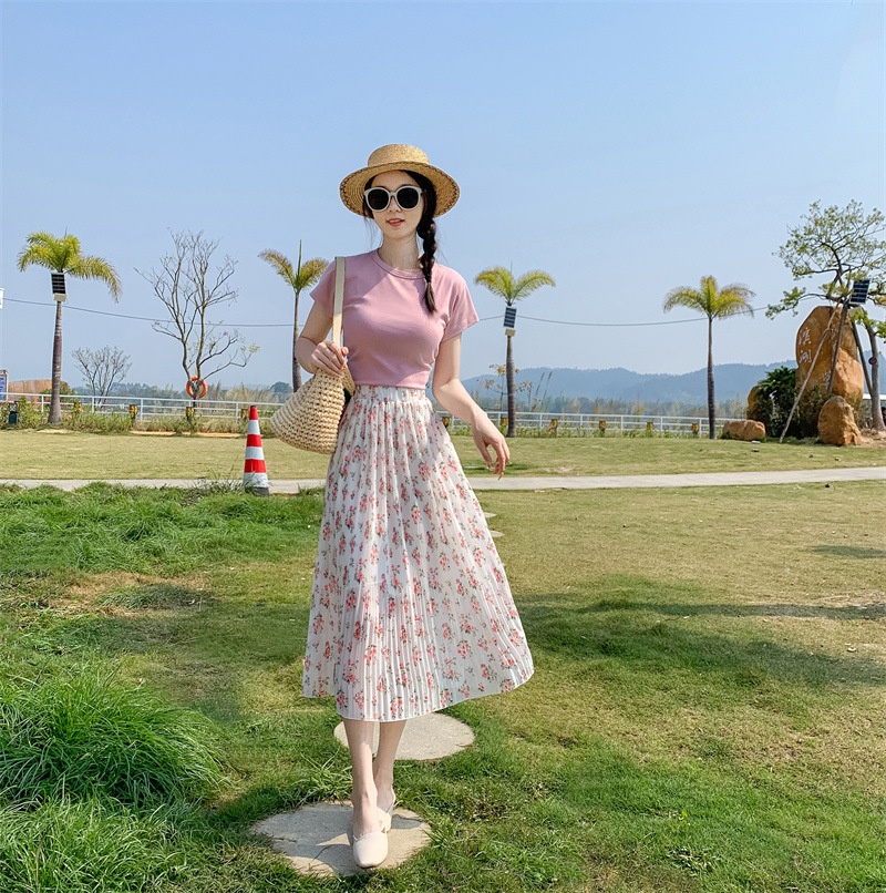 模特实拍田园清新碎花百褶裙中长款褶皱半身裙甜美雪纺女裙子夏季