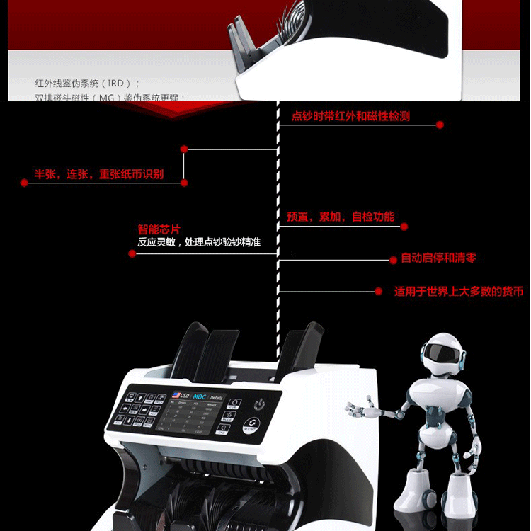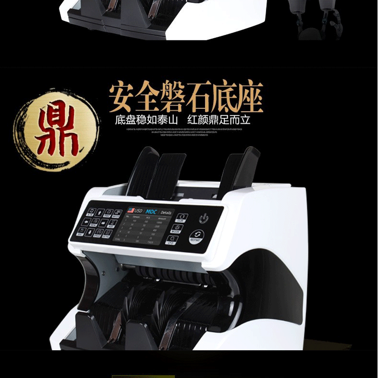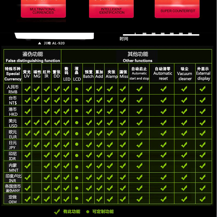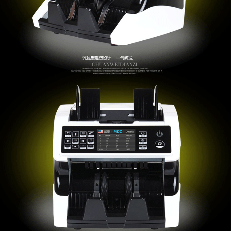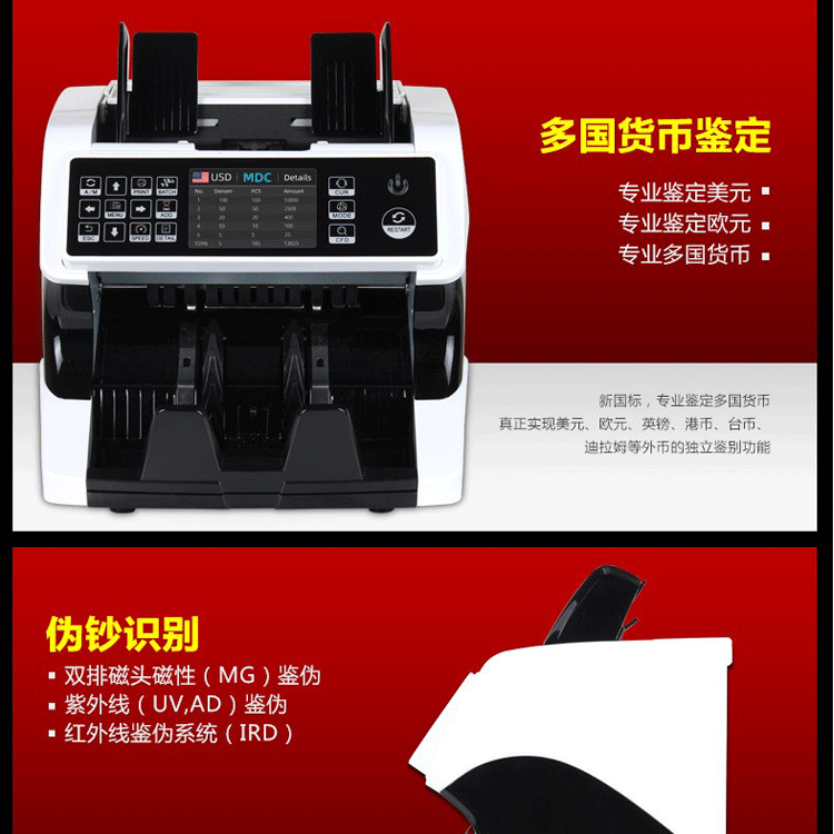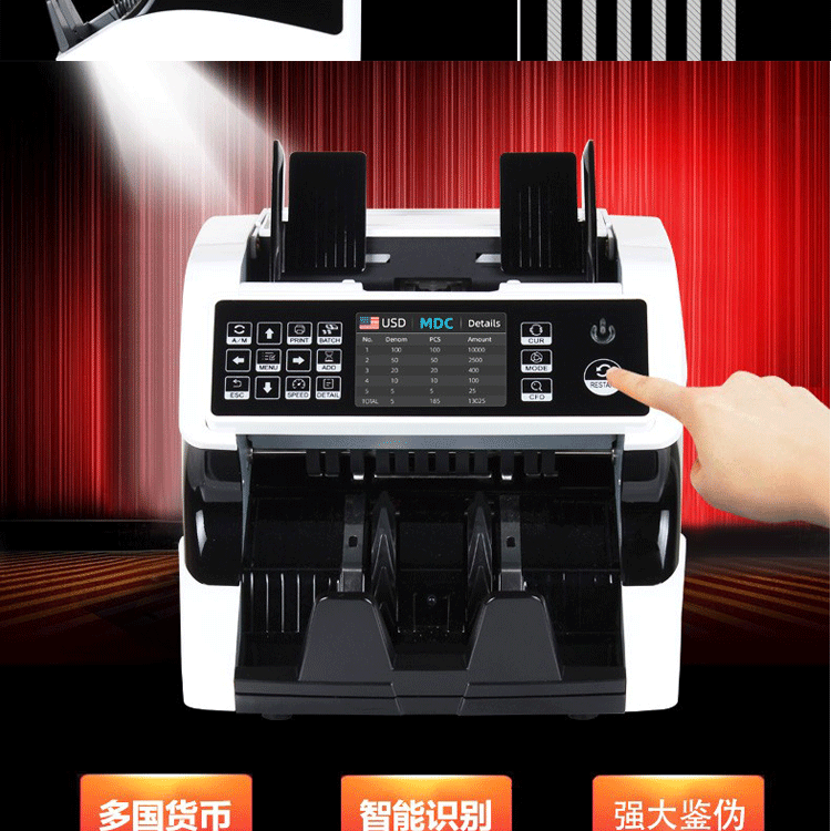 这款是智能英文外币点钞机,美元欧元港币伊拉克乌兹别克斯坦泰铢马币等多国货币点验钞机,具有面额识别,金额合计,面额清分等功能。