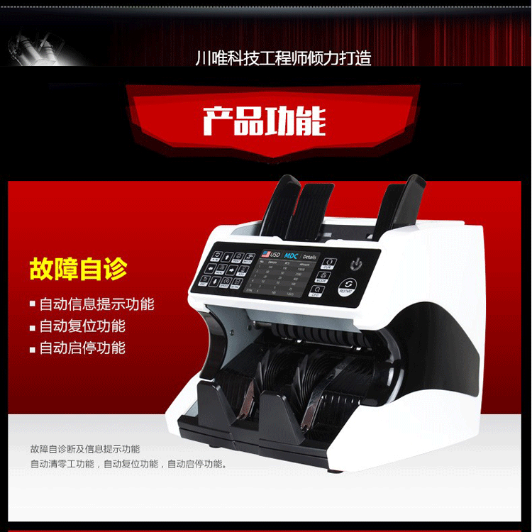 2、智能点钞:自动识别所点验钞票的面额和版别并有醒目显示。