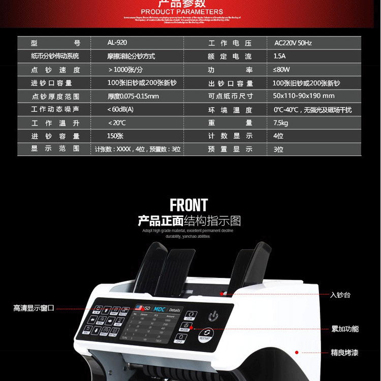 1、主要点钞功能:智能﹑分版、累加、清点﹑金额计算等。