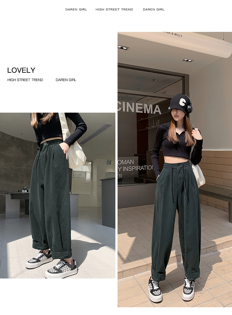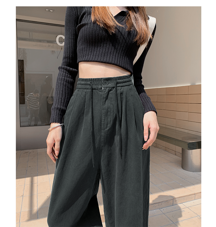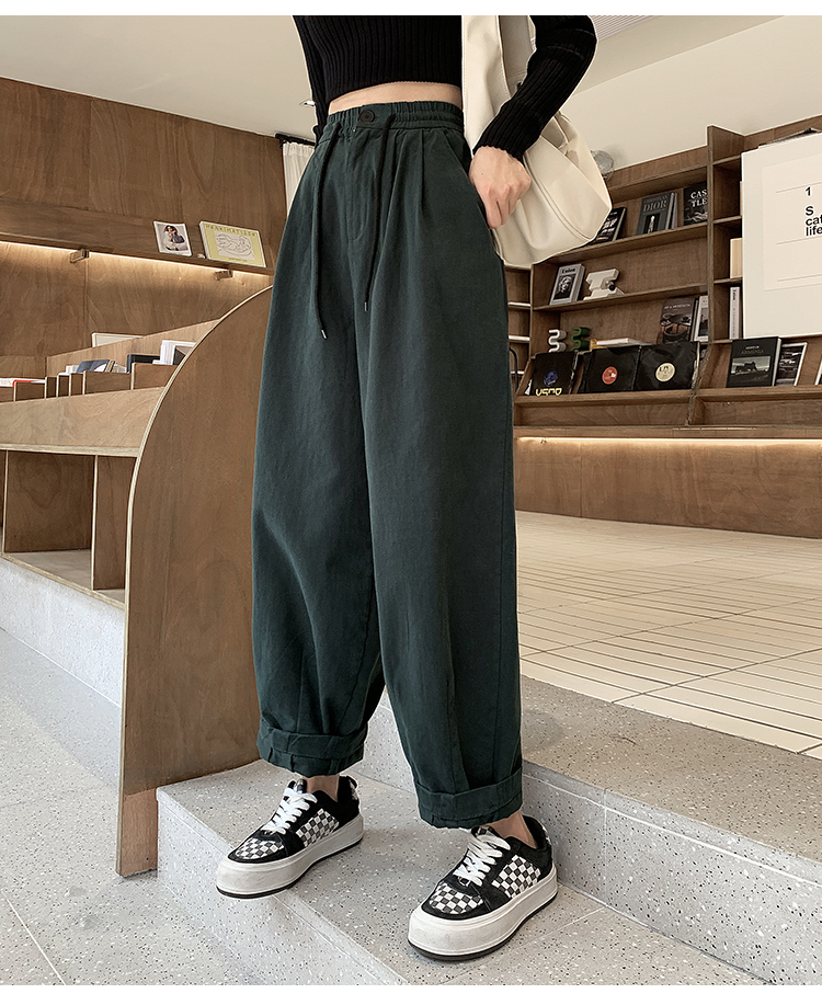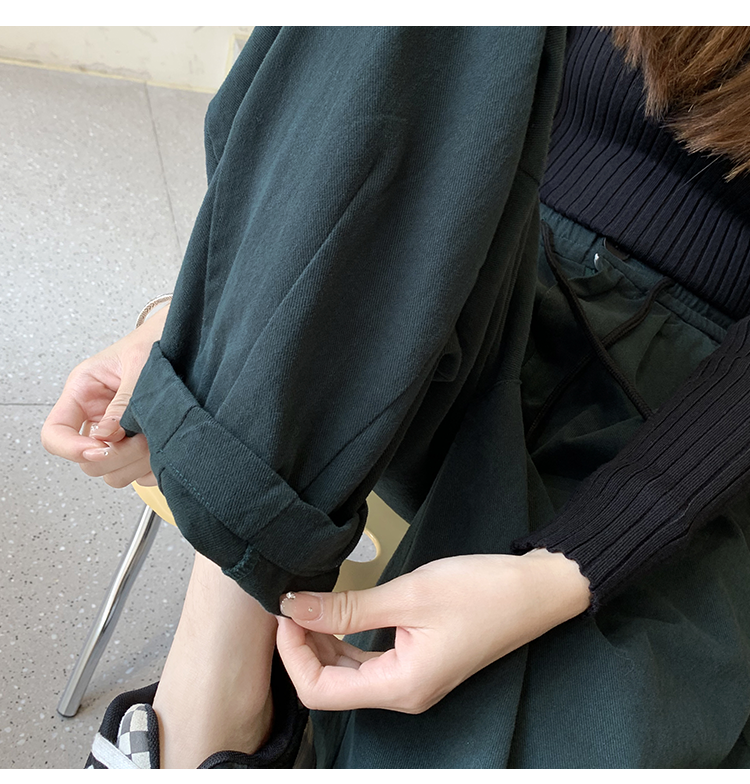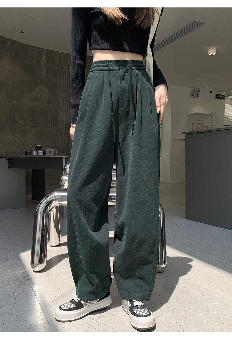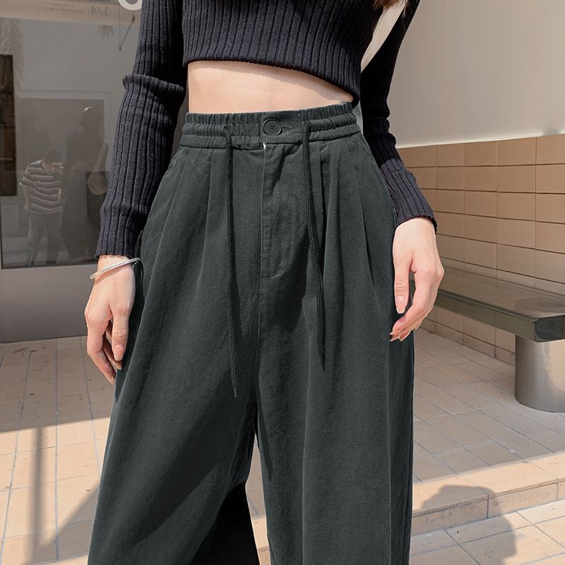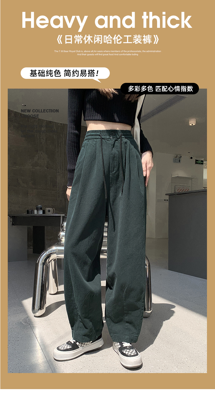 墨綠色工裝褲女春款抽繩高腰寬鬆休閒哈倫西裝褲小個子九分老爹褲