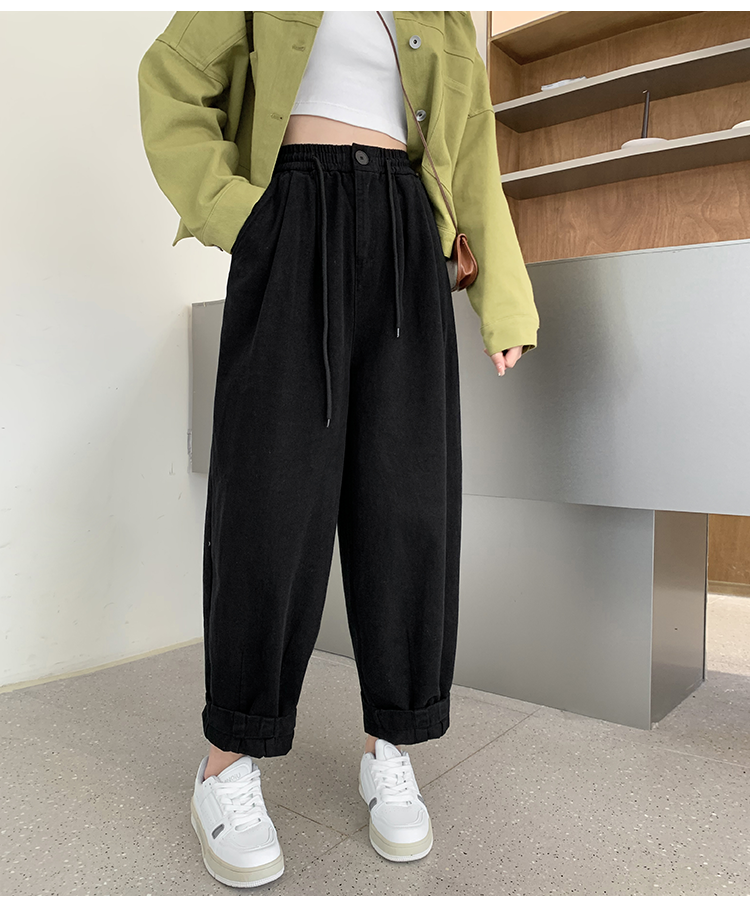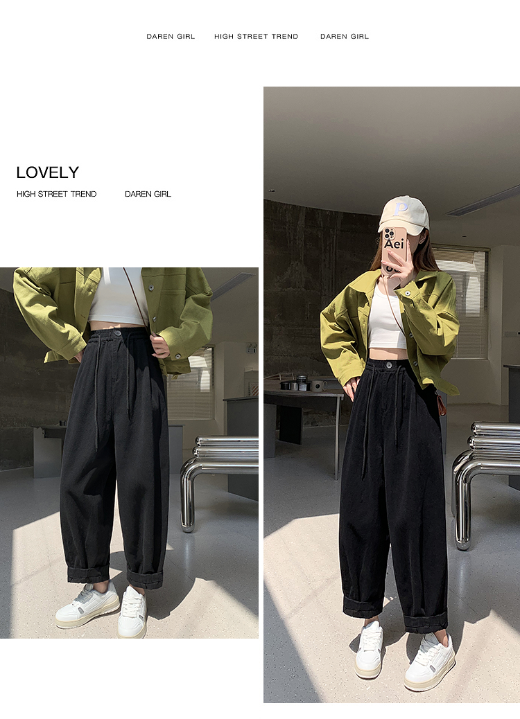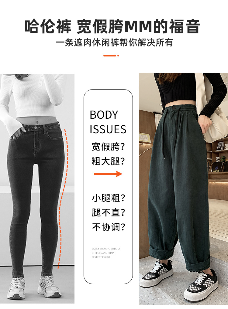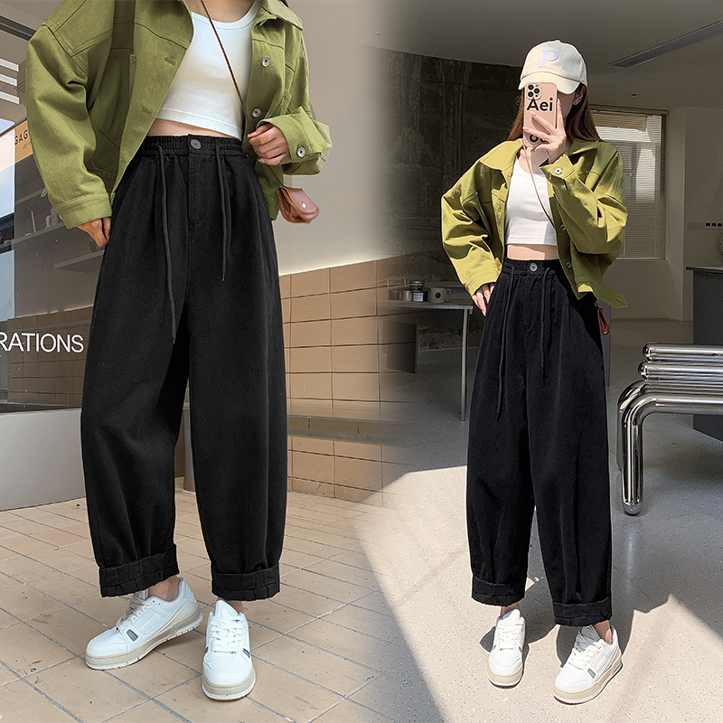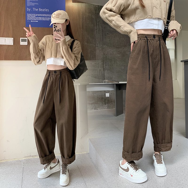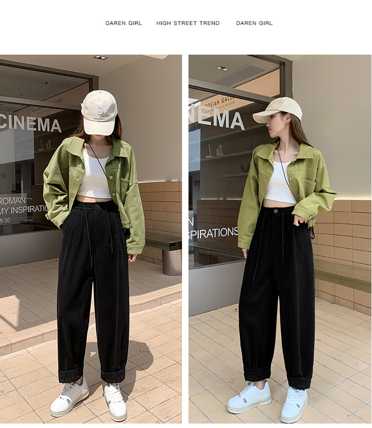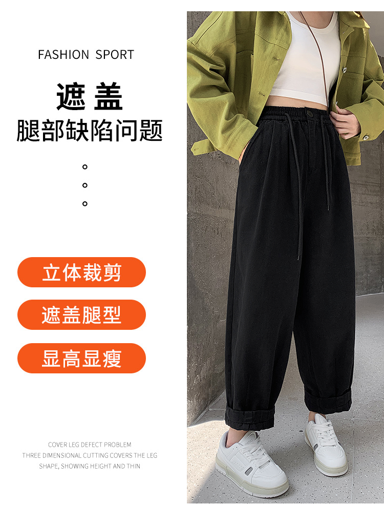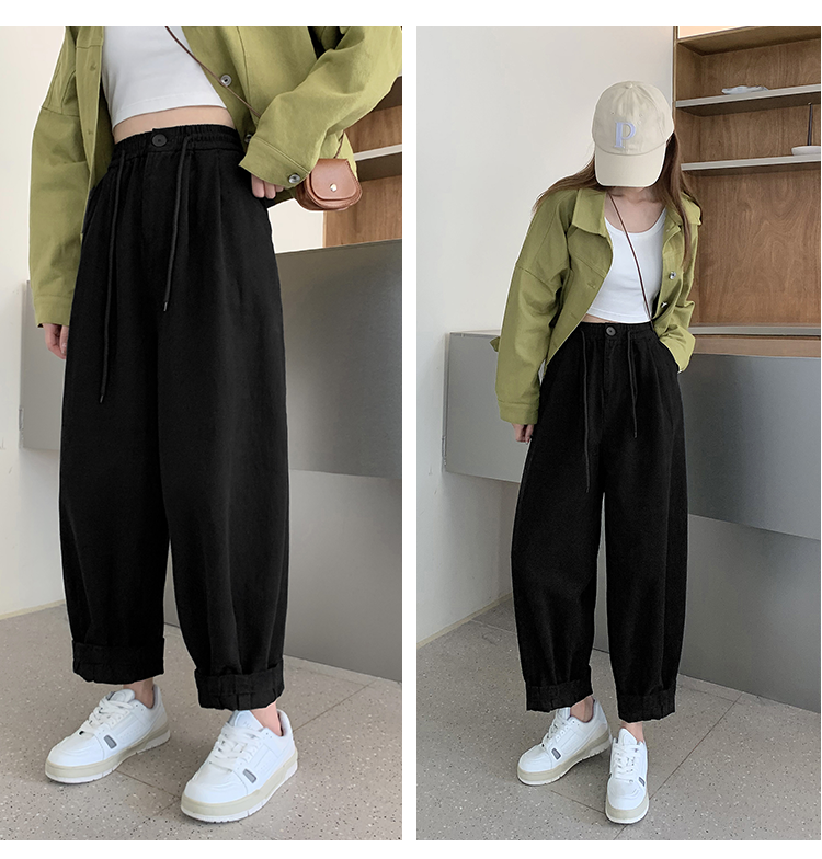 墨綠色工裝褲女春款抽繩高腰寬鬆休閒哈倫西裝褲小個子九分老爹褲
