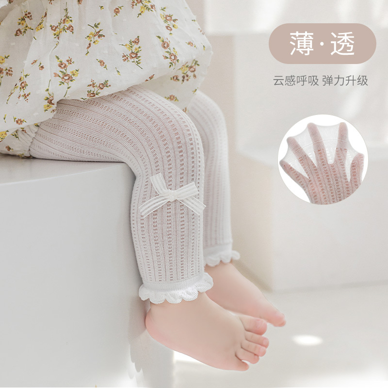 新生儿宝宝打底裤夏季超薄镂空网眼蝴蝶结公主女童婴儿花边九分裤