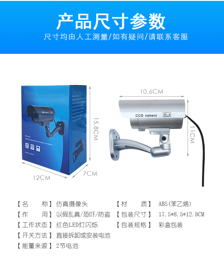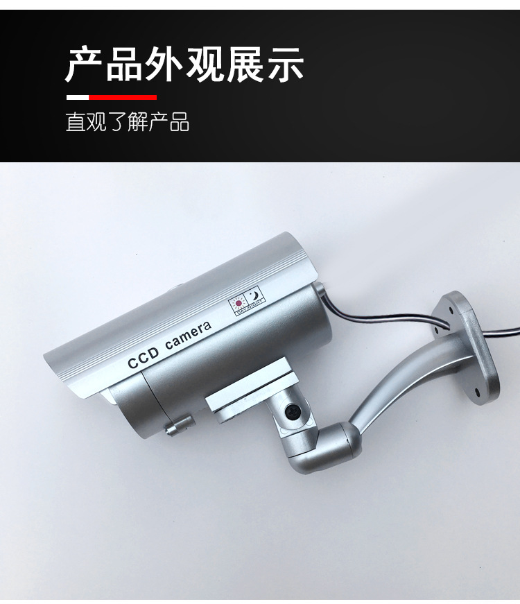 产品用途和作用:在商场超市、酒店旅馆、停车场、图书馆、办公室、仓库厂房、集贸市场、公园场馆、住宅小区周围,或者一些必经路口的显眼位置,安装一个或几个仿真监视器,可以非常有效地震慑和阻吓小偷或不法分子,使他们不敢靠近!与真正的监视器配合使用,即有效又可以大大地降低安防的成本!由于我们的仿真监视器造型逼真、做工精细,工作模式和真的监视器相差无几,很难辨别出是仿真产品!既省钱又有效的好产品,相信您一定会买几个来试一试!