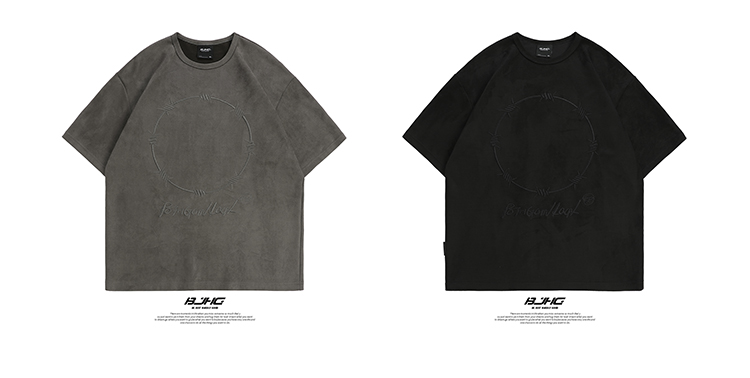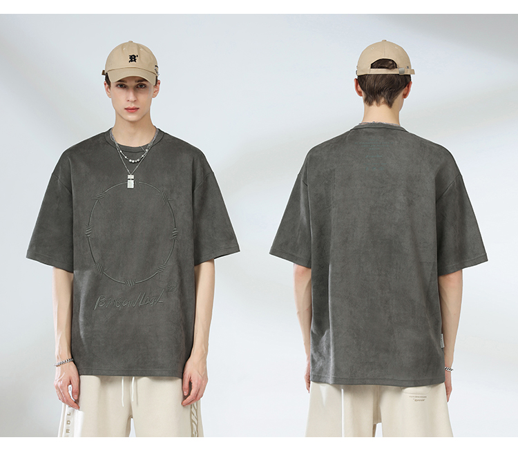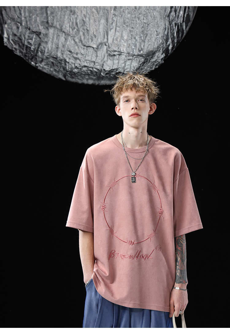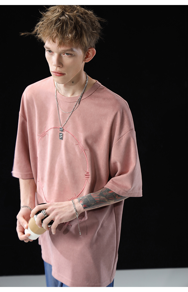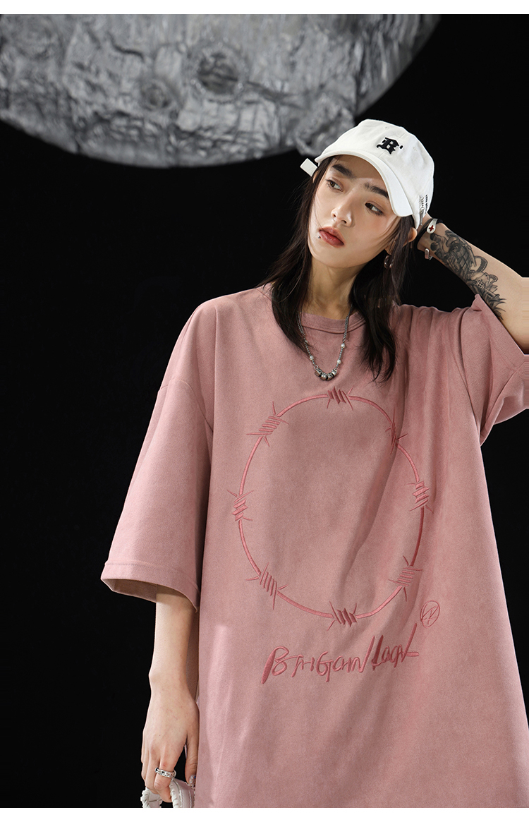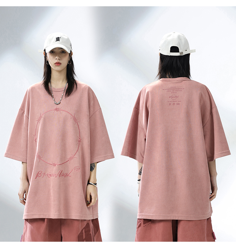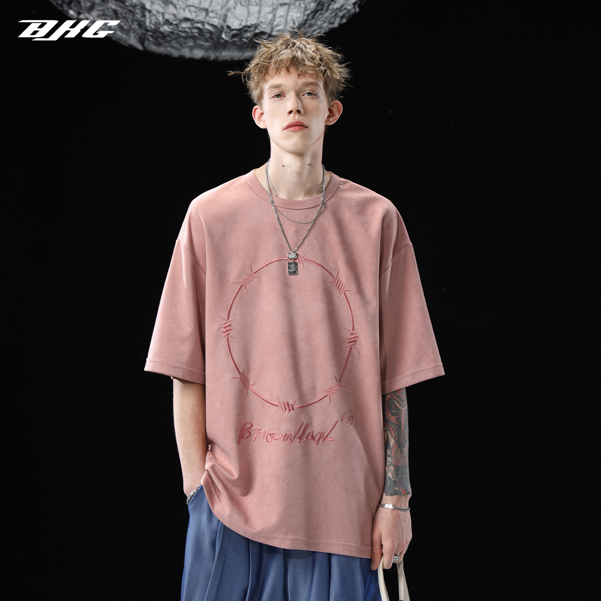 BJHG2023新款夏粉色麂皮短袖T恤男女美式OVERSIZE情侶半截袖上衣