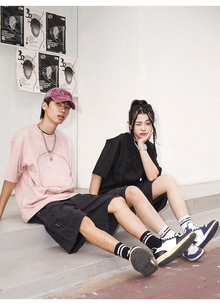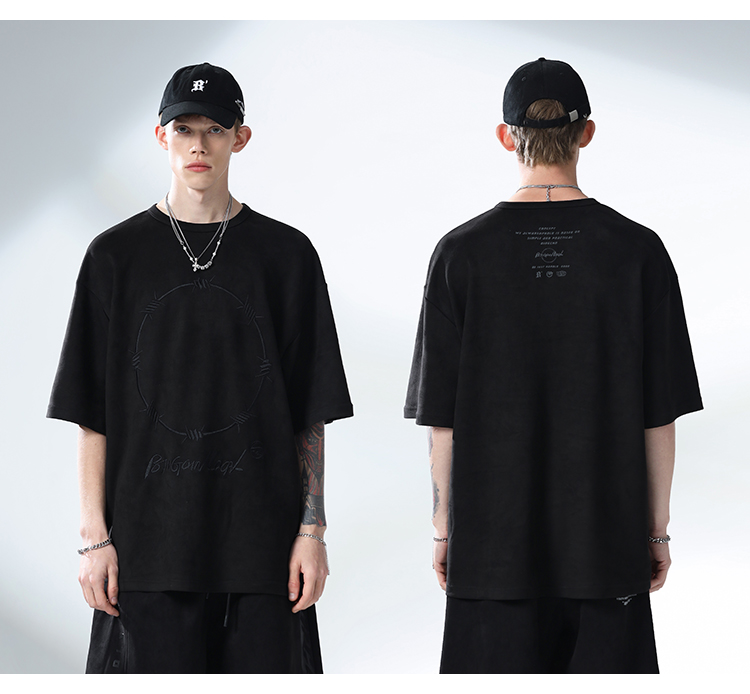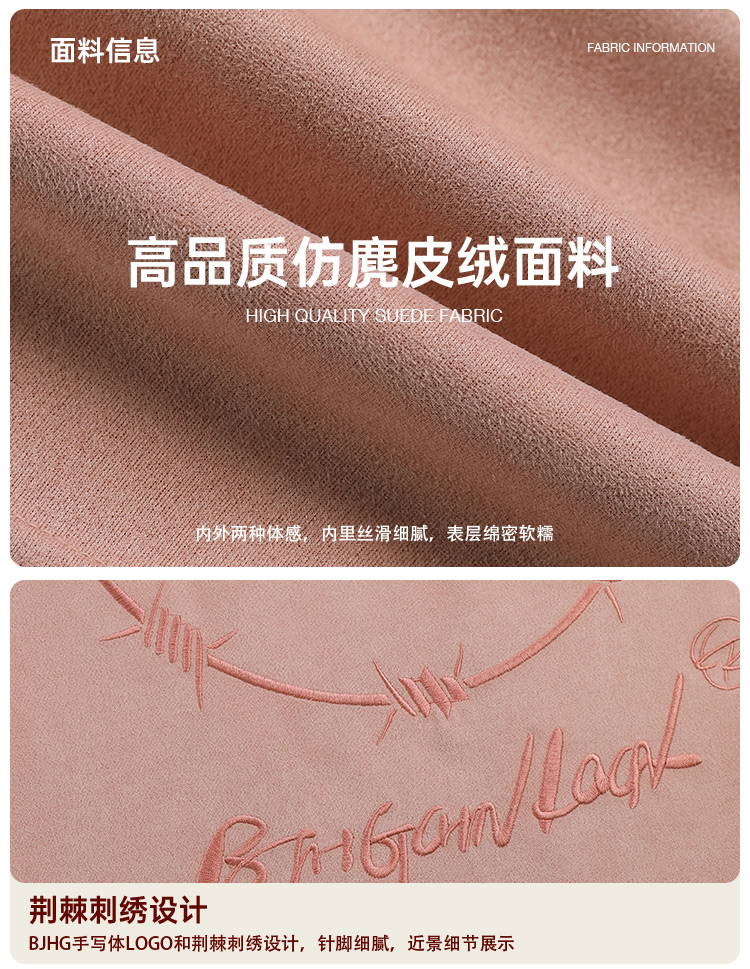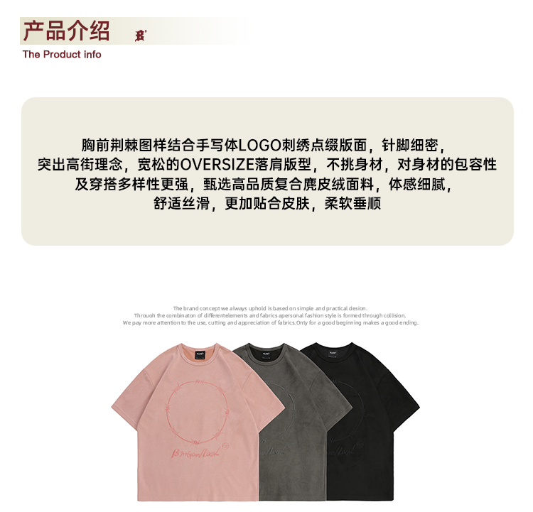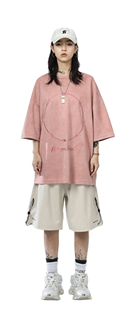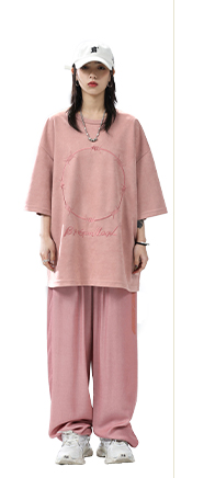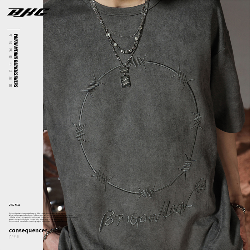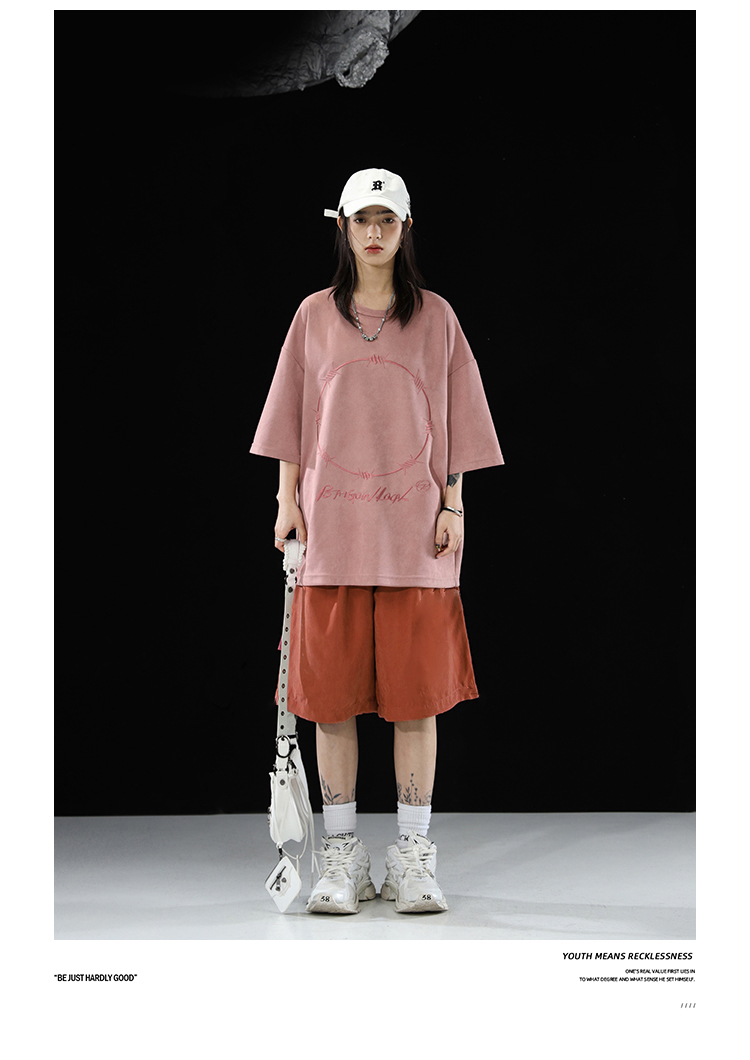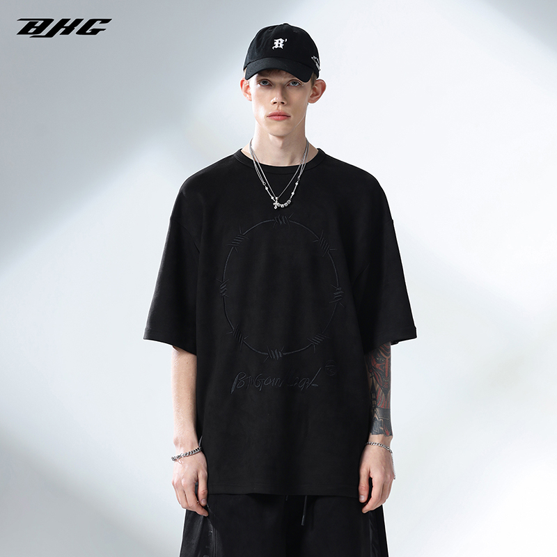 BJHG2023新款夏粉色麂皮短袖T恤男女美式OVERSIZE情侶半截袖上衣