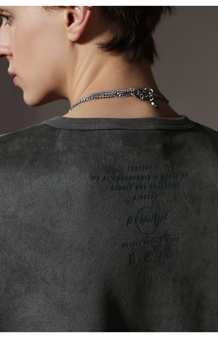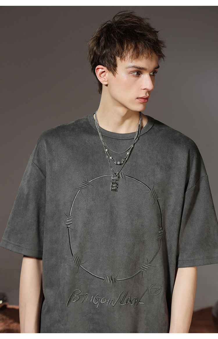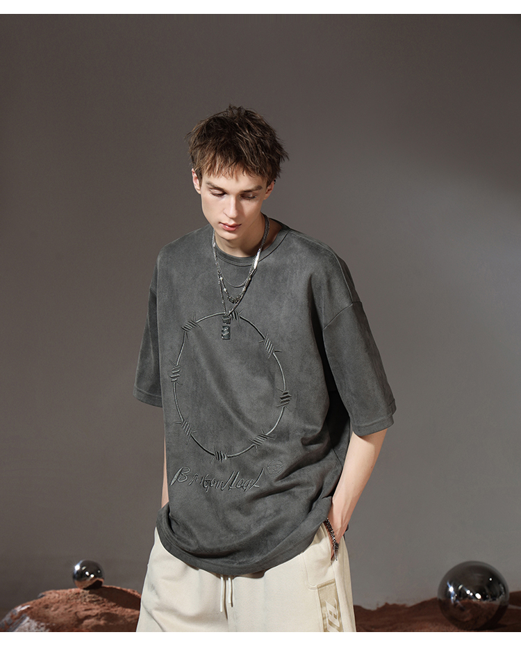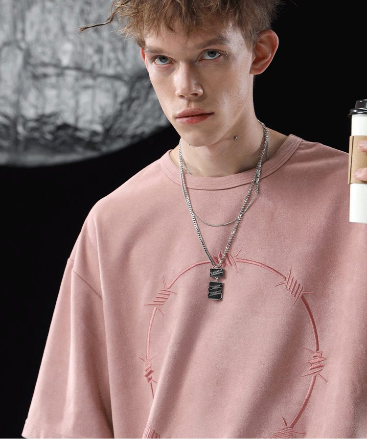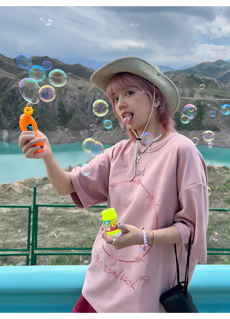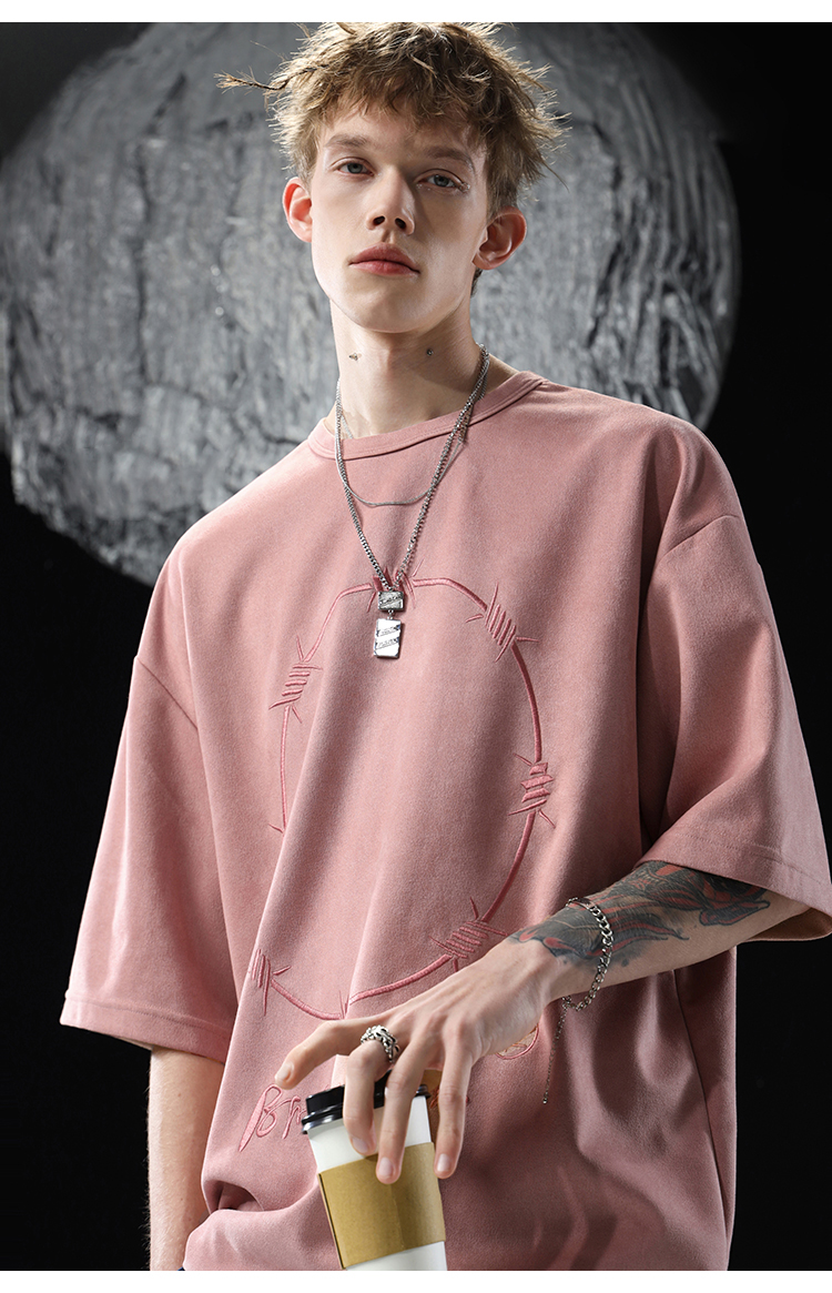 BJHG2023新款夏粉色麂皮短袖T恤男女美式OVERSIZE情侶半截袖上衣
