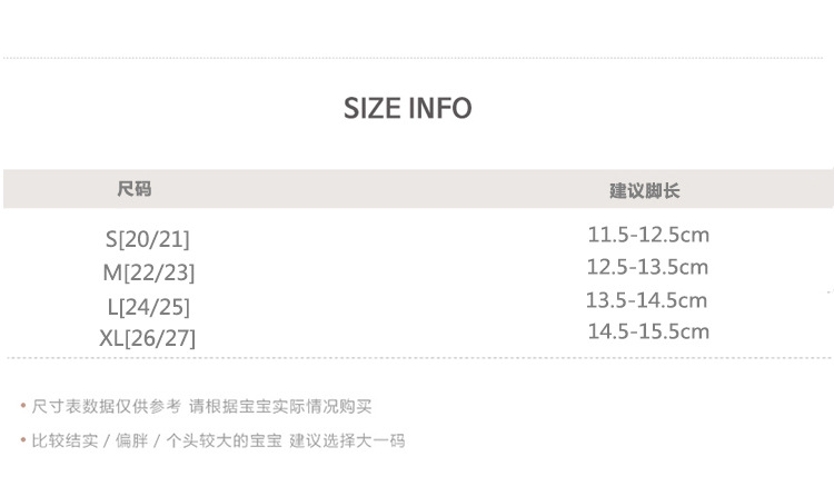 童袜尺码 20-21【脚长11.5cm-12.5cm】,22-23【脚长12.5cm-13.5cm】,24-25【脚长13.5cm-14.5cm】,26-27【脚长14.5cm-15.5cm】