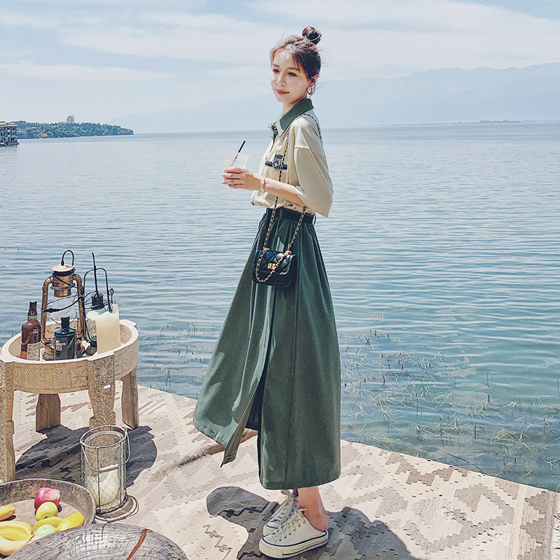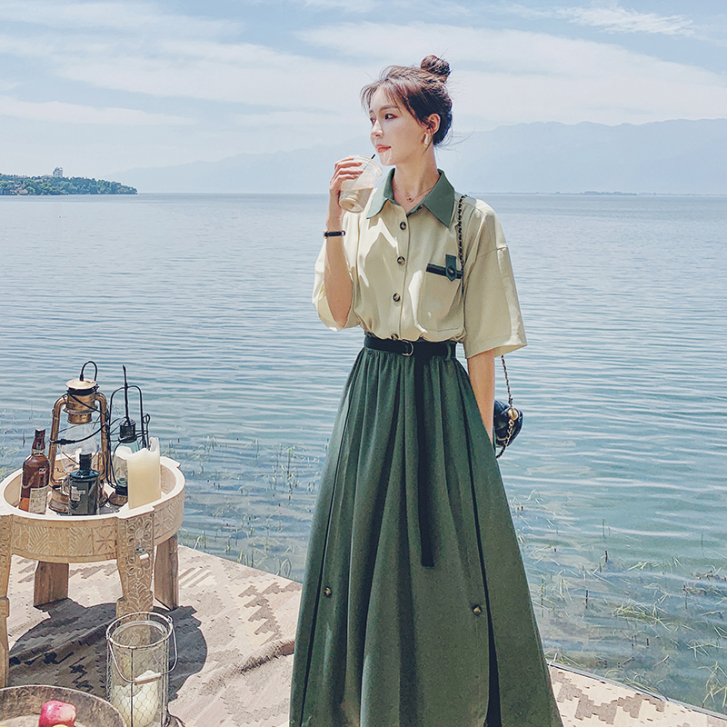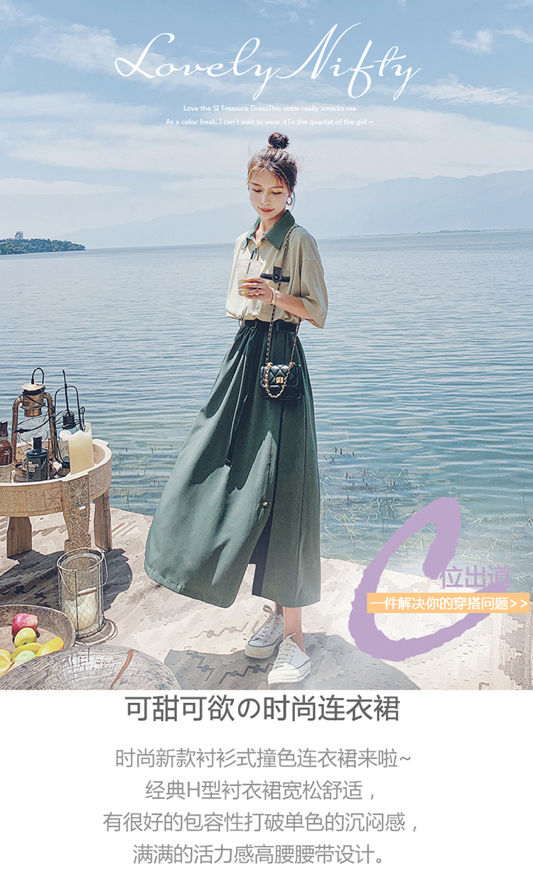 綠色洋裝女夏2023新款法式氣質設計感小眾撞色拼接及腳踝長裙子